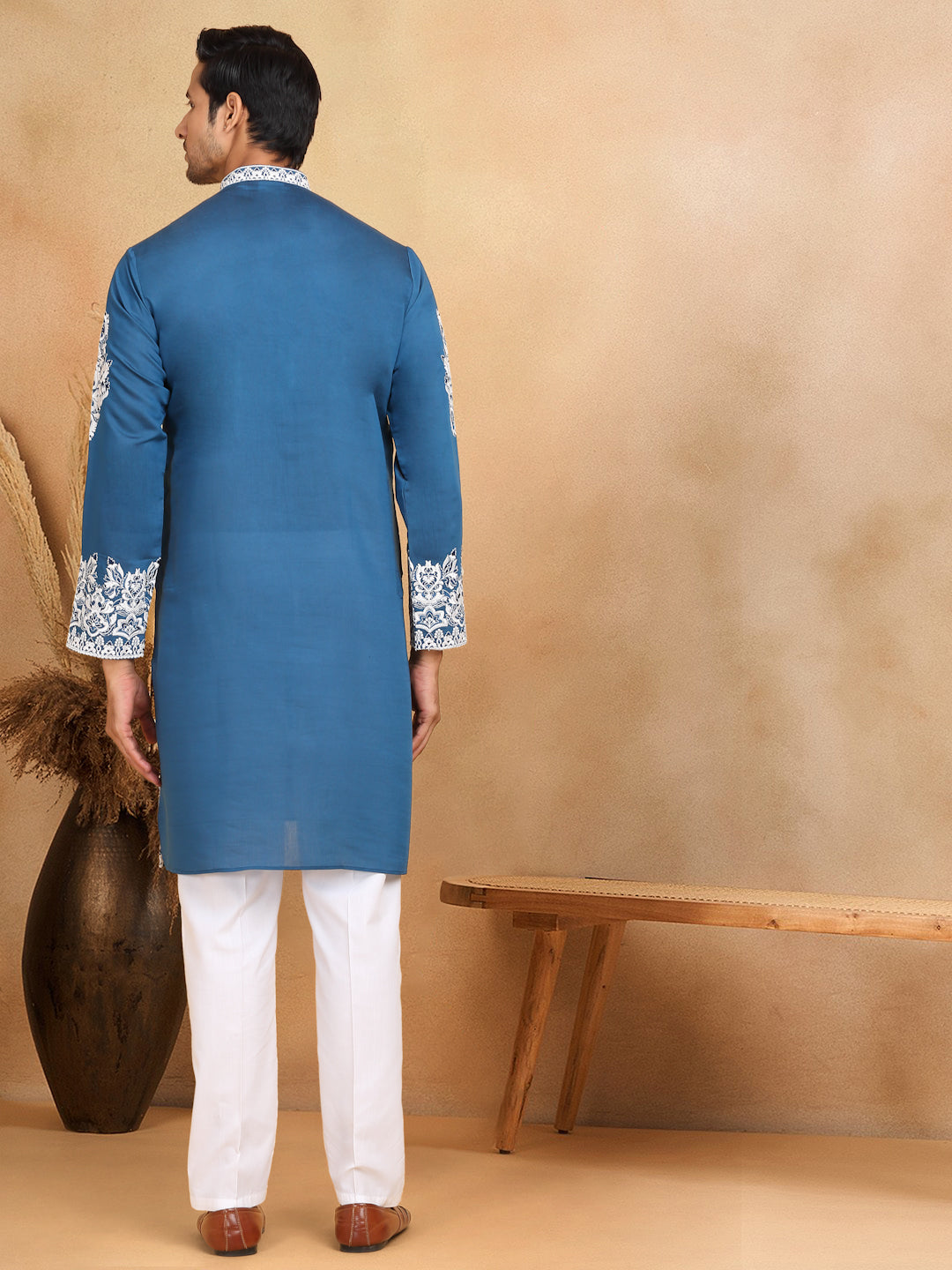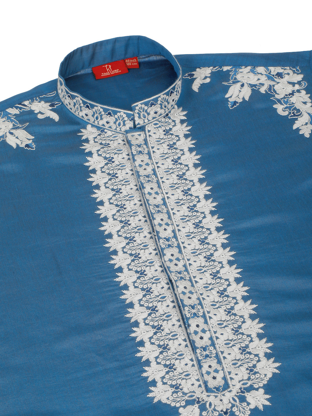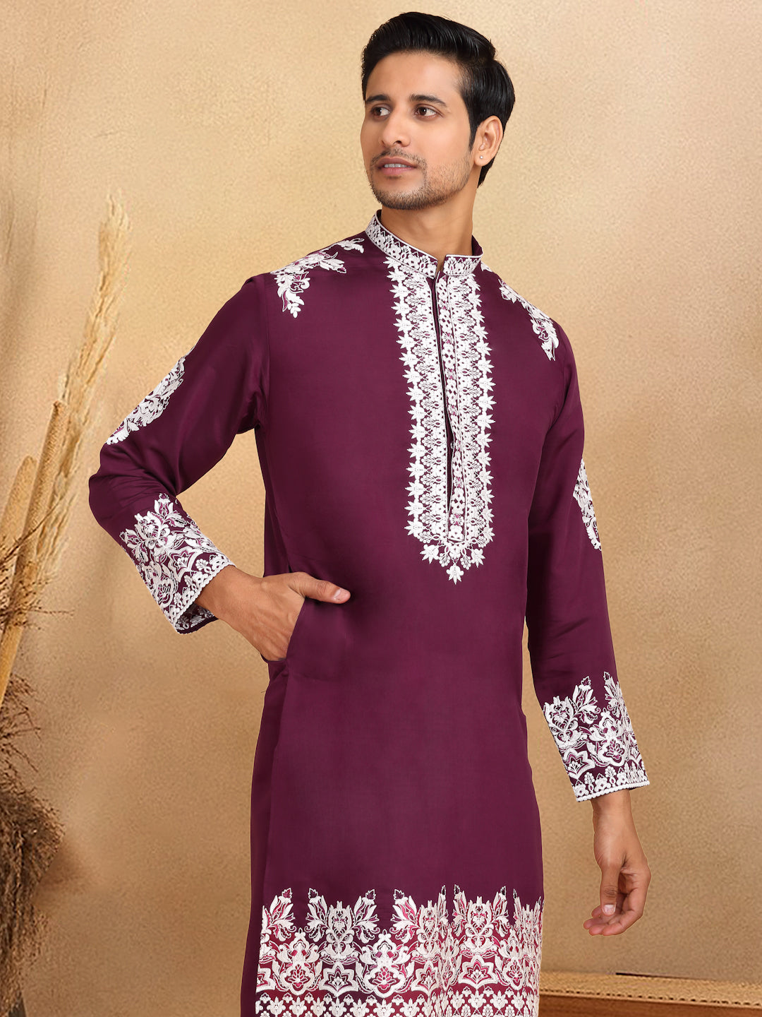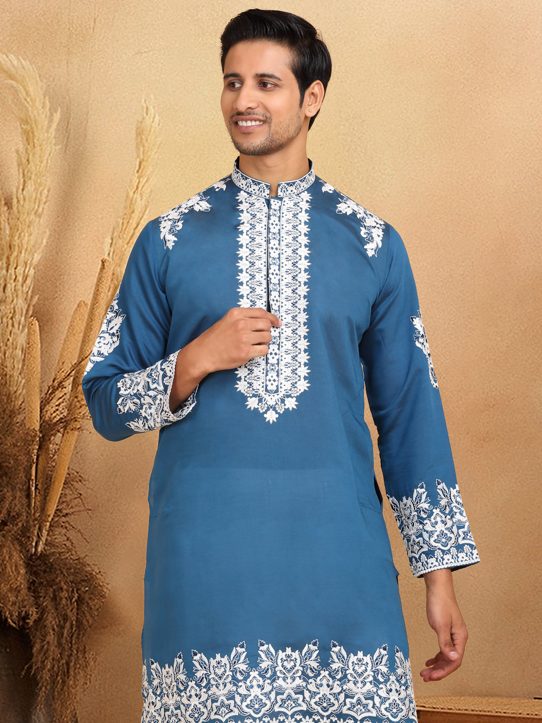 The Men's Cotton Silk Ethnic Motifs Kurta features a stunning white embroidered design and a mandarin collar, giving it a sophisticated and traditional look. The long sleeves and side pockets add practicality and convenience, while the use of cotton silk provides a luxurious feel. Perfect for any occasion.