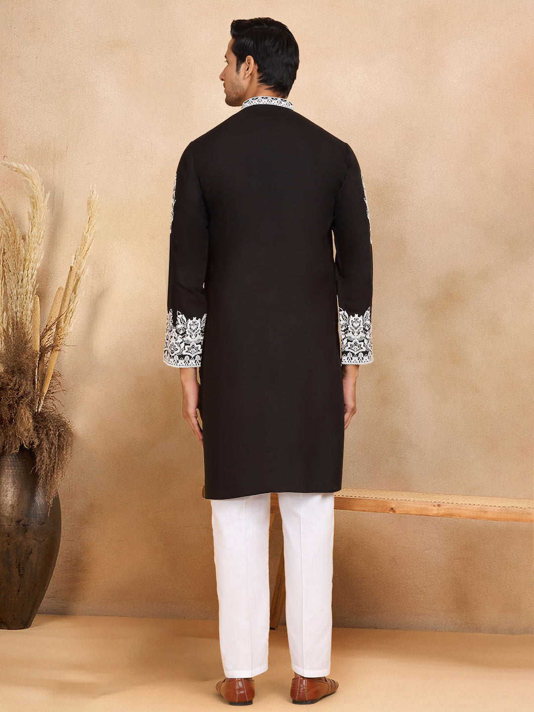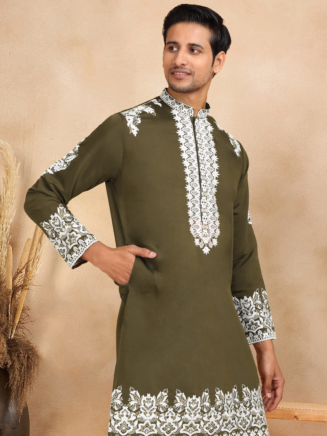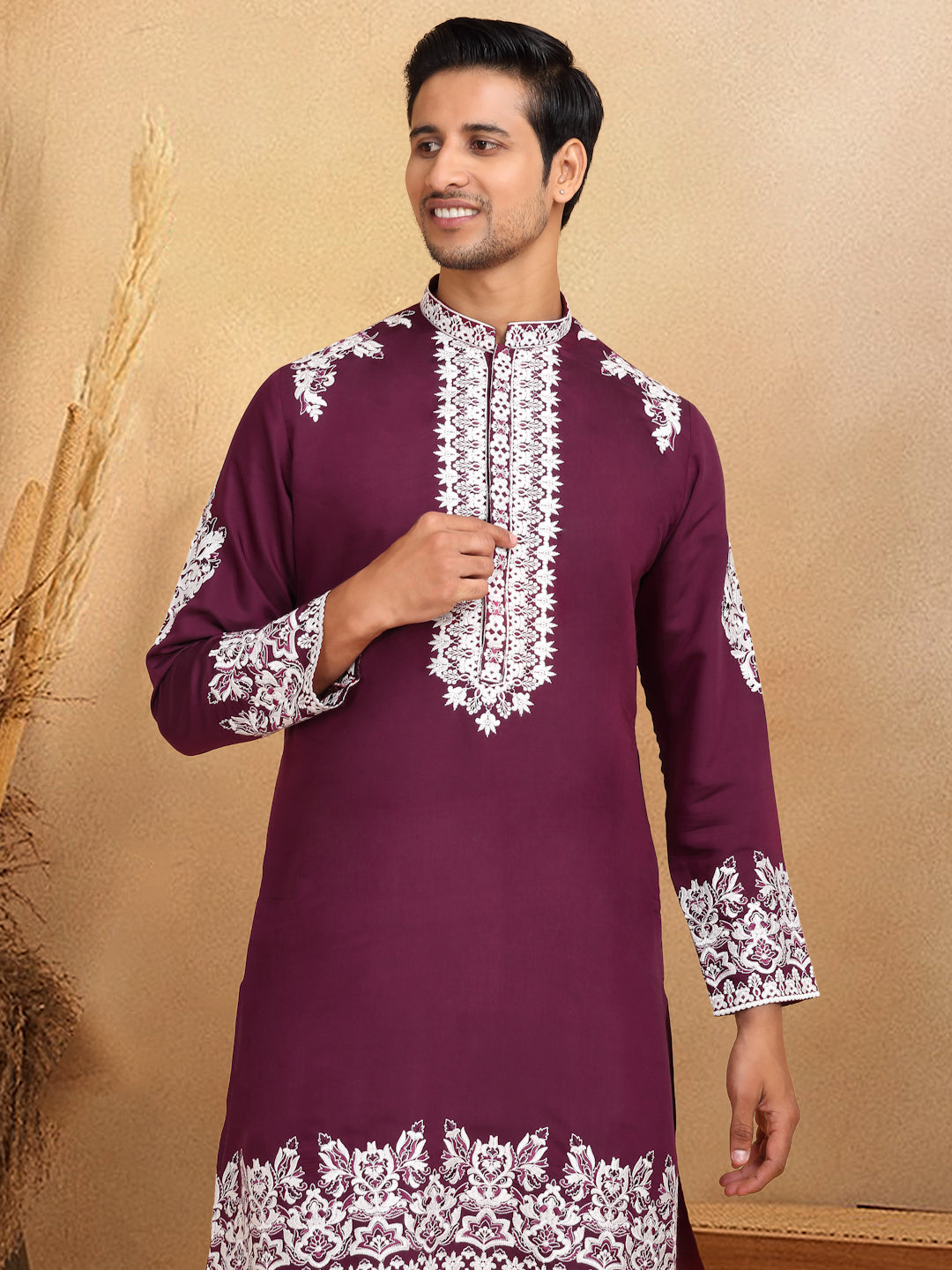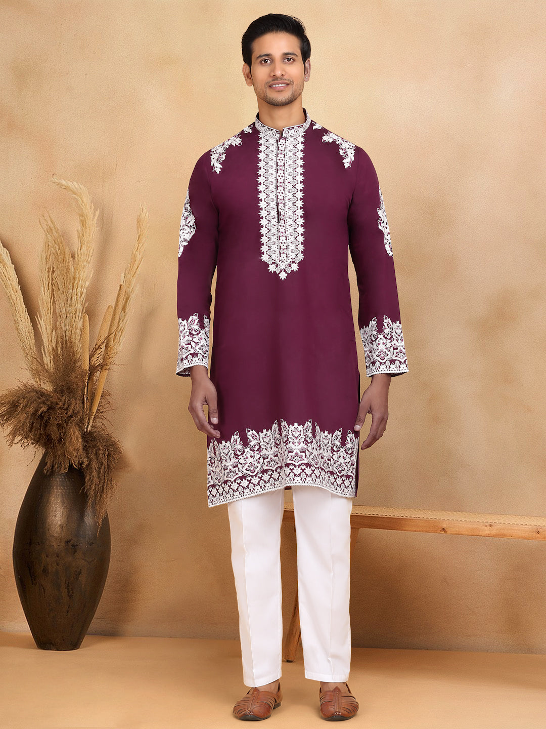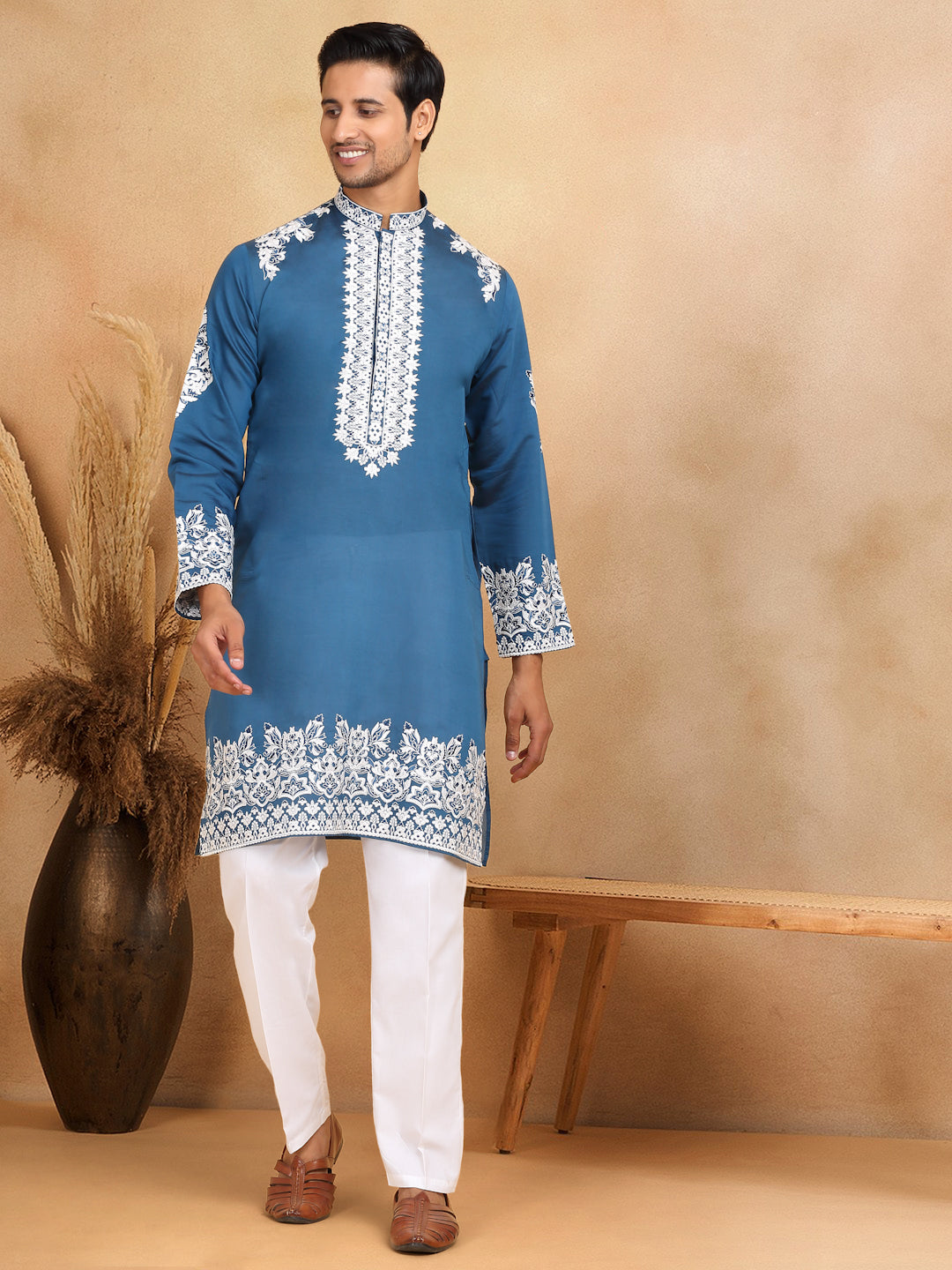 The Men's Cotton Silk Ethnic Motifs Kurta features a stunning white embroidered design and a mandarin collar, giving it a sophisticated and traditional look. The long sleeves and side pockets add practicality and convenience, while the use of cotton silk provides a luxurious feel. Perfect for any occasion.