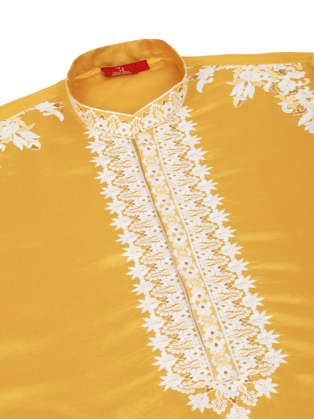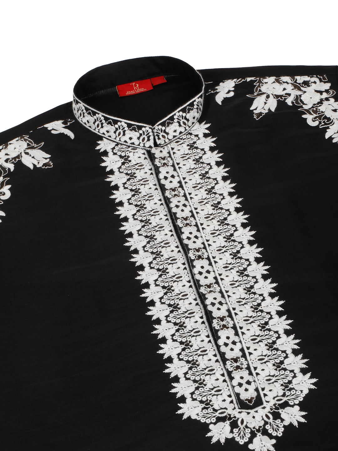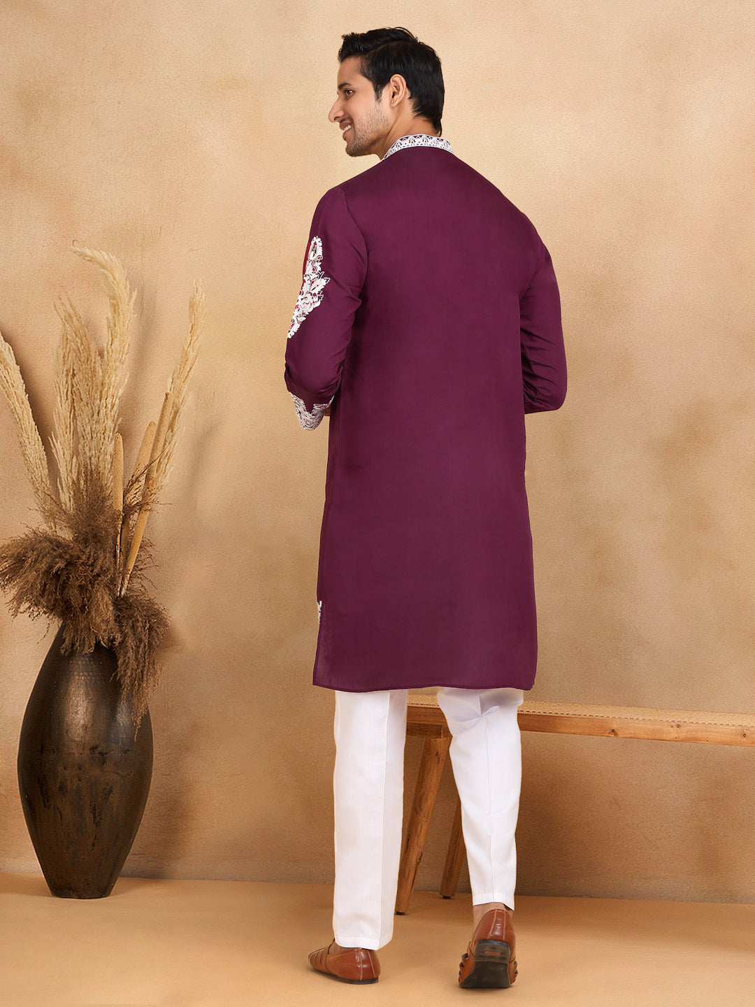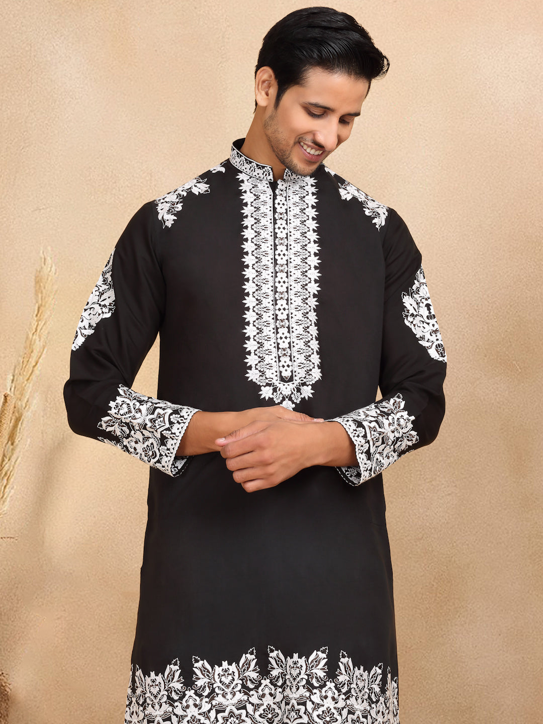The Men's Cotton Silk Ethnic Motifs Kurta features a stunning white embroidered design and a mandarin collar, giving it a sophisticated and traditional look. The long sleeves and side pockets add practicality and convenience, while the use of cotton silk provides a luxurious feel. Perfect for any occasion.
