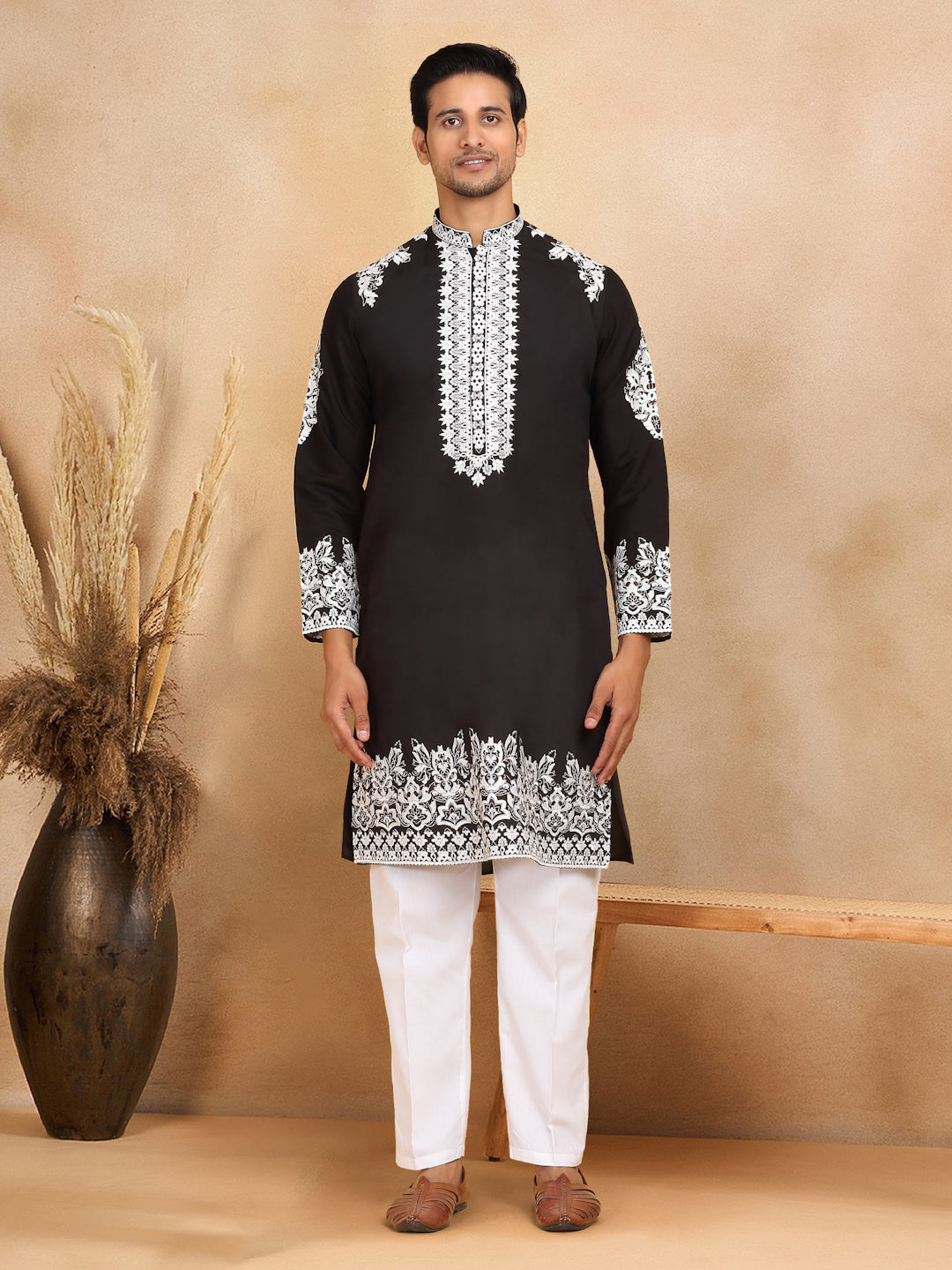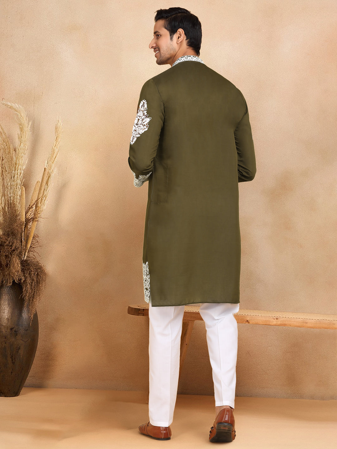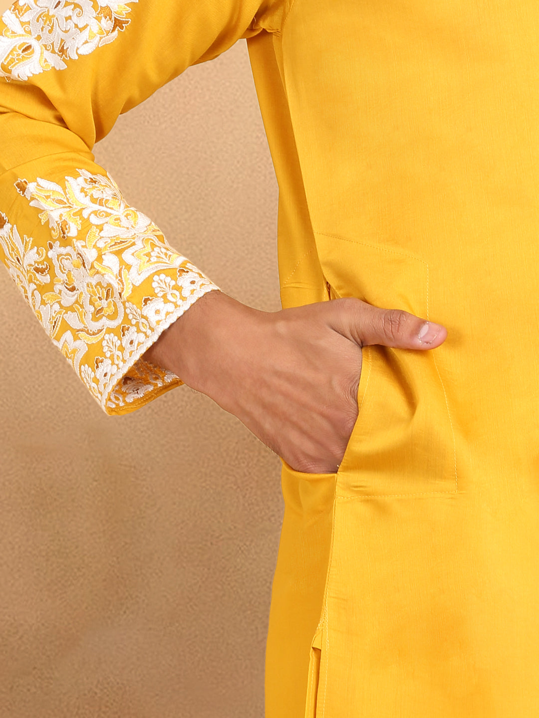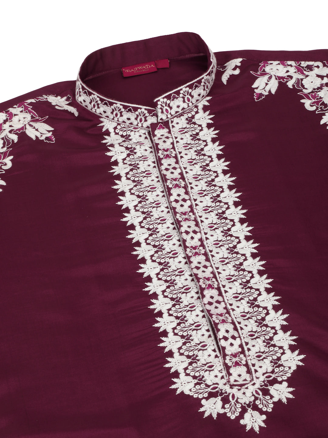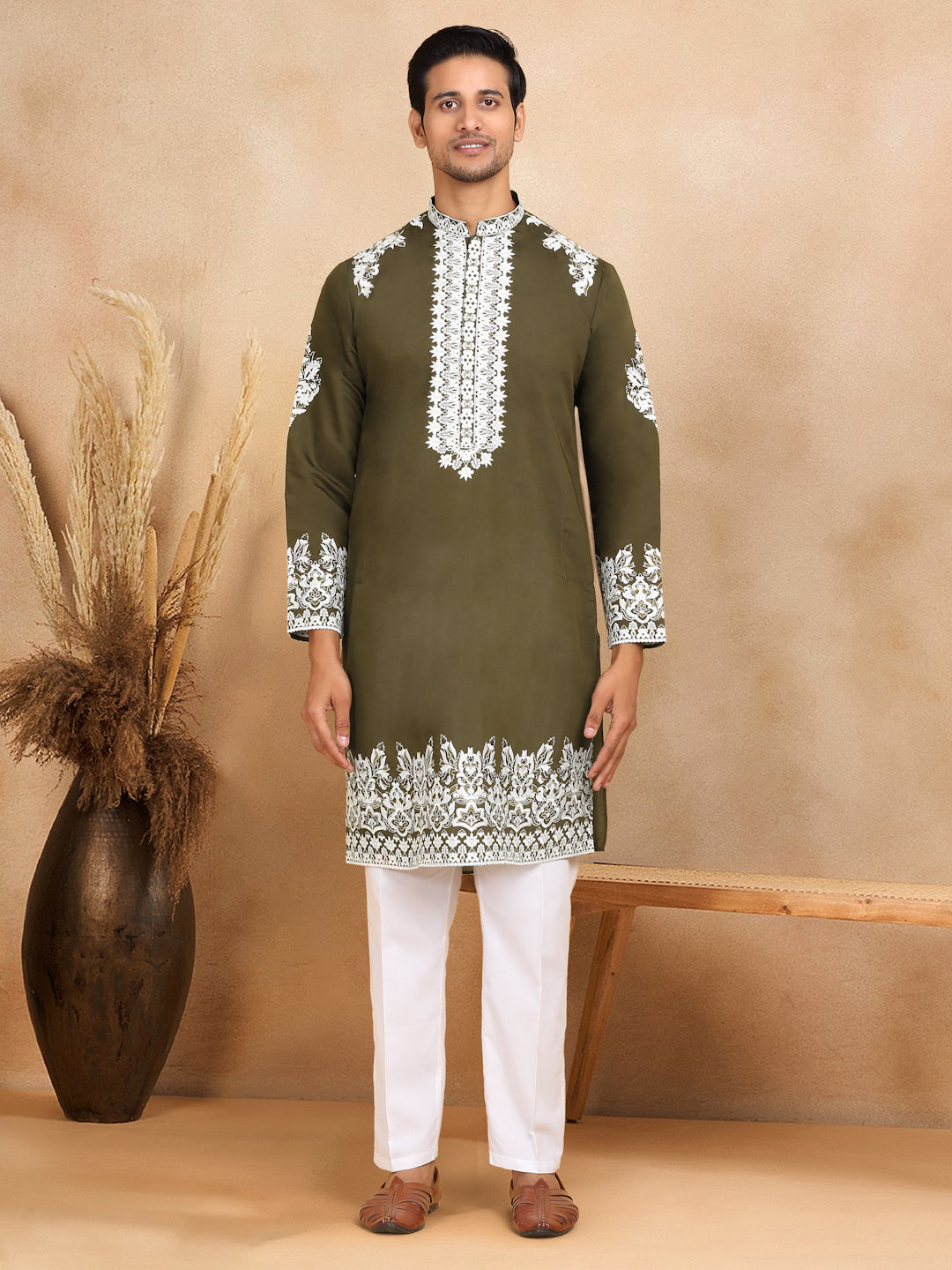 The Men's Cotton Silk Ethnic Motifs Kurta features a stunning white embroidered design and a mandarin collar, giving it a sophisticated and traditional look. The long sleeves and side pockets add practicality and convenience, while the use of cotton silk provides a luxurious feel. Perfect for any occasion.