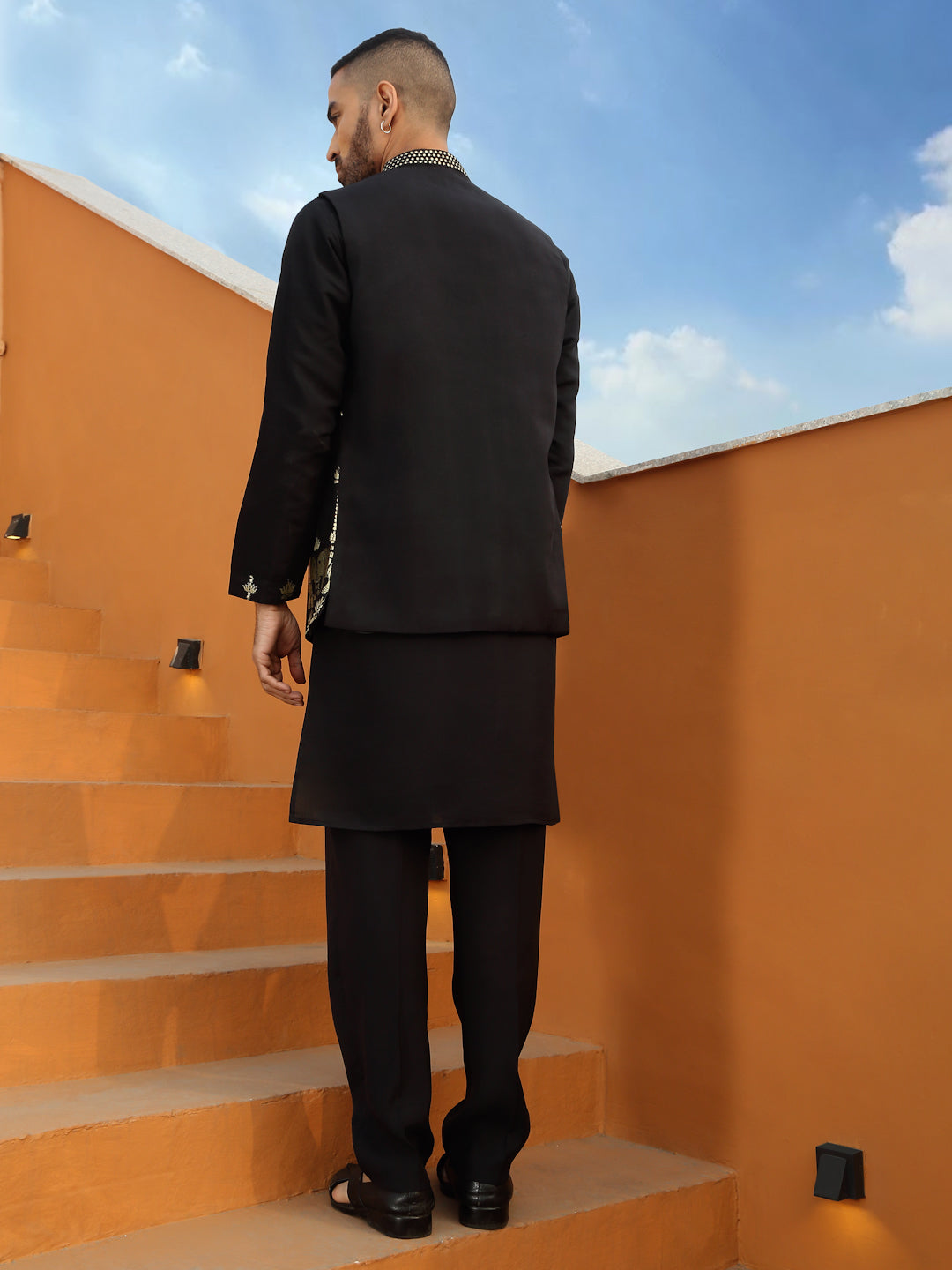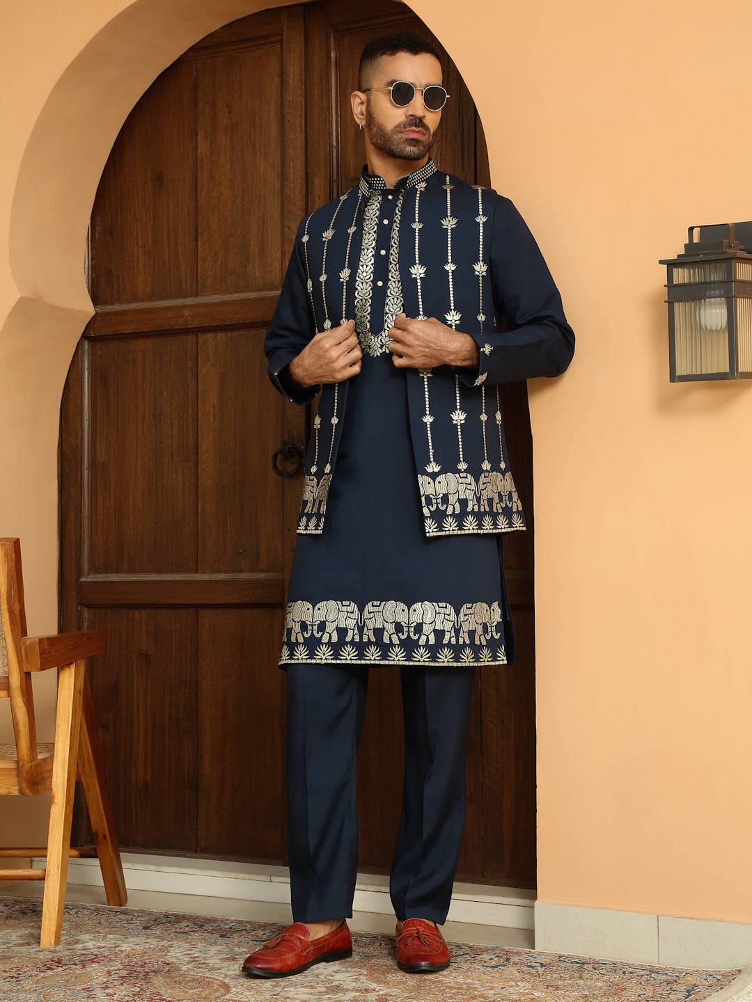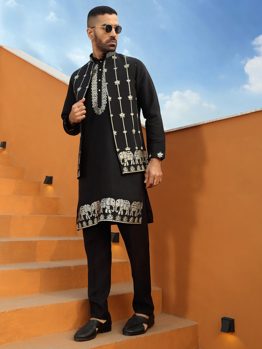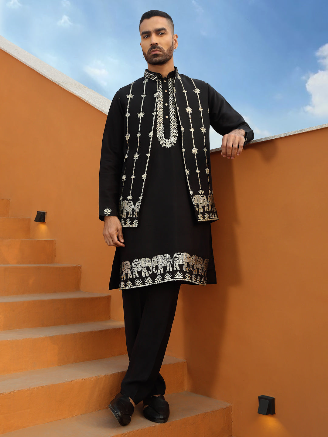 Step into elegance with this premium three-piece ethnic set. Crafted for sophistication, this set combines style, tradition, and comfort Knee-length cotton silk kurta with zari-embroidered ethnic motifs, mandarin collar, button-down closure, side pockets, and a straight hem for a polished look. Black cotton silk trousers with a slim fit, designed for all-day comfort and ease of movement. Front-open embroidered Nehru jacket featuring intricate zari work and ethnic motifs, adding a regal touch to the ensemble. Perfect for weddings, festive occasions, or celebrations, this versatile set ensures you stand out with timeless charm and sophistication. Pair it with traditional footwear for a complete look!