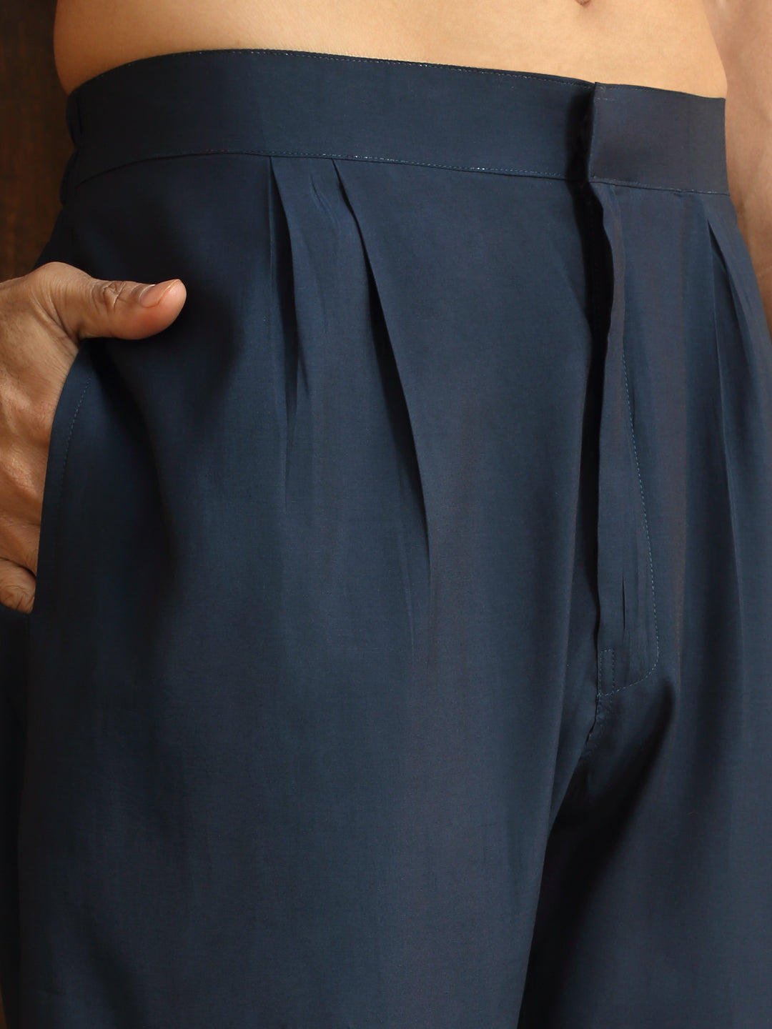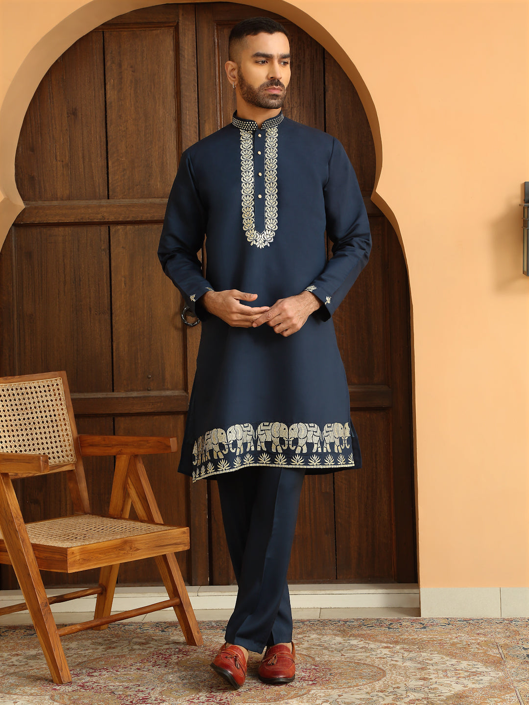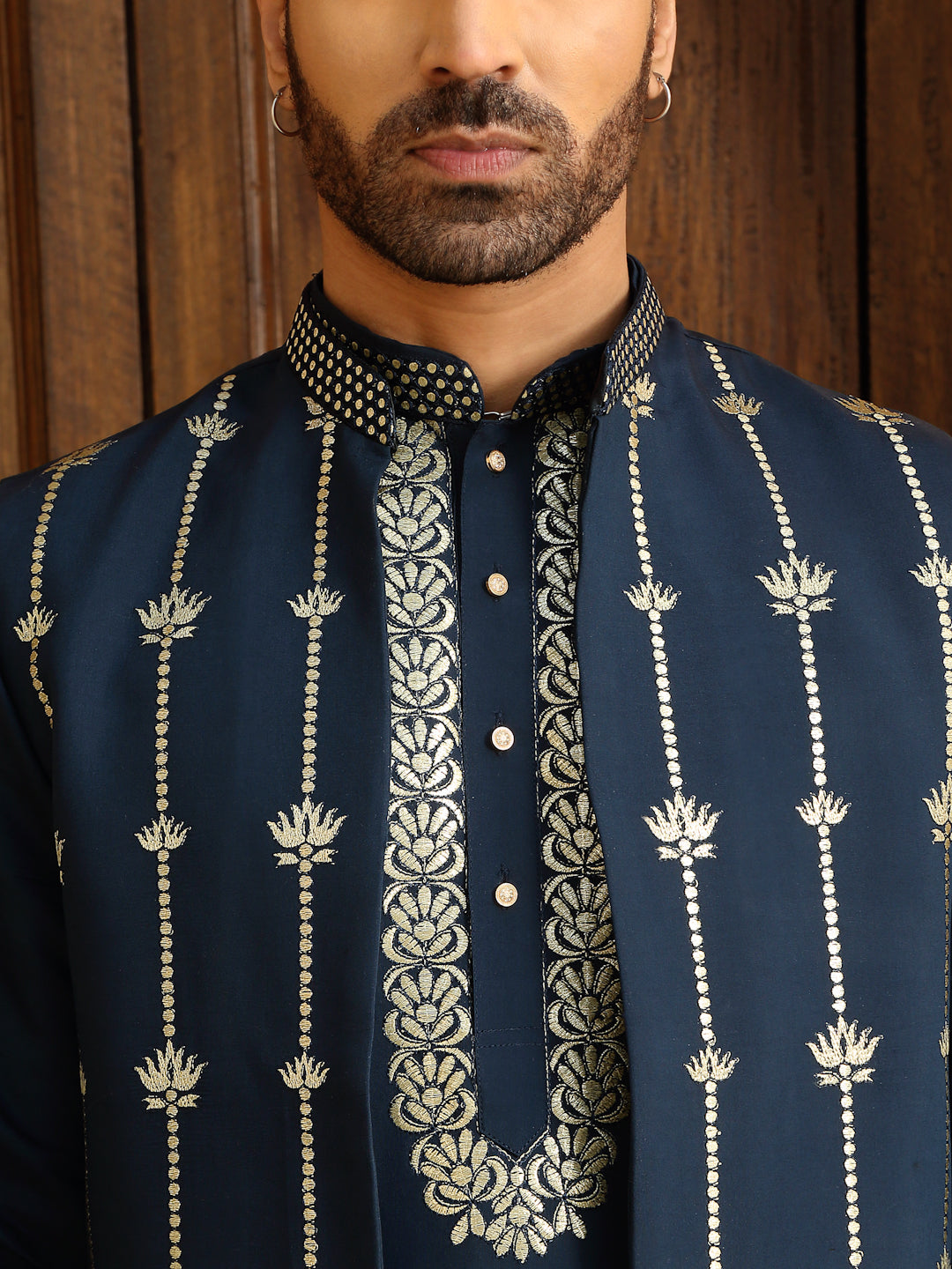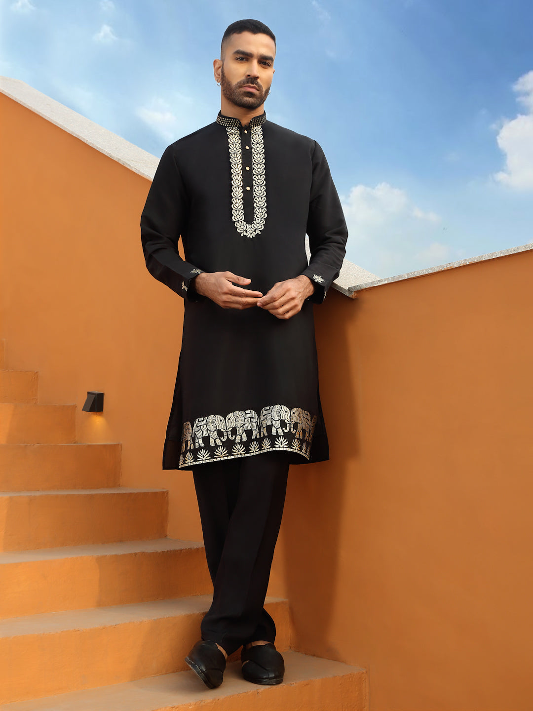 Step into elegance with this premium three-piece ethnic set. Crafted for sophistication, this set combines style, tradition, and comfort Knee-length cotton silk kurta with zari-embroidered ethnic motifs, mandarin collar, button-down closure, side pockets, and a straight hem for a polished look. Black cotton silk trousers with a slim fit, designed for all-day comfort and ease of movement. Front-open embroidered Nehru jacket featuring intricate zari work and ethnic motifs, adding a regal touch to the ensemble. Perfect for weddings, festive occasions, or celebrations, this versatile set ensures you stand out with timeless charm and sophistication. Pair it with traditional footwear for a complete look!
