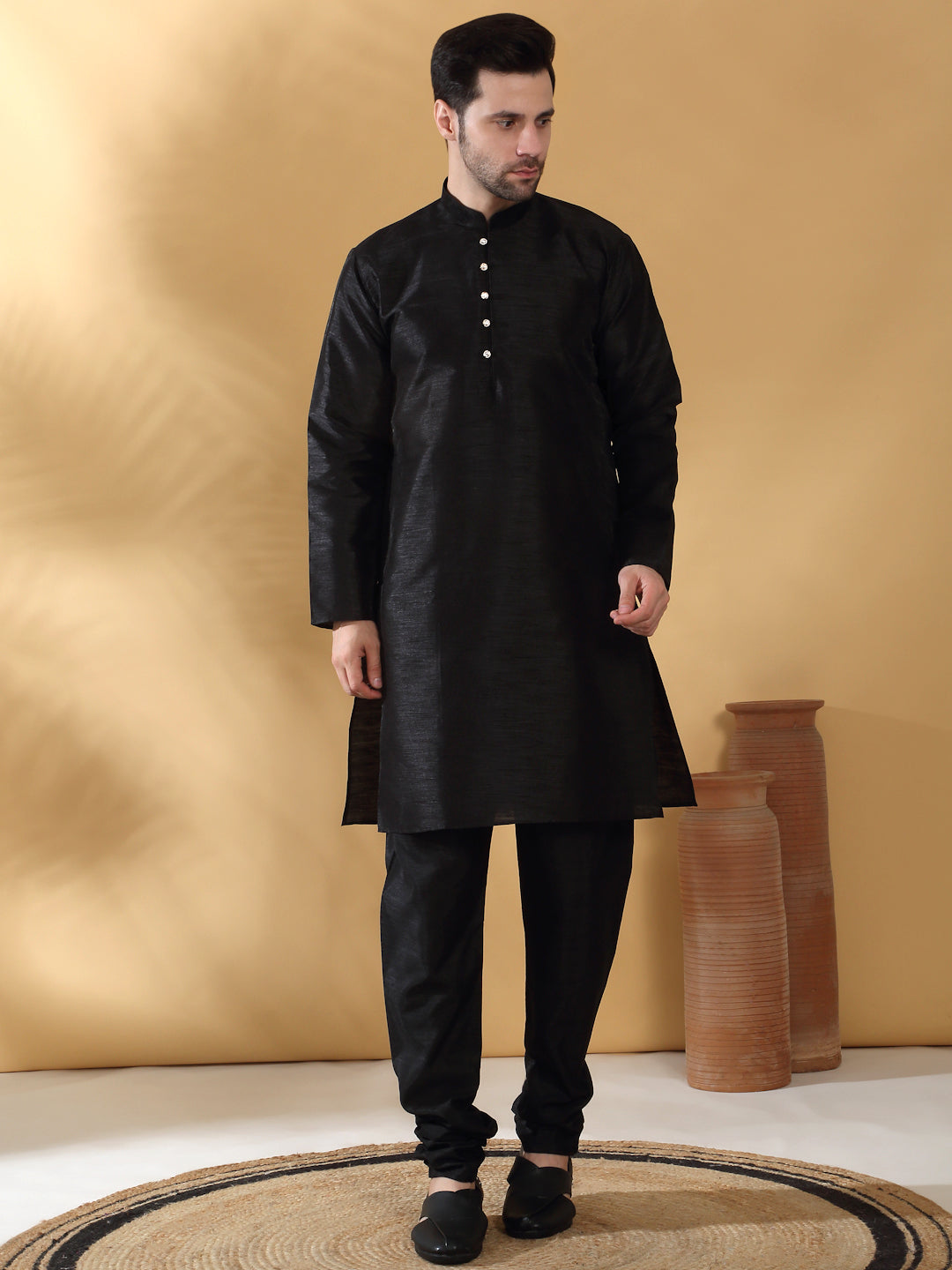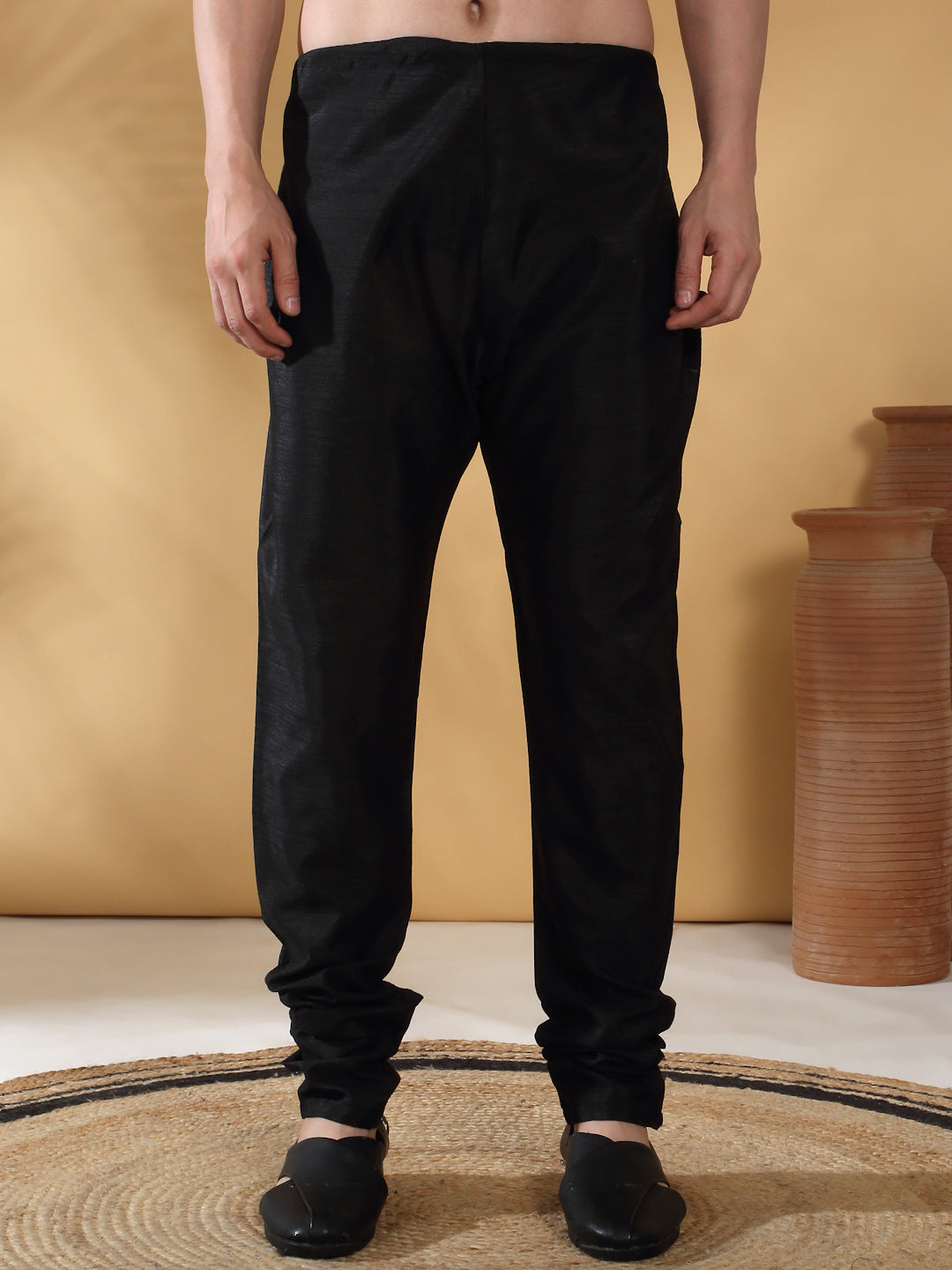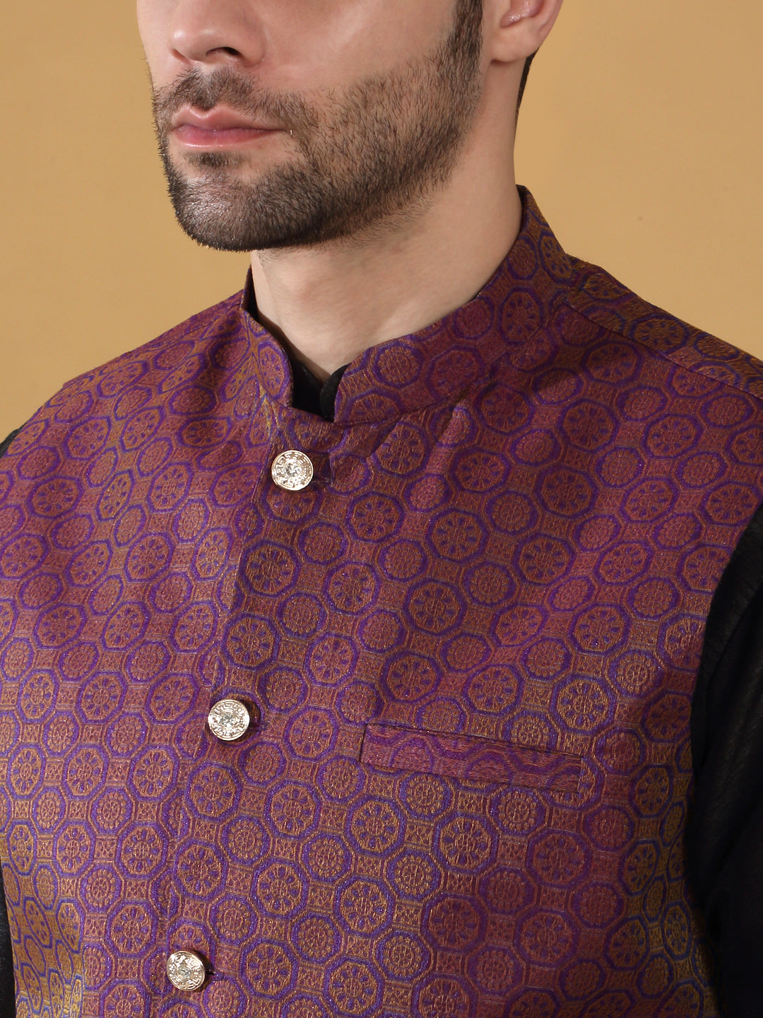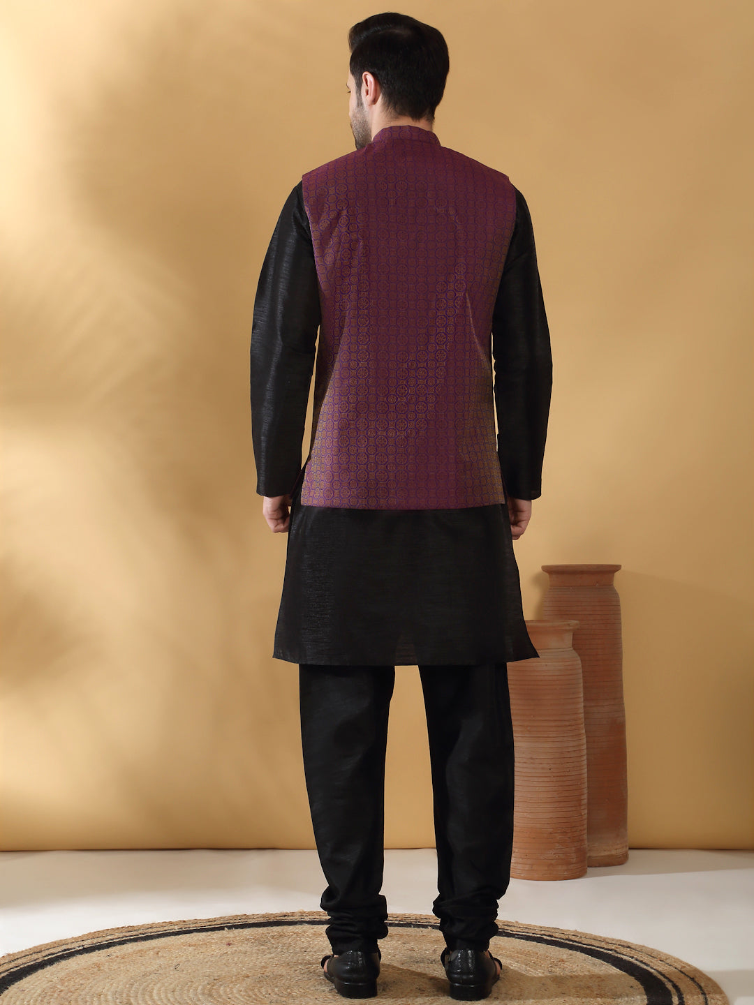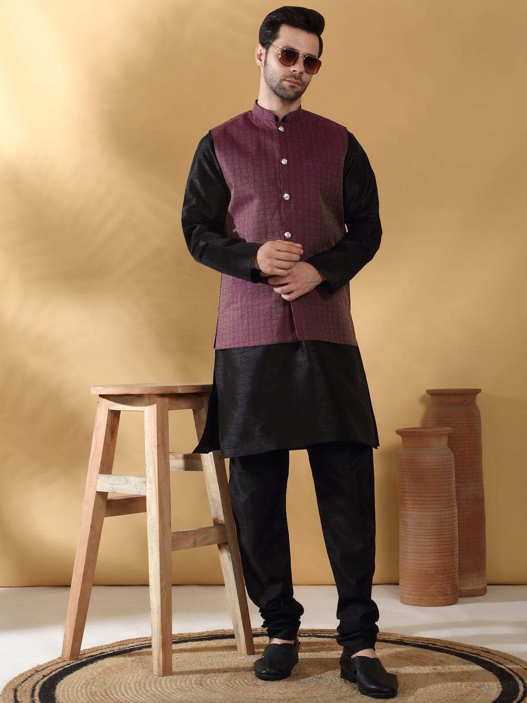 Black Silk Blend Kurta churidar with Jacquard Geometric Sleeveless Nehru Jacket set