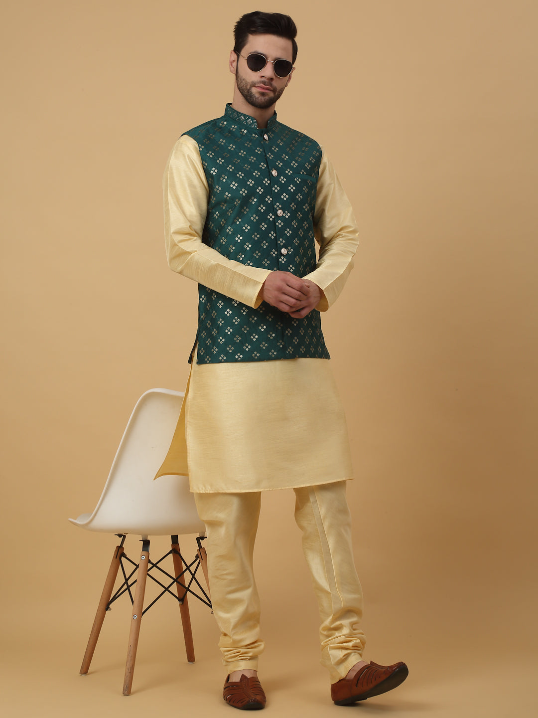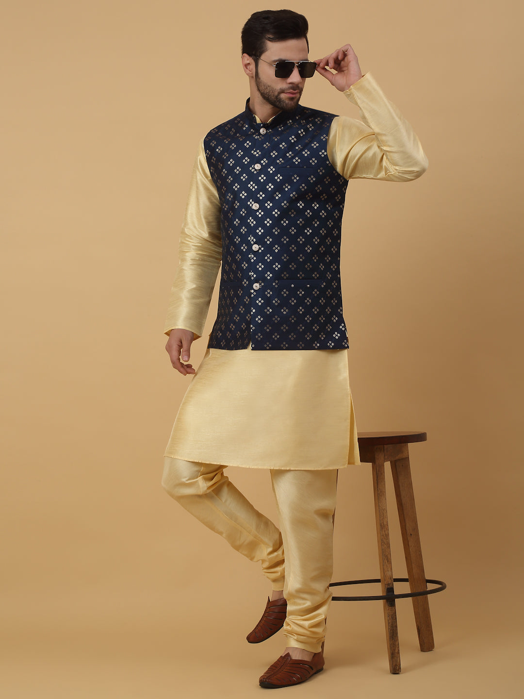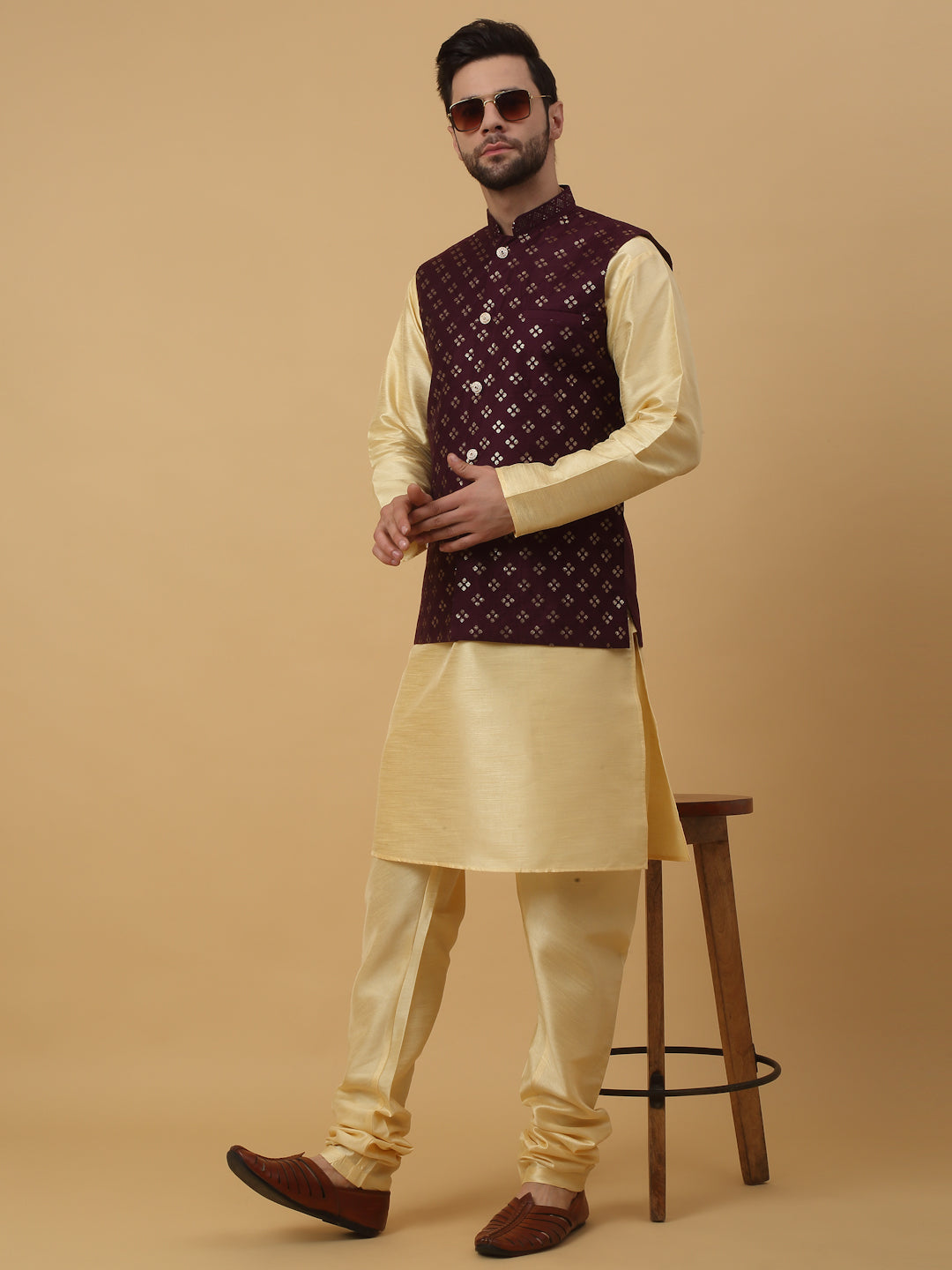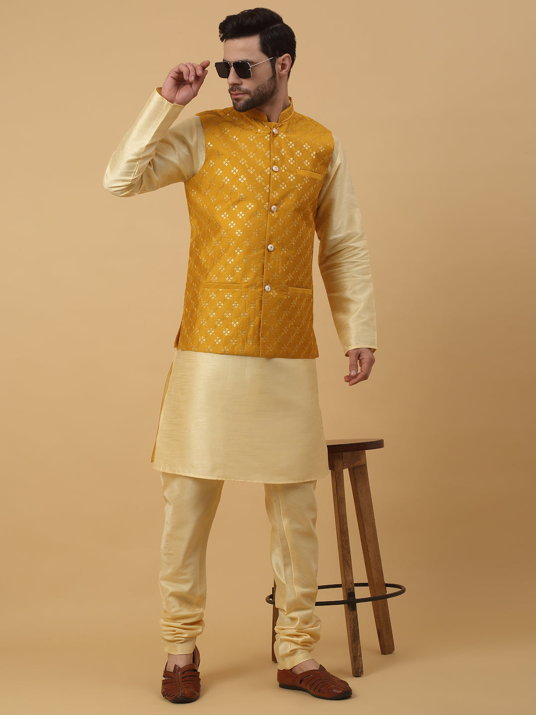 KRAFT INDIA Men's Silk Blend Beige Kurta, Churidar with Cotton Silk Embroided Sequenced Nehru Jacket Set