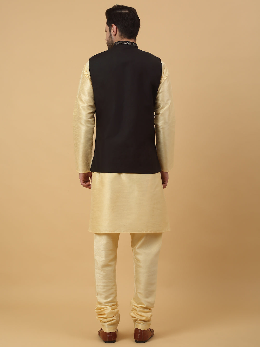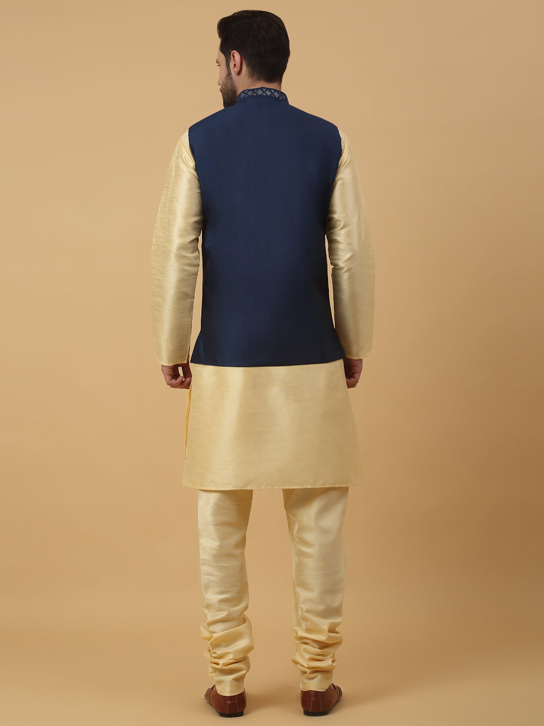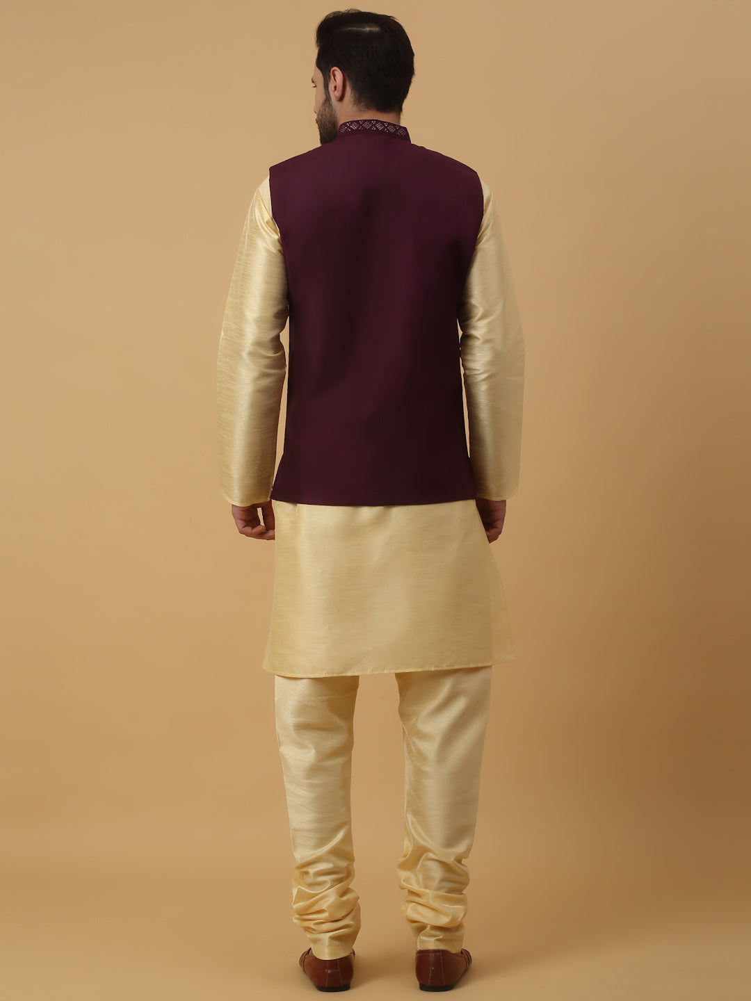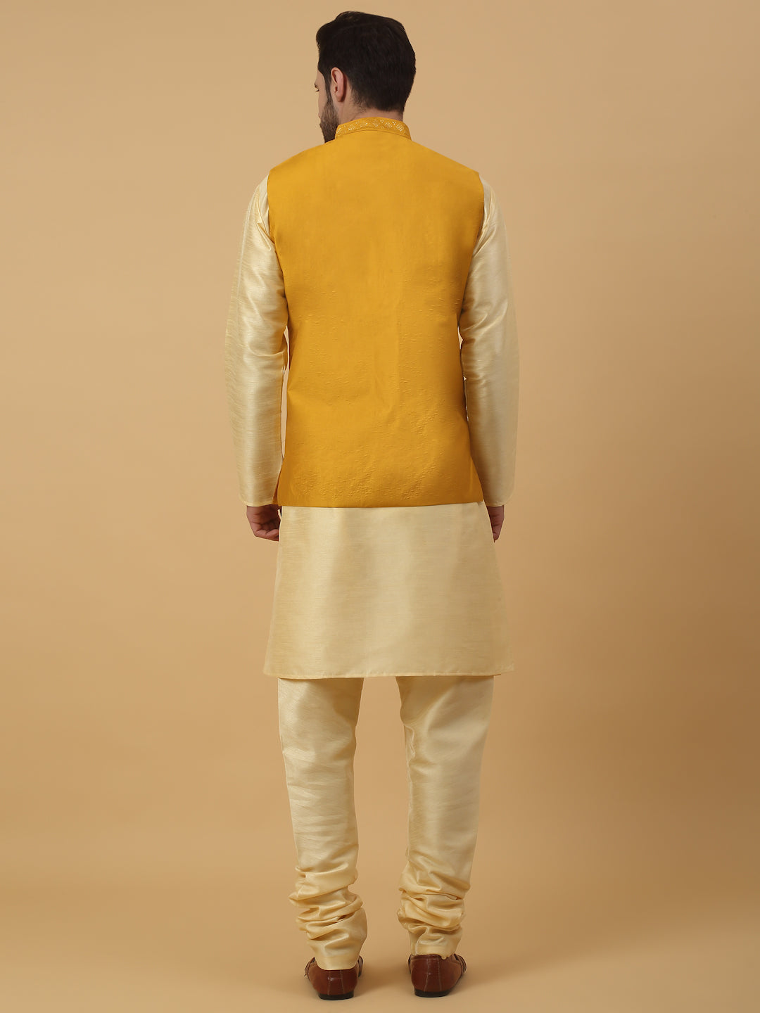KRAFT INDIA Men's Silk Blend Beige Kurta, Churidar with Cotton Silk Embroided Sequenced Nehru Jacket Set