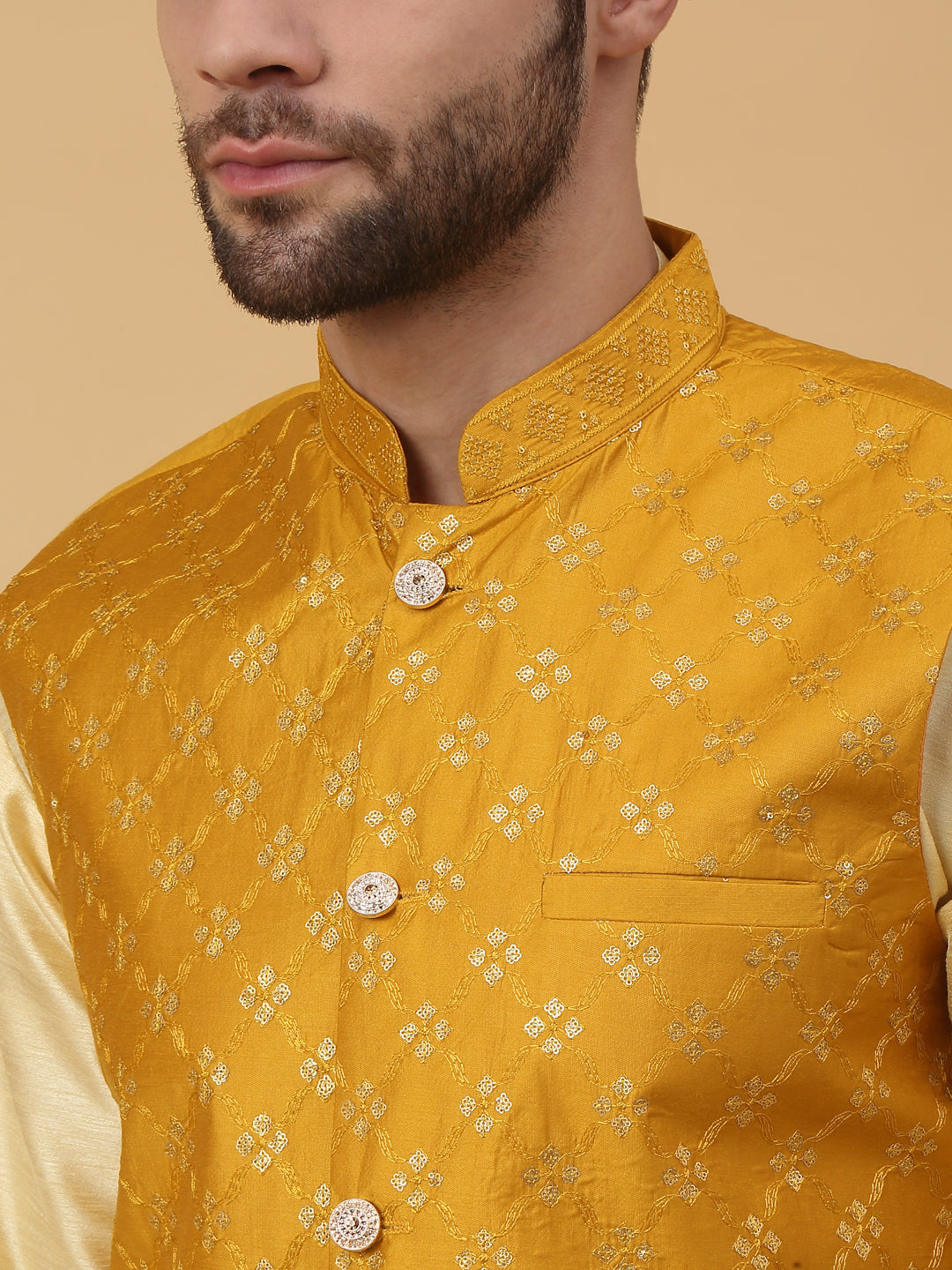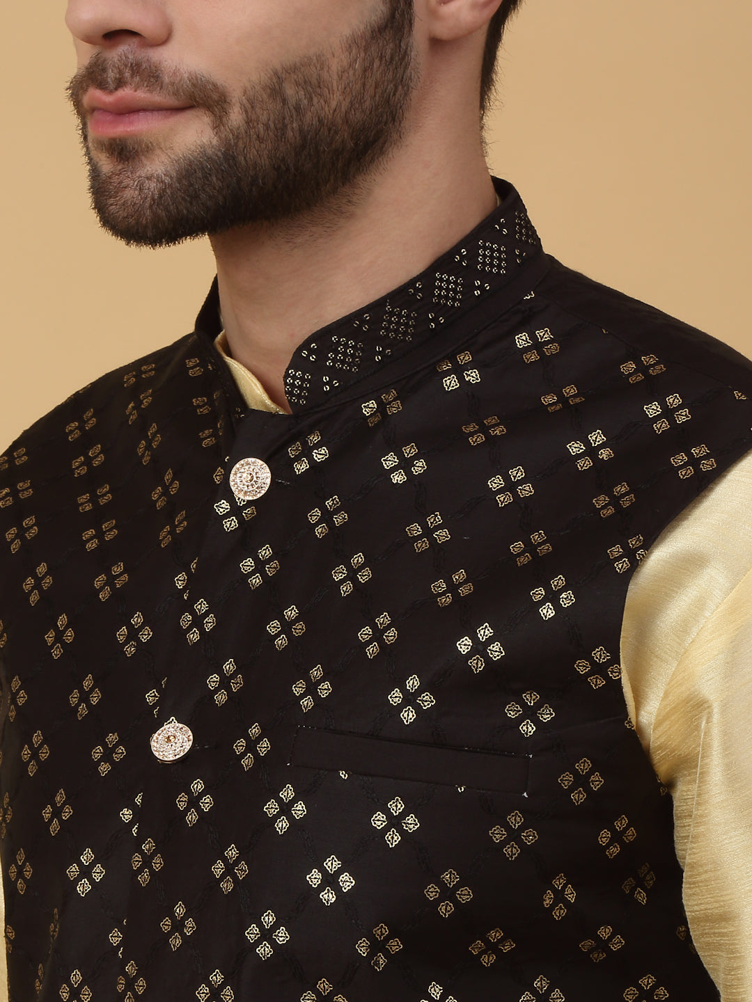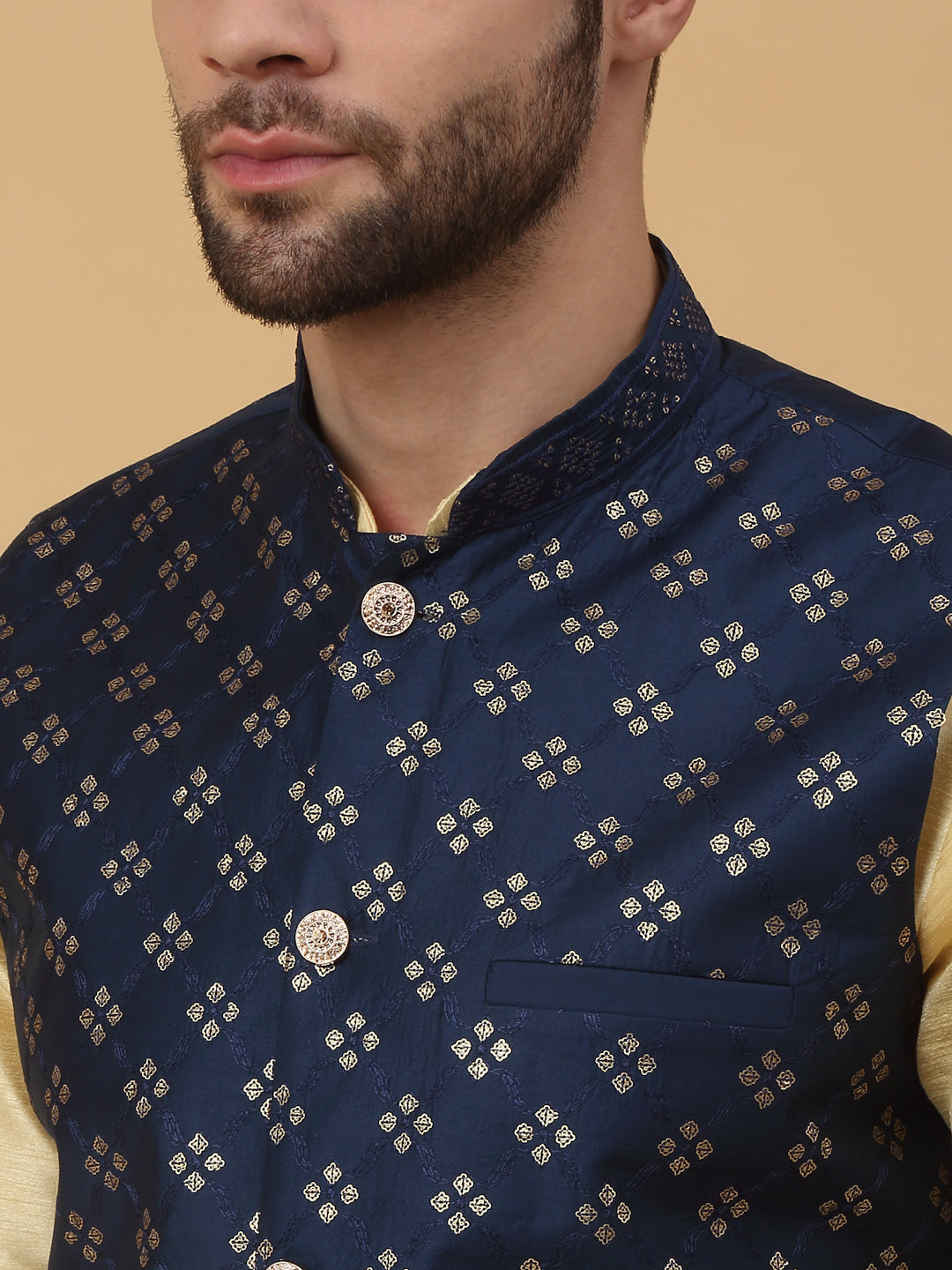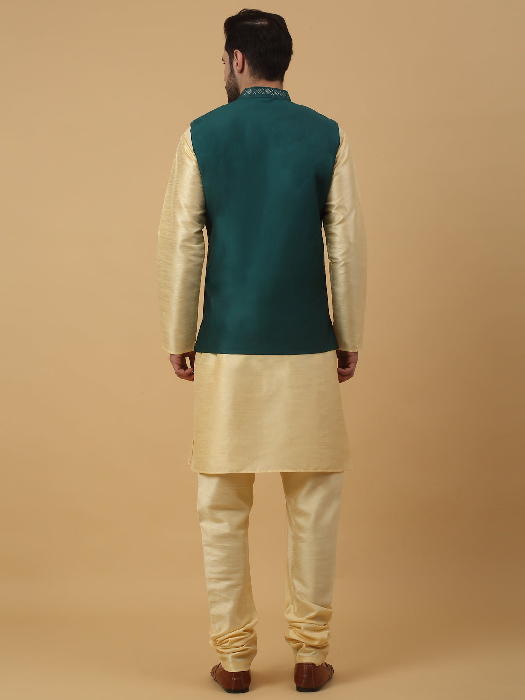 KRAFT INDIA Men's Silk Blend Beige Kurta, Churidar with Cotton Silk Embroided Sequenced Nehru Jacket Set