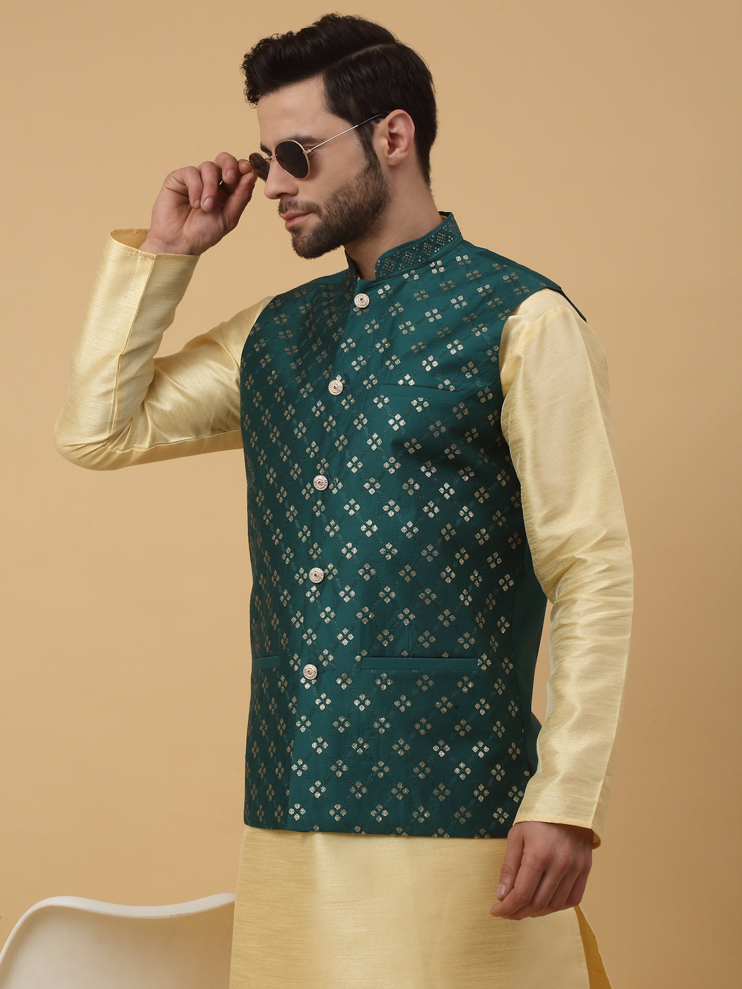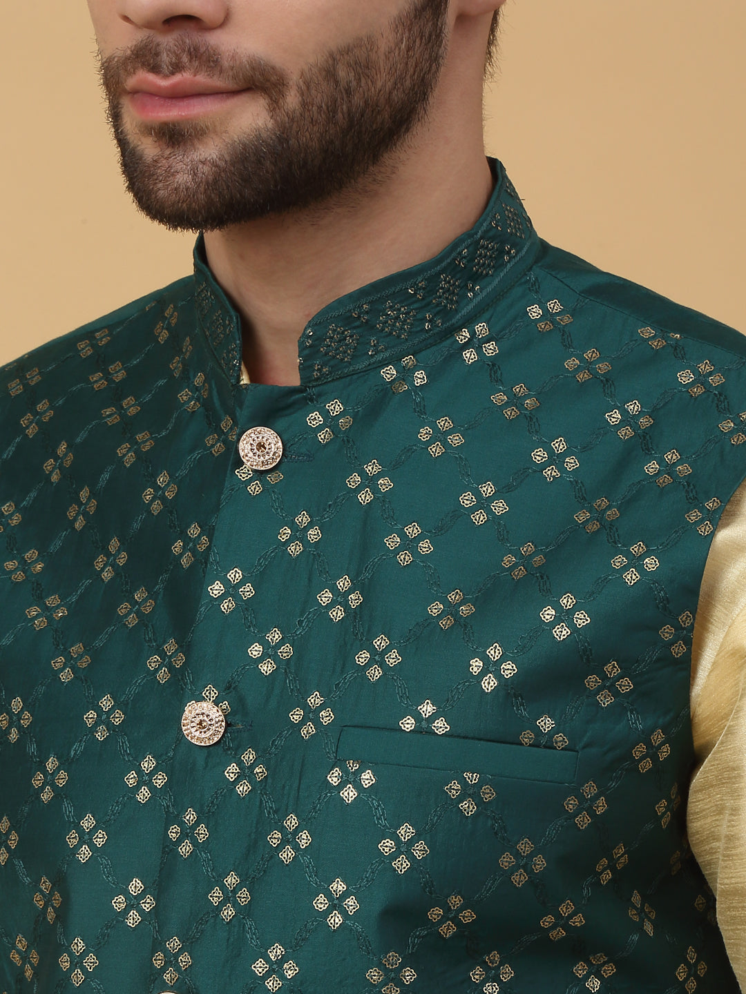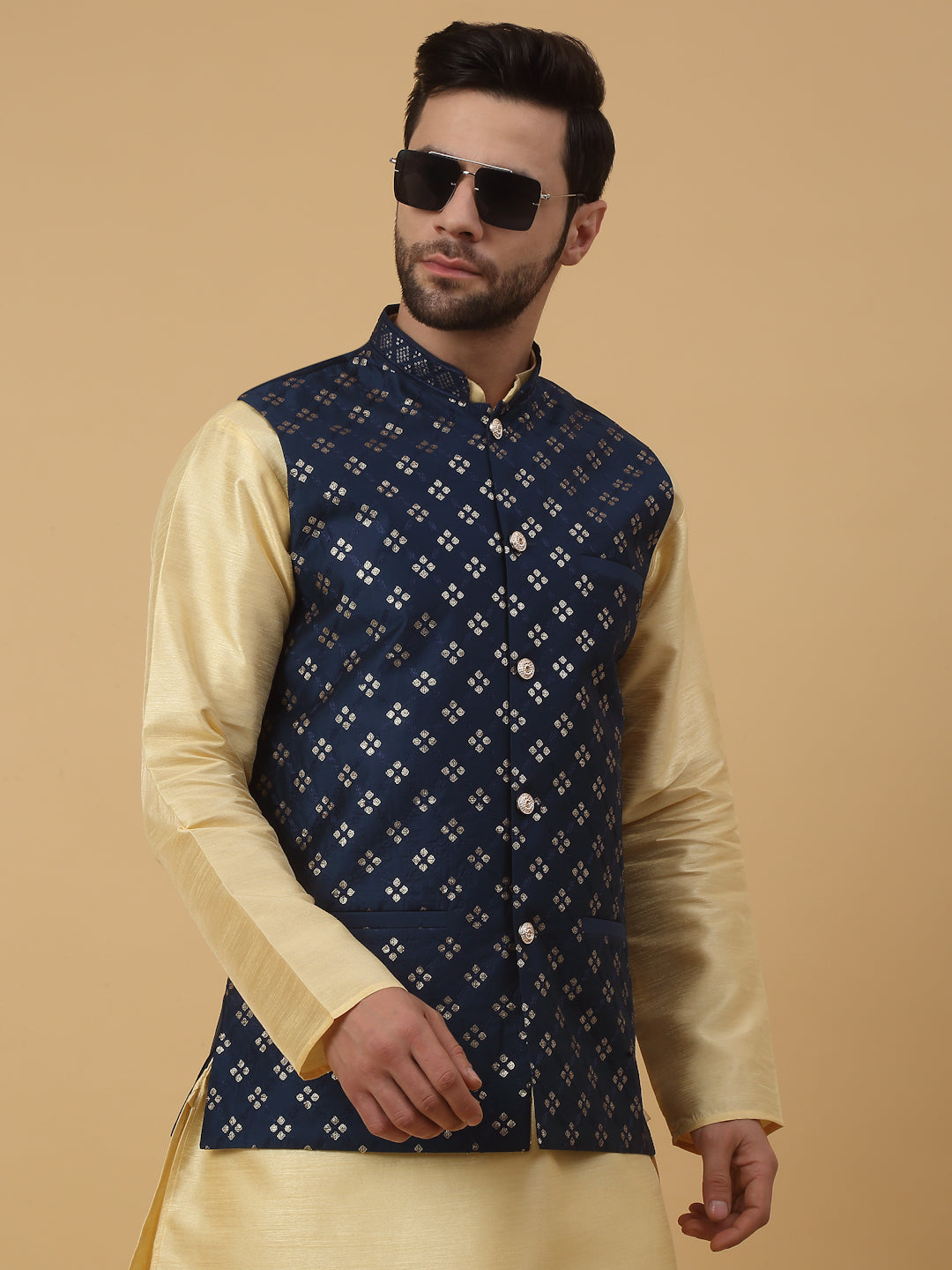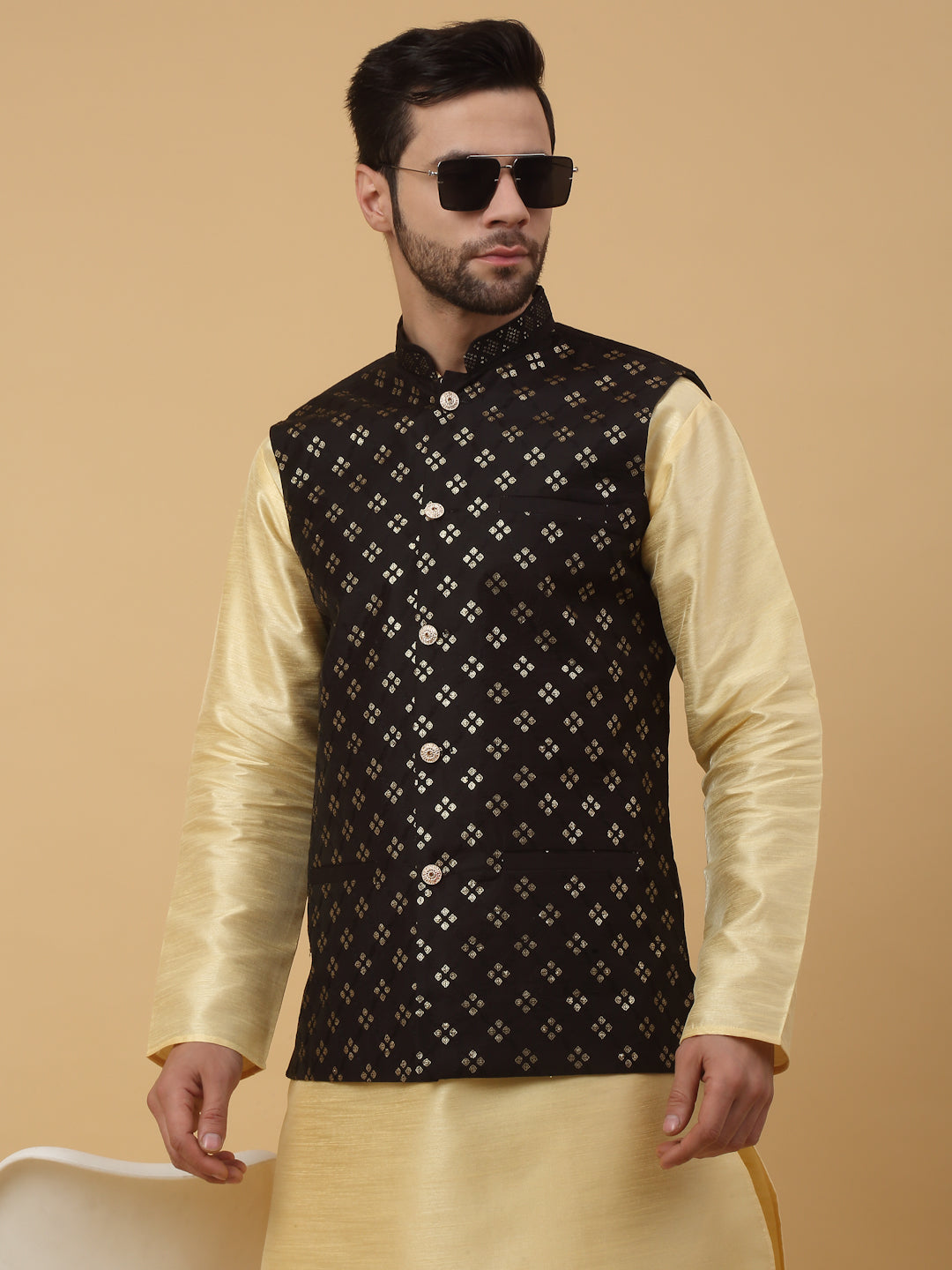 KRAFT INDIA Men's Silk Blend Beige Kurta, Churidar with Cotton Silk Embroided Sequenced Nehru Jacket Set