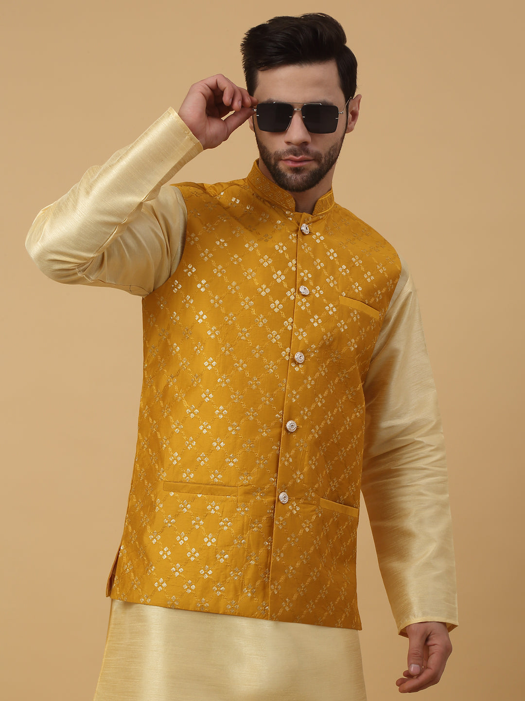 Yellow Solid Kurta & Churidar with Yellow Nehru jacket Yellow solid straight knee length kurta has mandarin collar, long sleeves, side pockets, straight hem, loopi button closure, side slits, with drawstring closure Yellow churidar Yellow Striped Nehru jacket, has a mandarin collar, sleeveless, button closure, three pockets, an attached lining