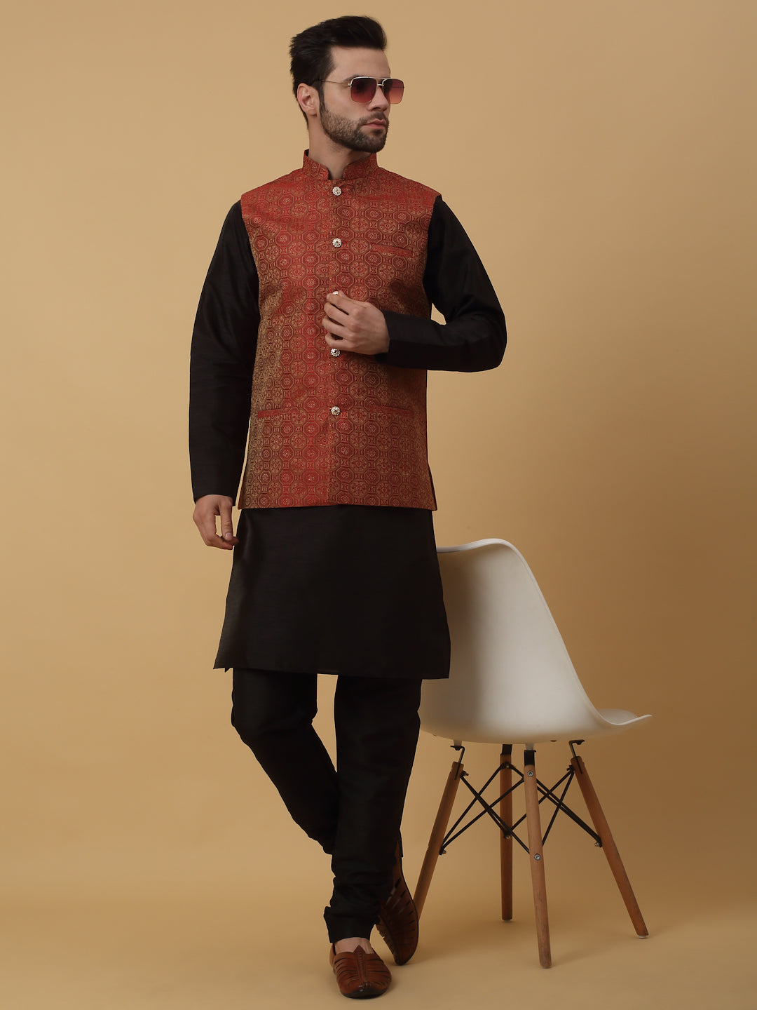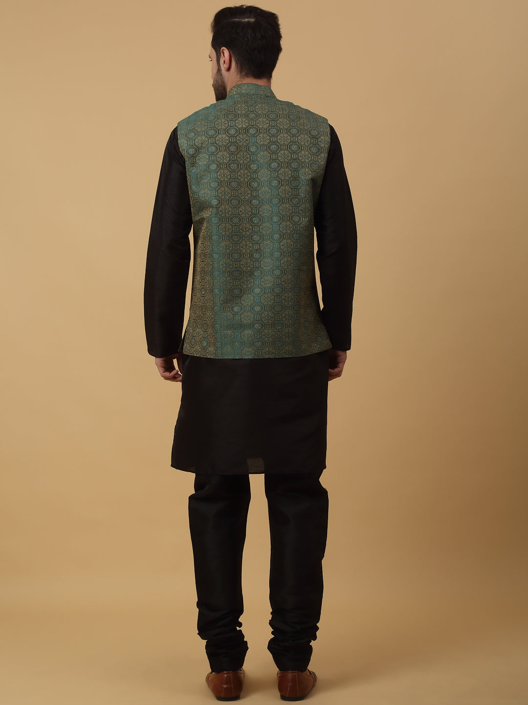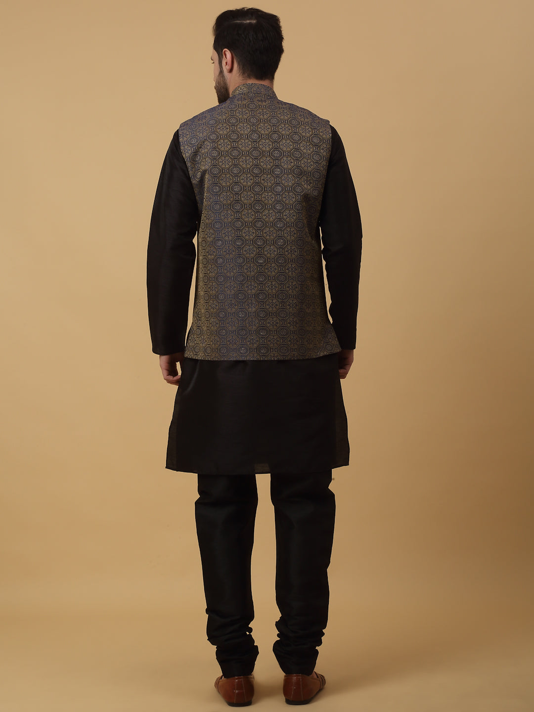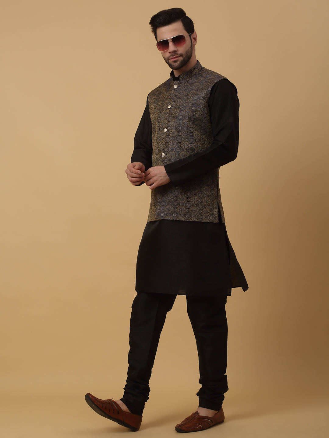 KRAFT INDIA Men's Silk Blend Black Kurta, Churidar with Jacquard Bandhani Silk Blend Nehru Jacket Set