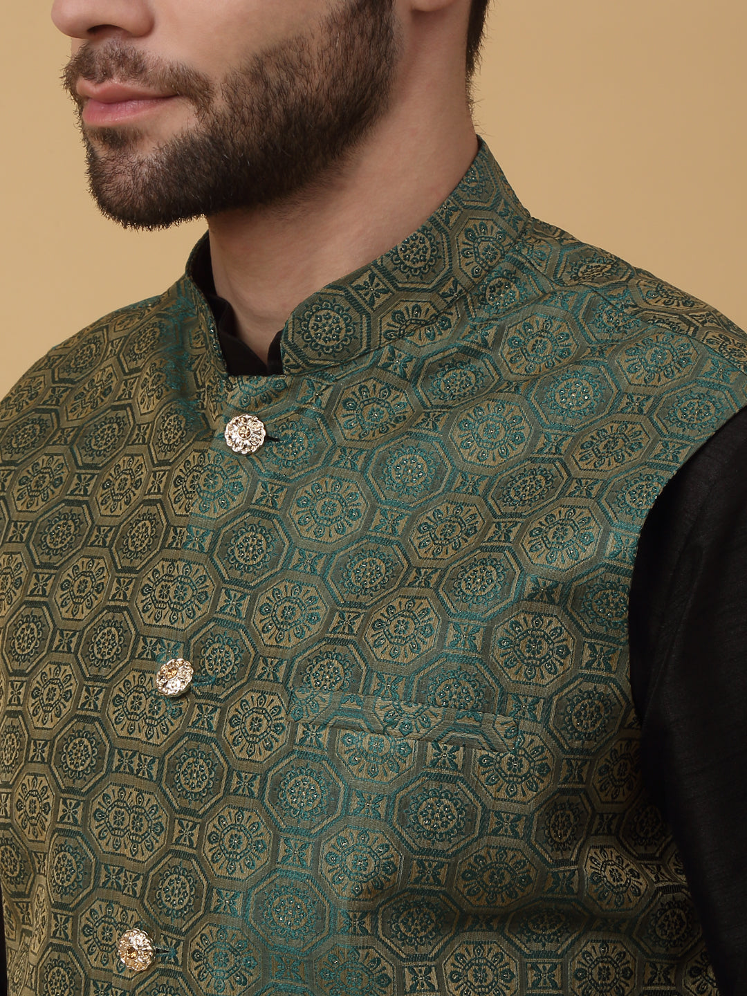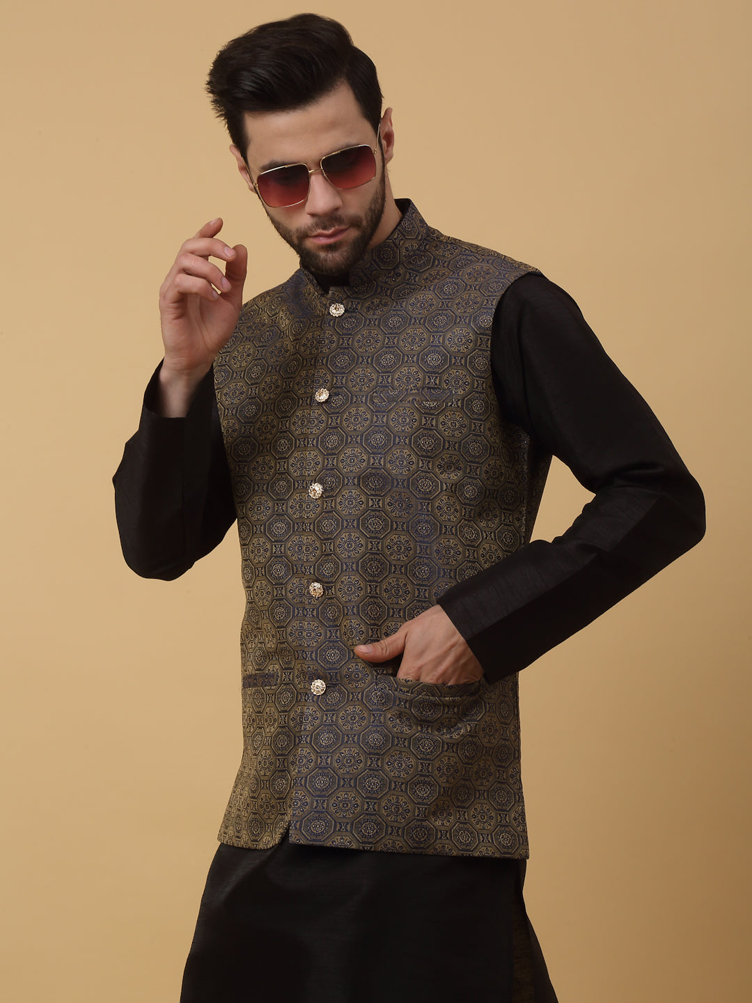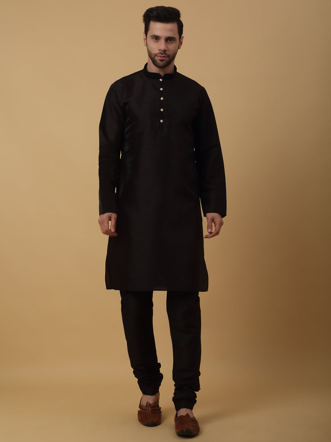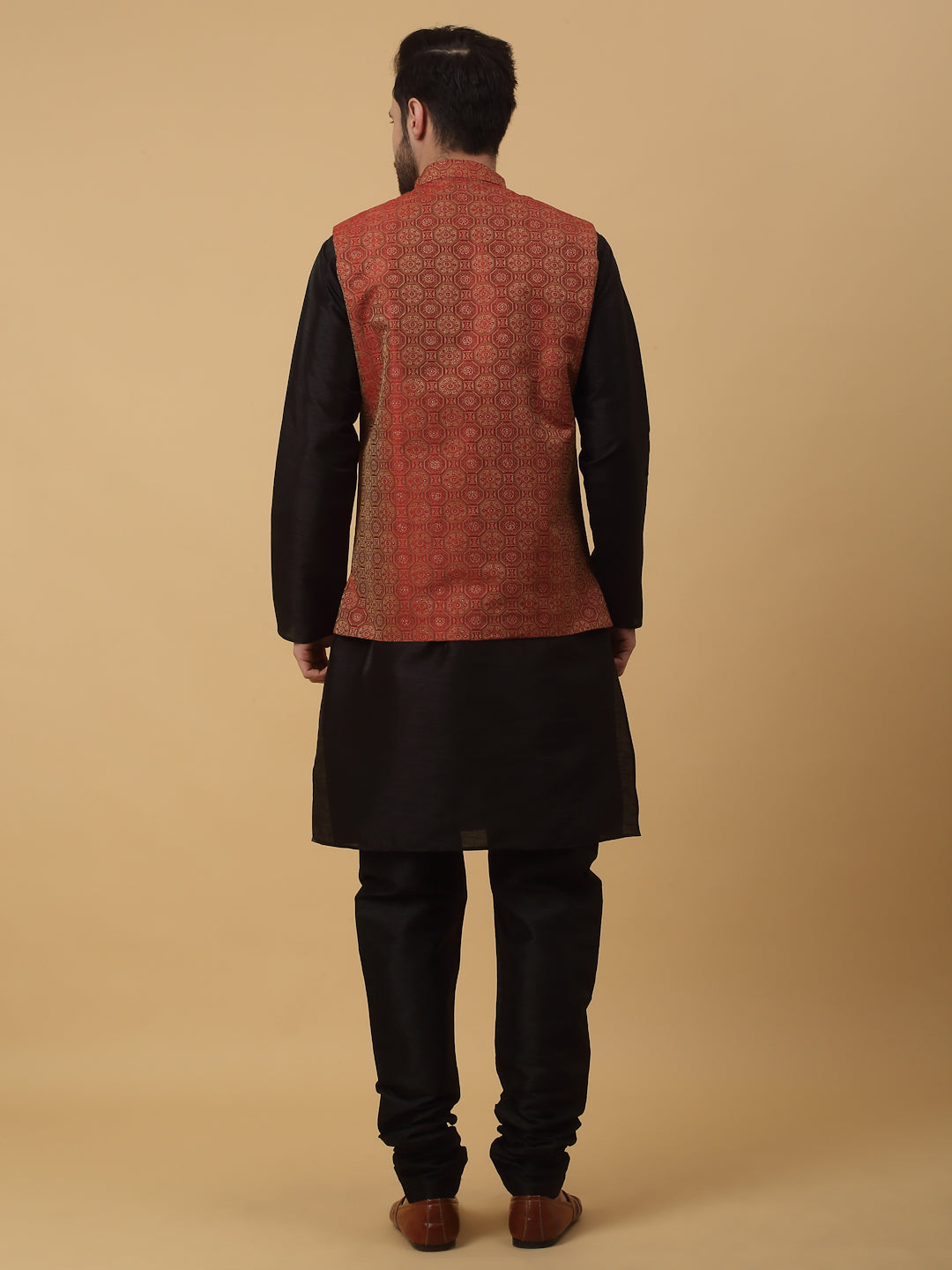 KRAFT INDIA Men's Silk Blend Black Kurta, Churidar with Jacquard Bandhani Silk Blend Nehru Jacket Set