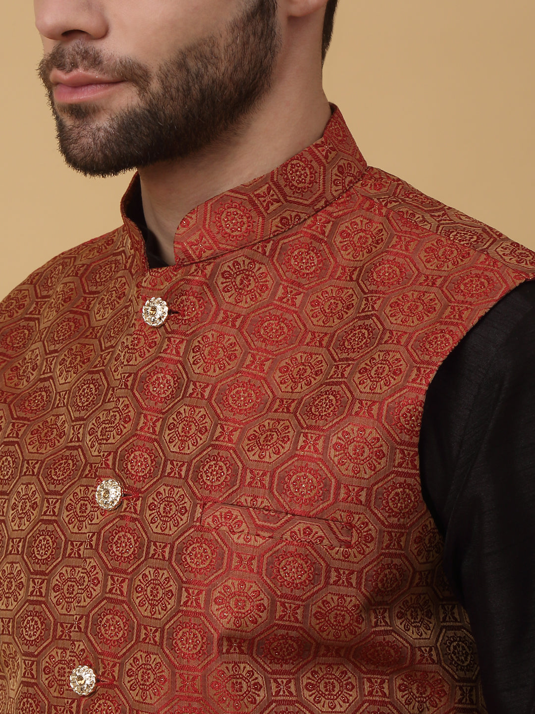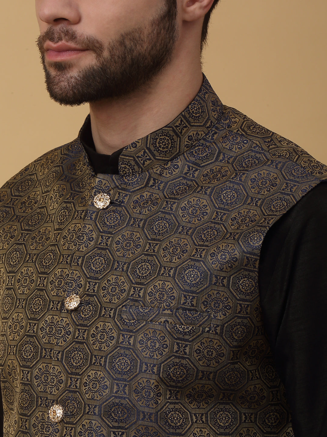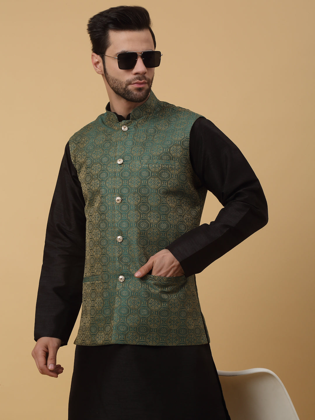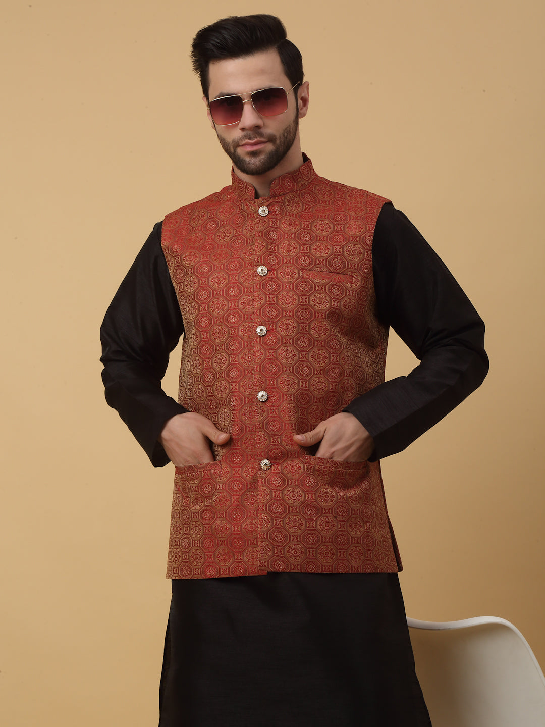 KRAFT INDIA Men's Silk Blend Black Kurta, Churidar with Jacquard Bandhani Silk Blend Nehru Jacket Set