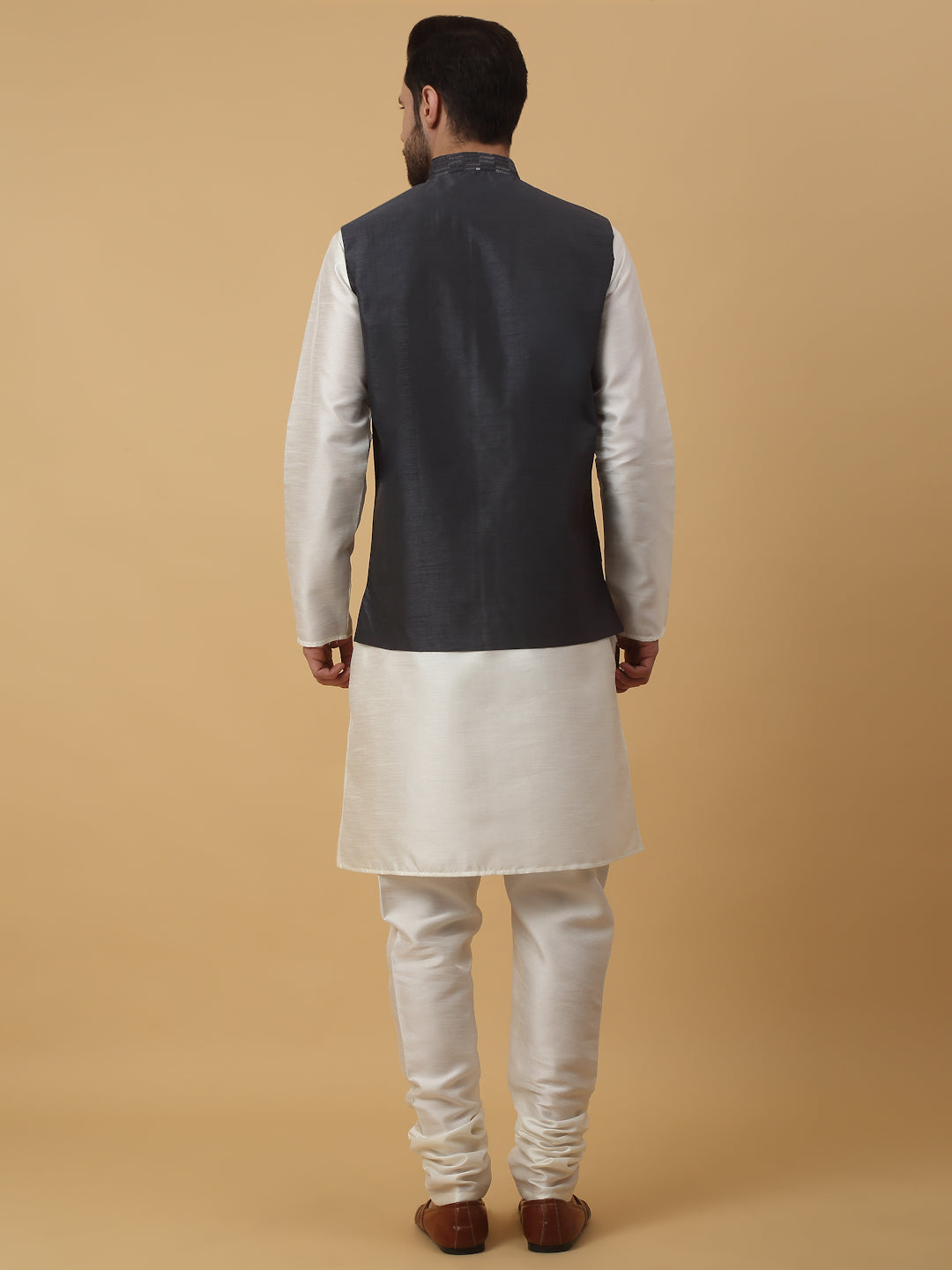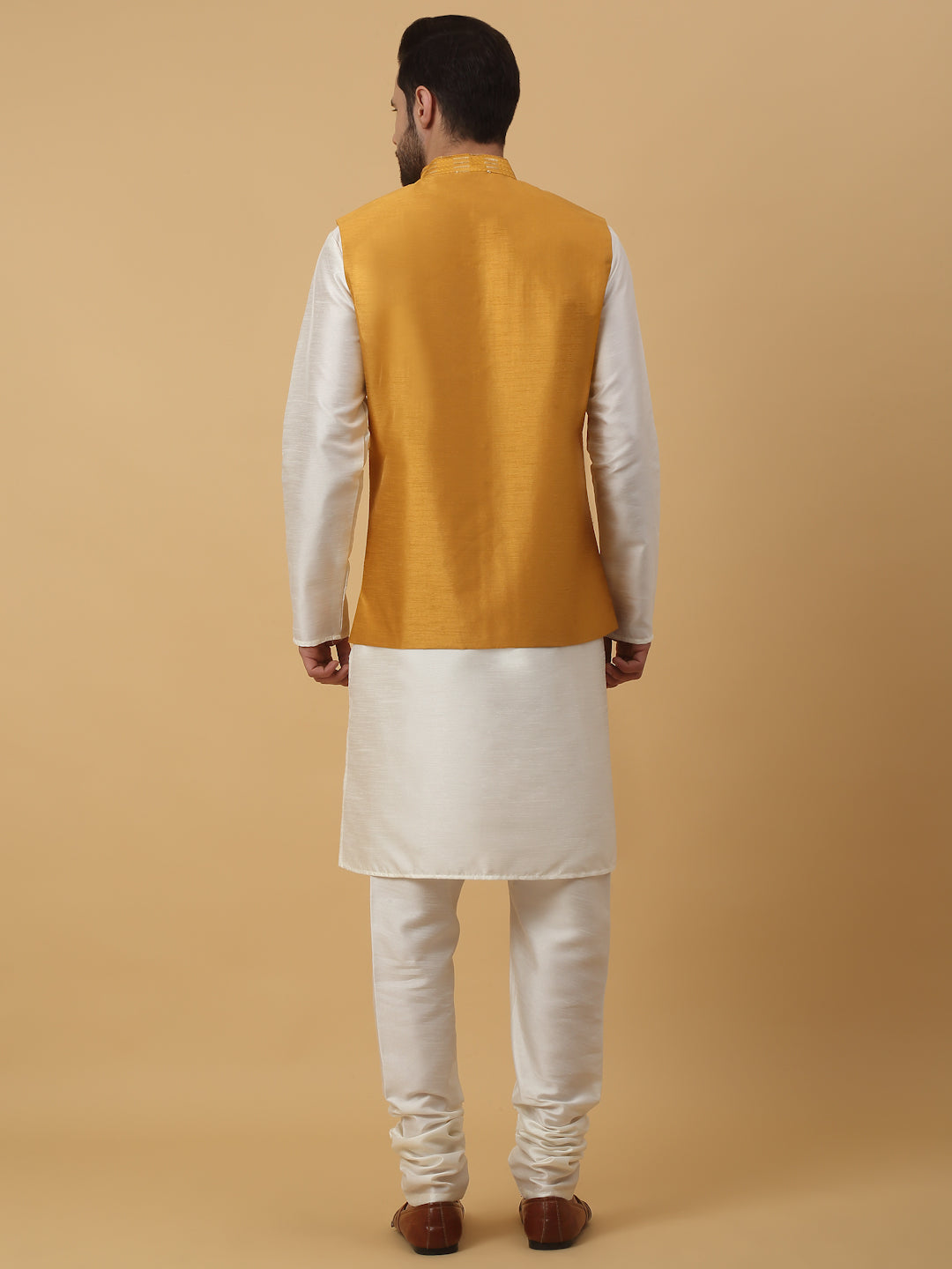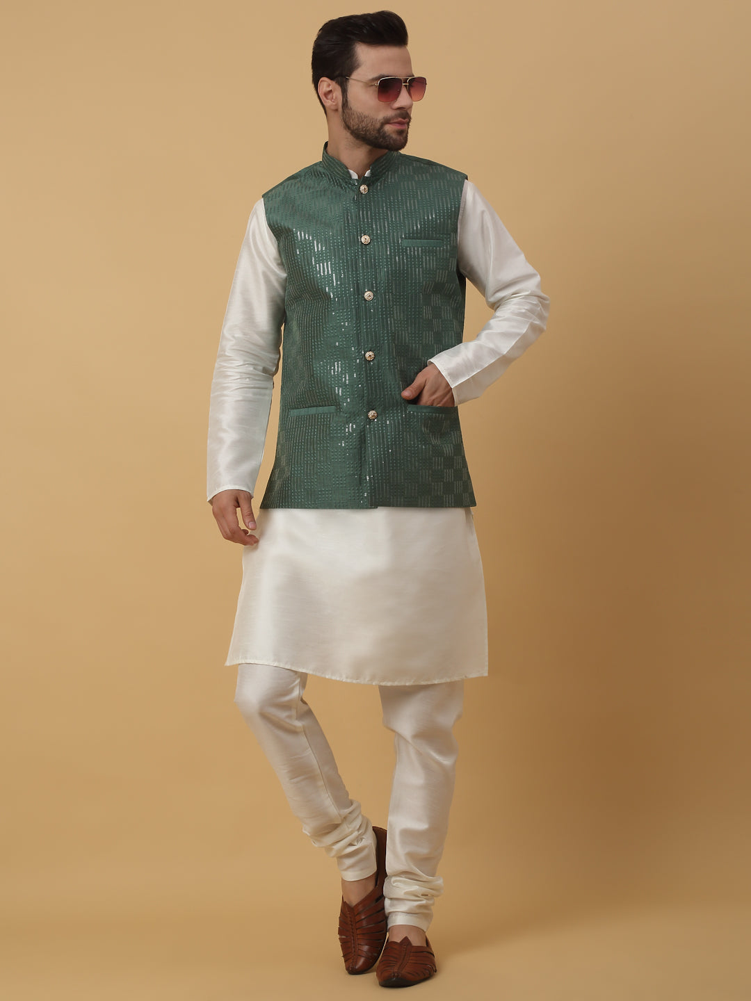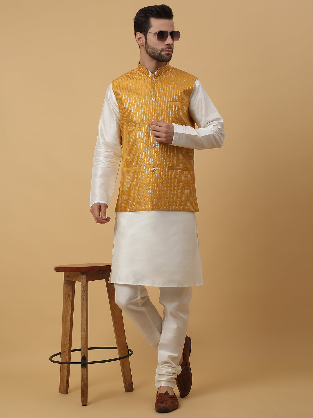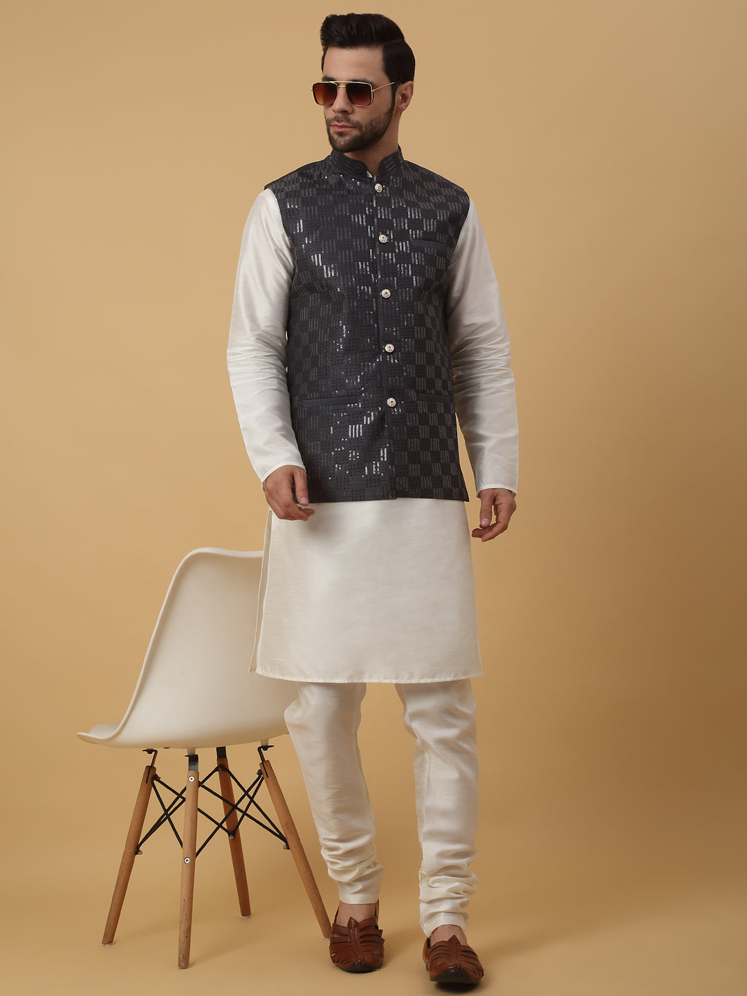 KRAFT INDIA Men's Silk Blend Cream Kurta, Churidar with Cotton Silk Sequenced Embroided Nehru Jacket Set