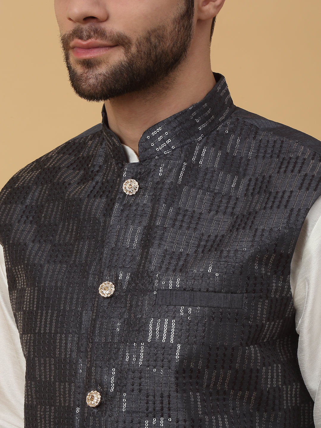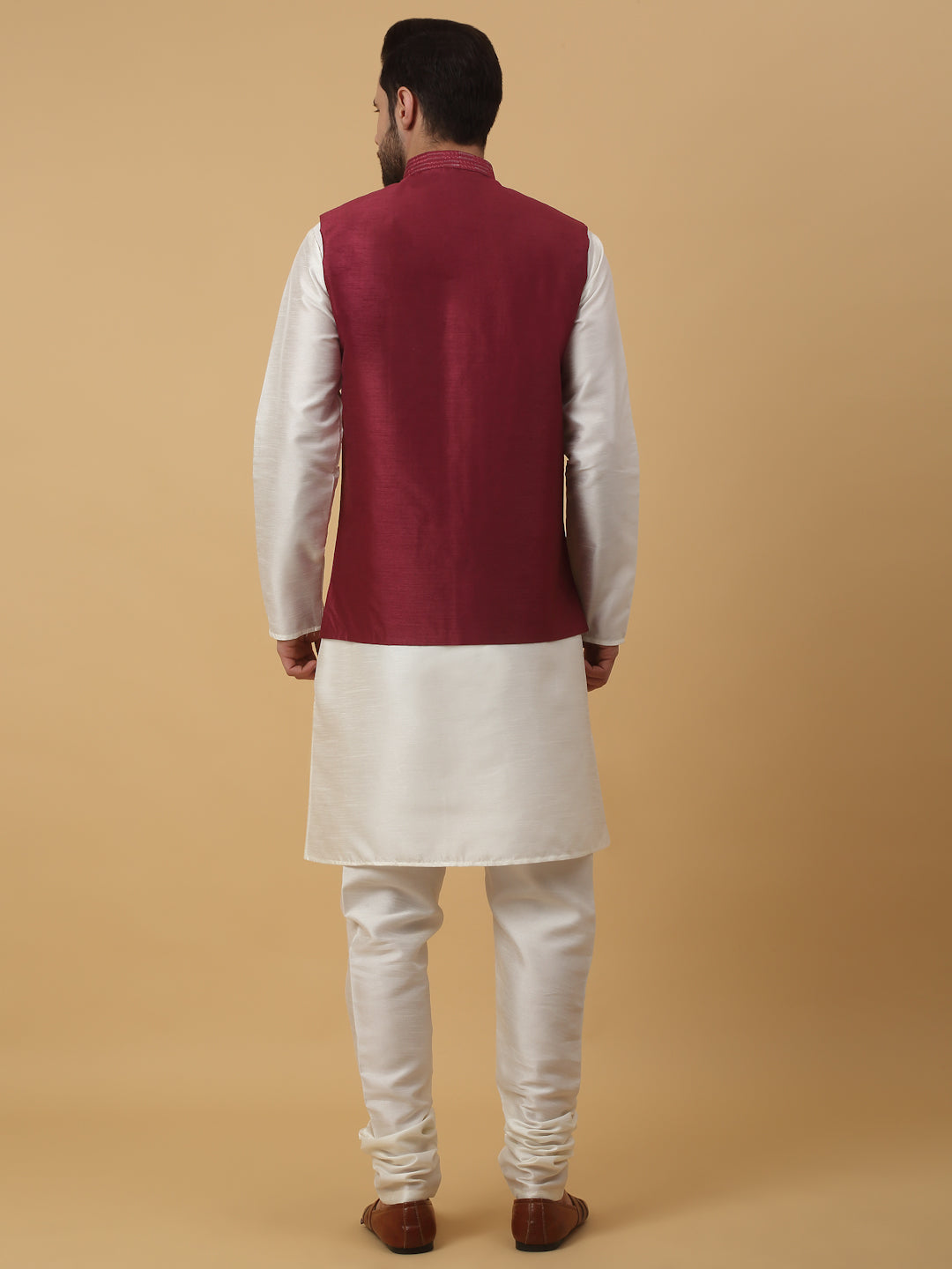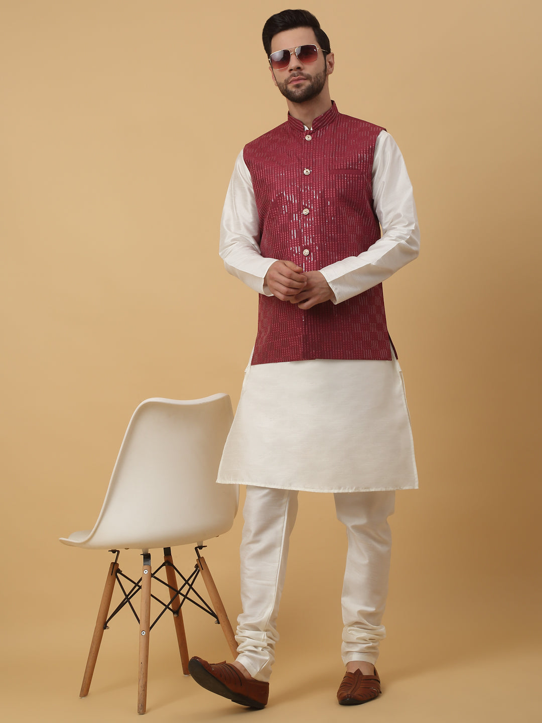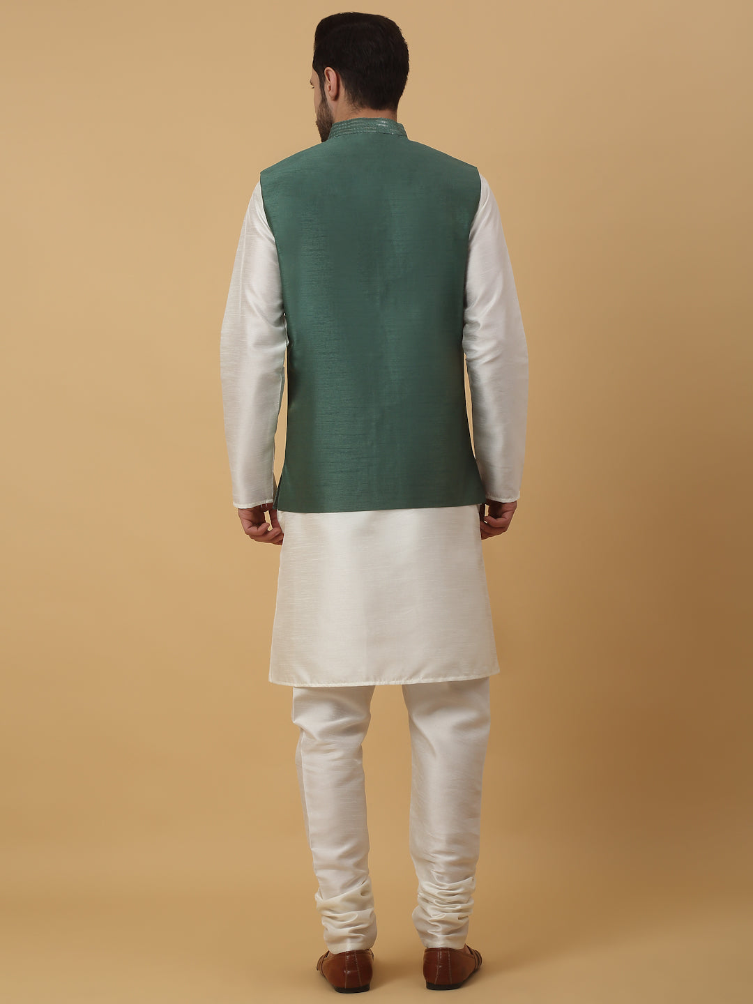 KRAFT INDIA Men's Silk Blend Cream Kurta, Churidar with Cotton Silk Sequenced Embroided Nehru Jacket Set