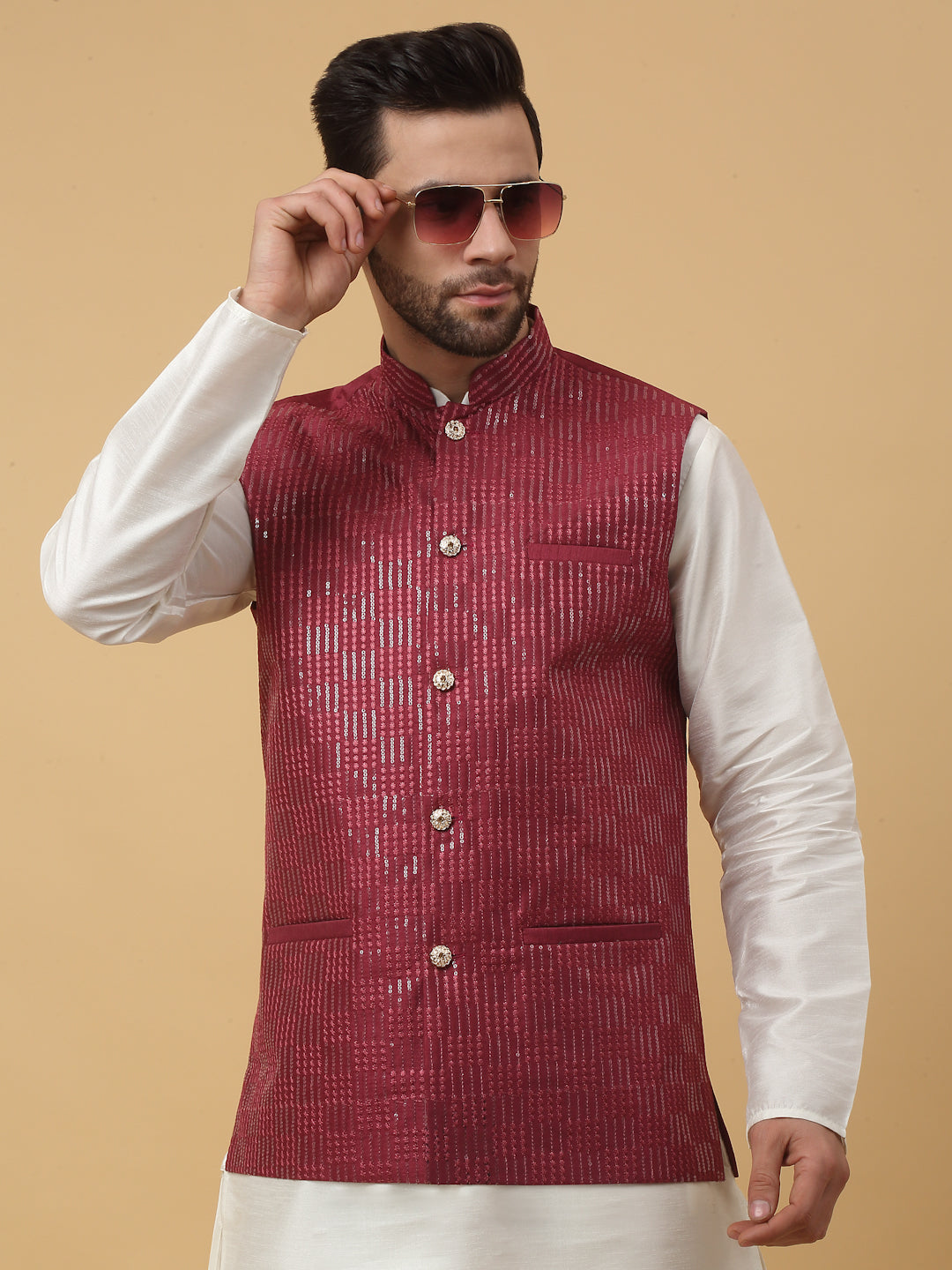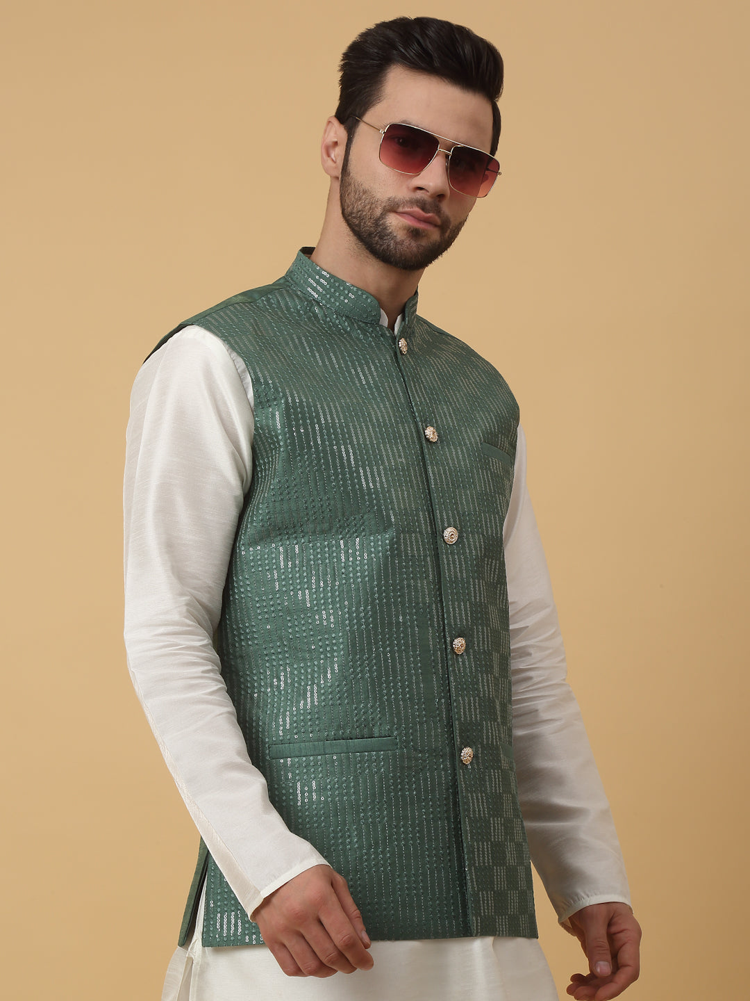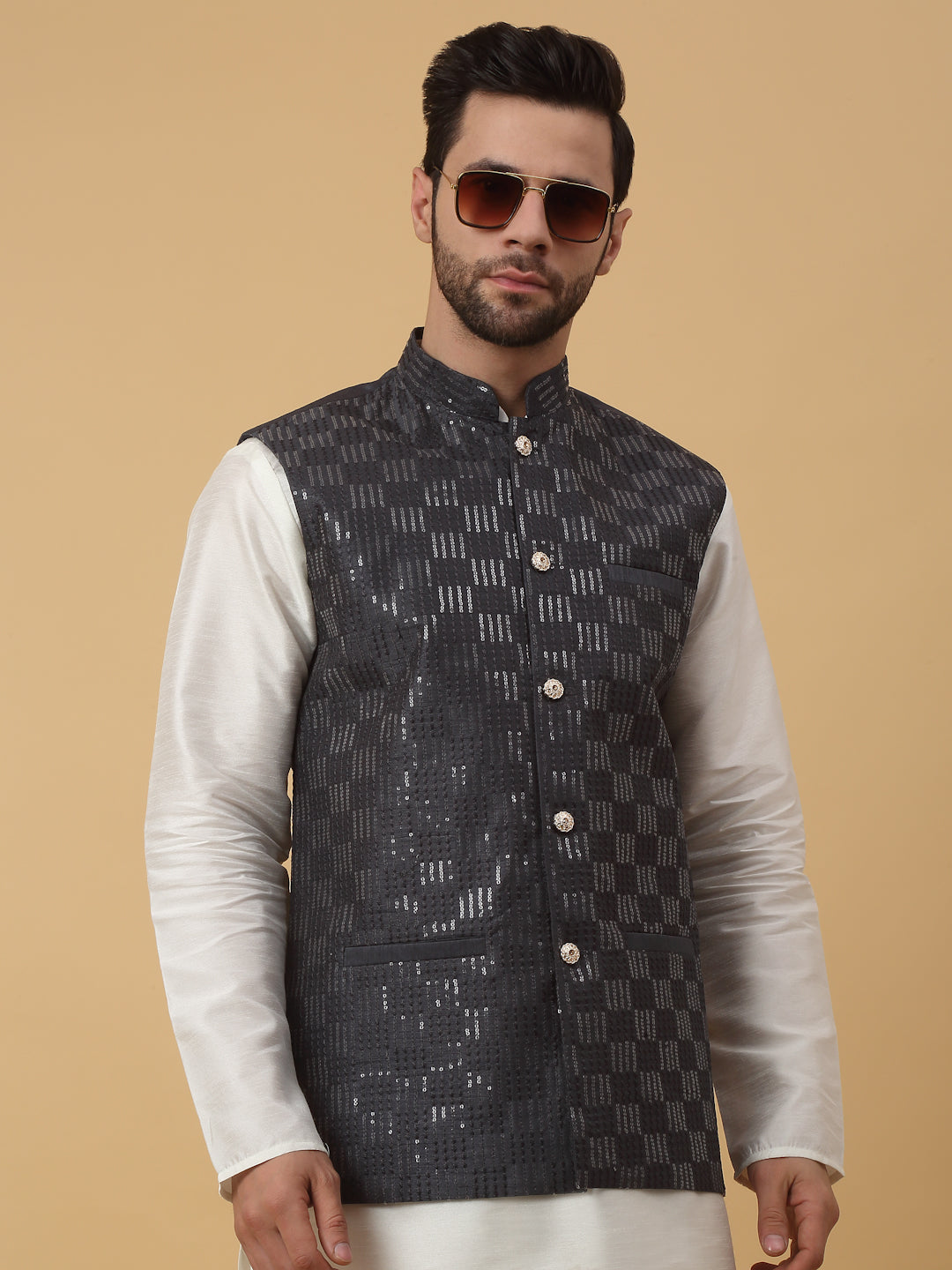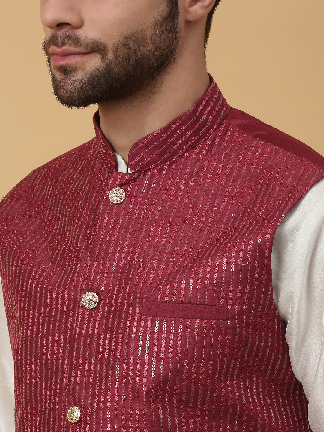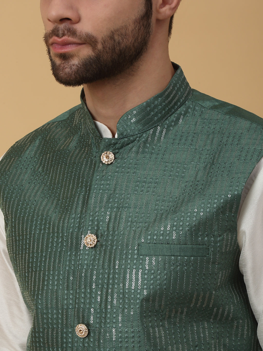 KRAFT INDIA Men's Silk Blend Cream Kurta, Churidar with Cotton Silk Sequenced Embroided Nehru Jacket Set