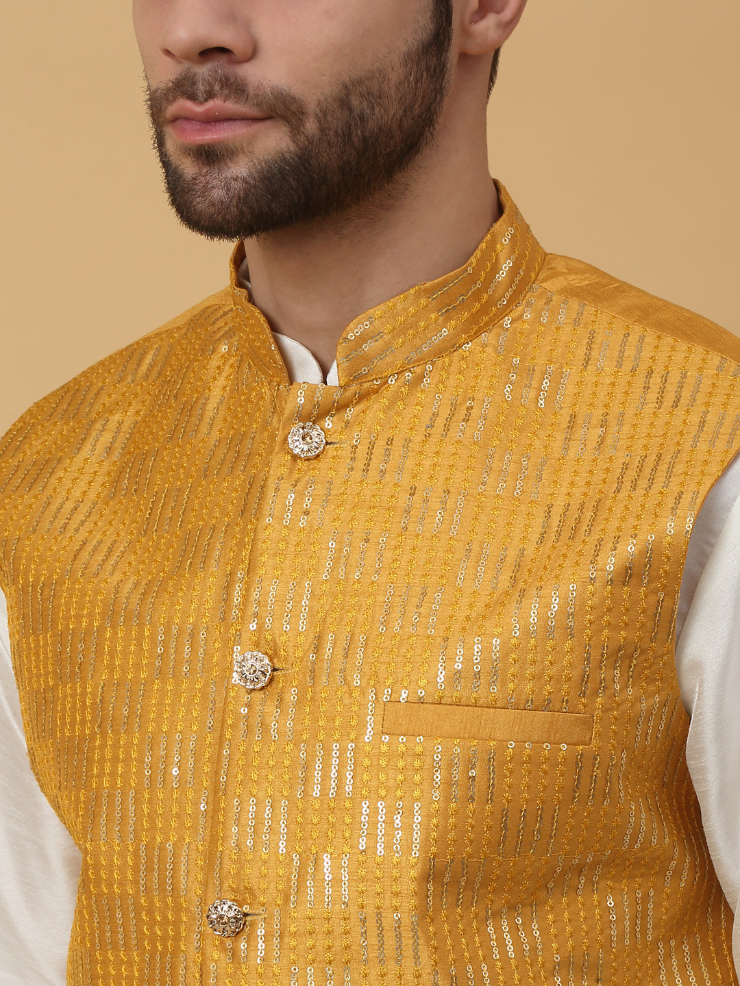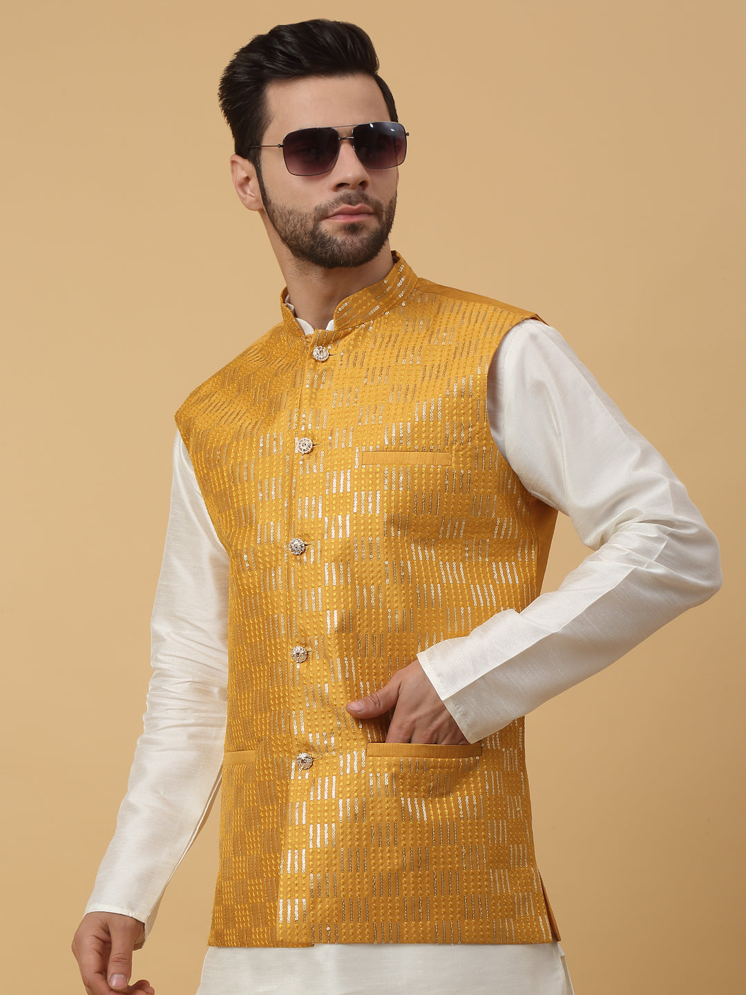 Yellow Solid Kurta & Churidar with Yellow Nehru jacket Yellow solid straight knee length kurta has mandarin collar, long sleeves, side pockets, straight hem, loopi button closure, side slits, with drawstring closure Yellow churidar Yellow Striped Nehru jacket, has a mandarin collar, sleeveless, button closure, three pockets, an attached lining