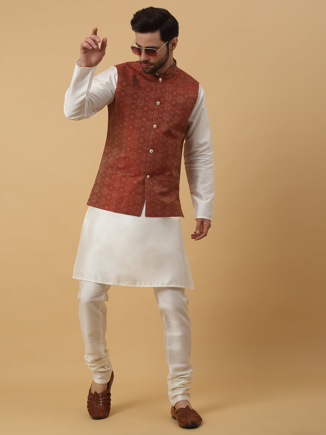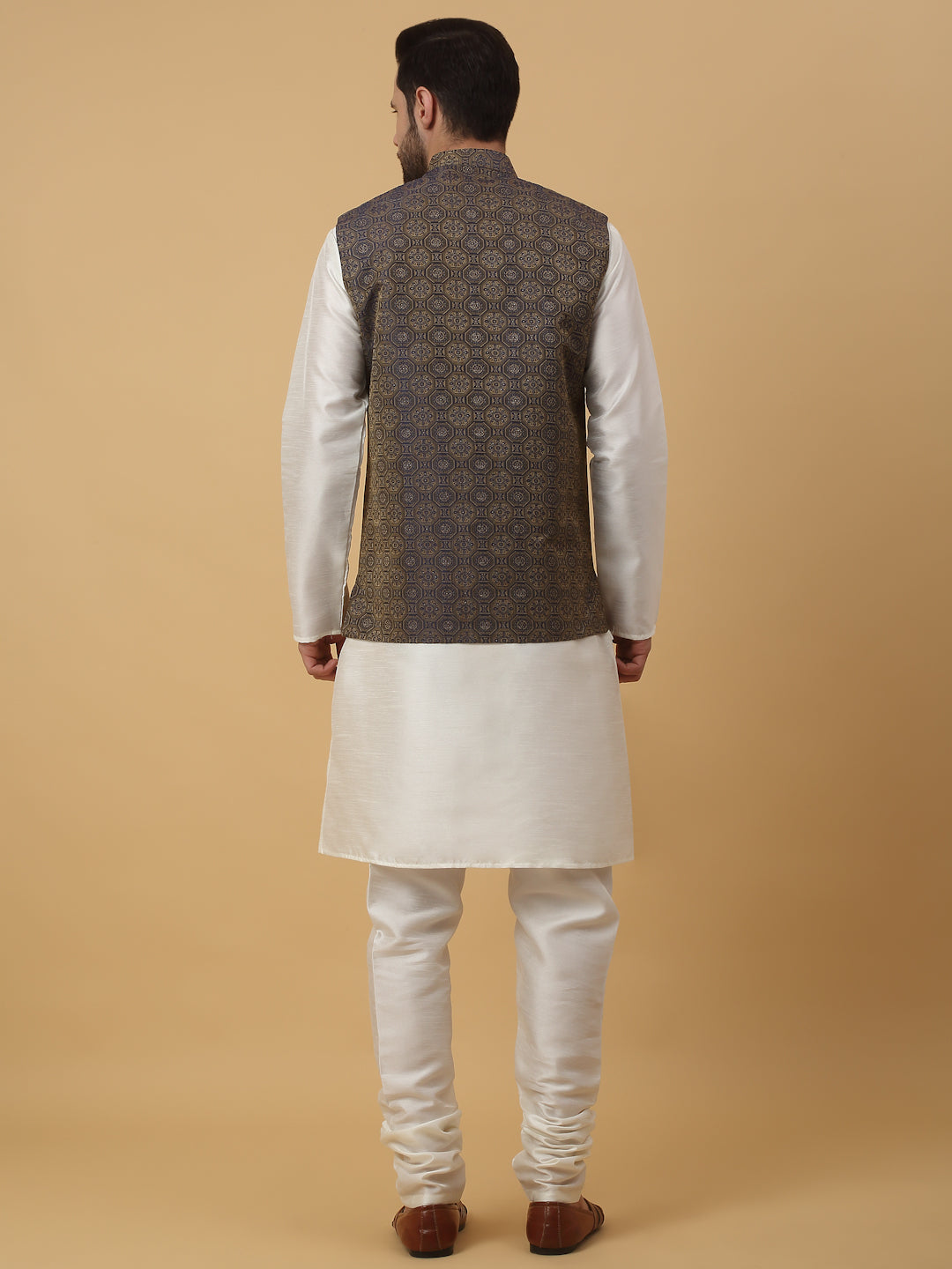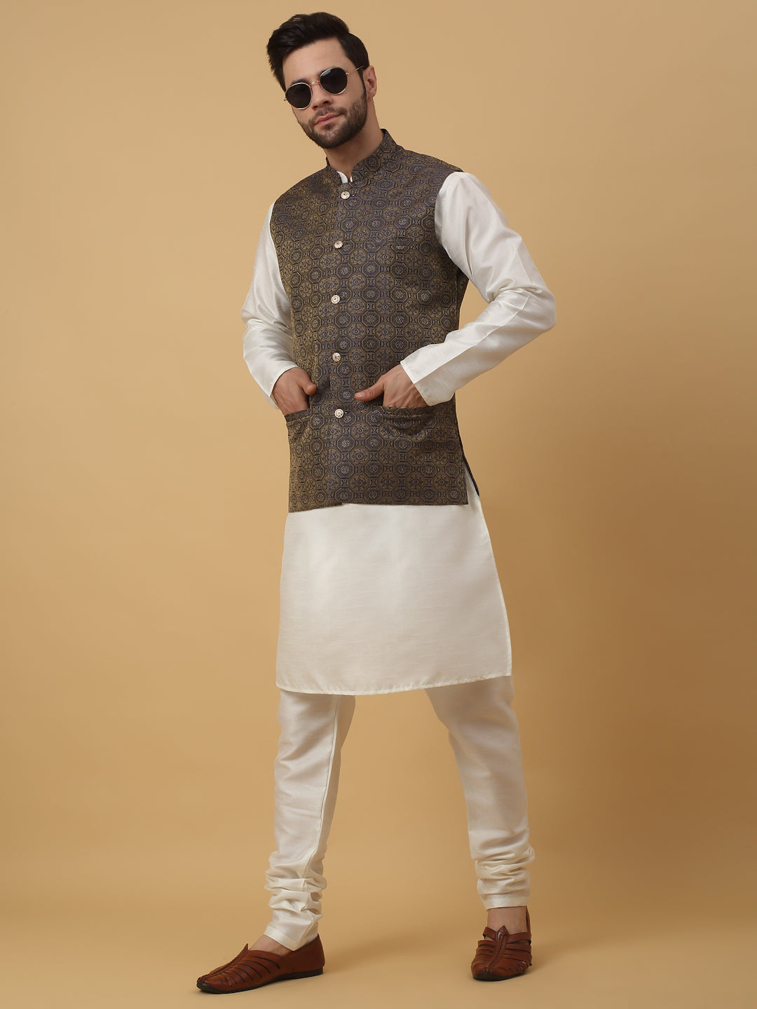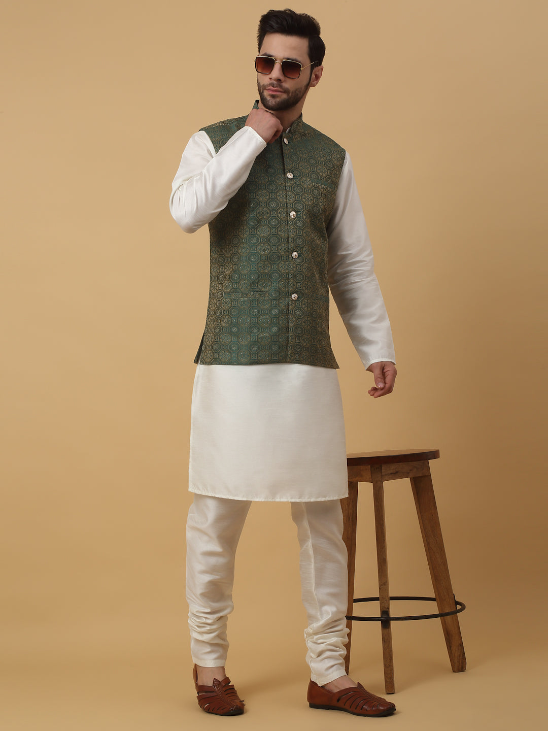 KRAFT INDIA Men's Silk Blend Cream Kurta, Churidar with Jacquard Bandhani Silk Blend Nehru Jacket Set