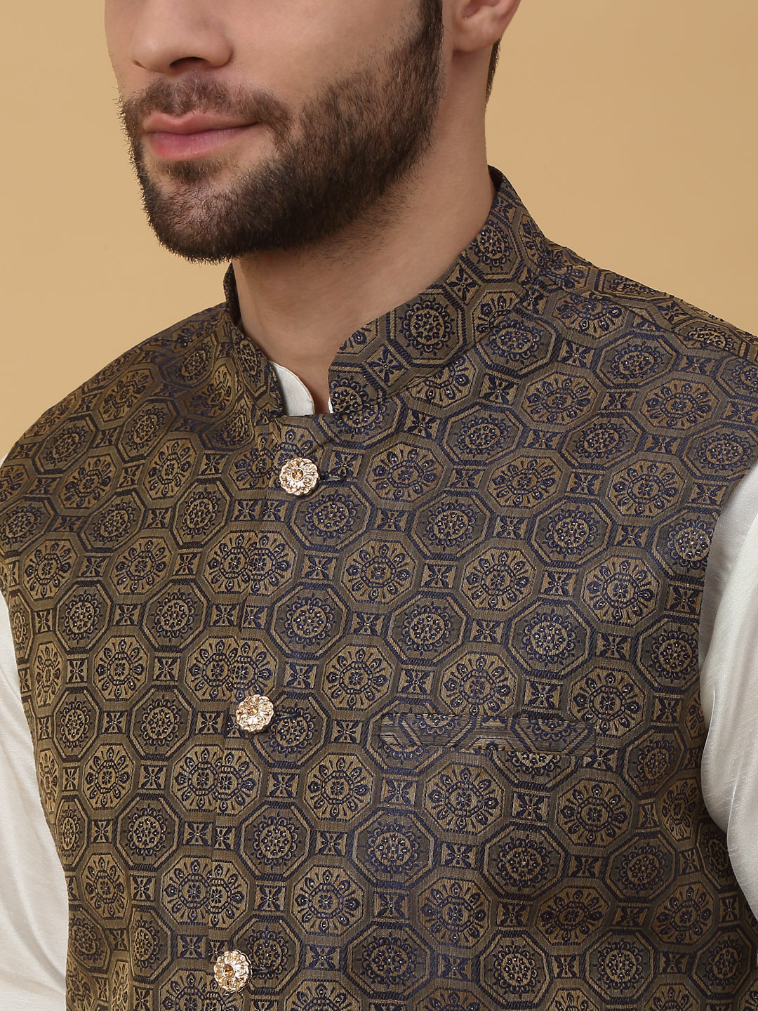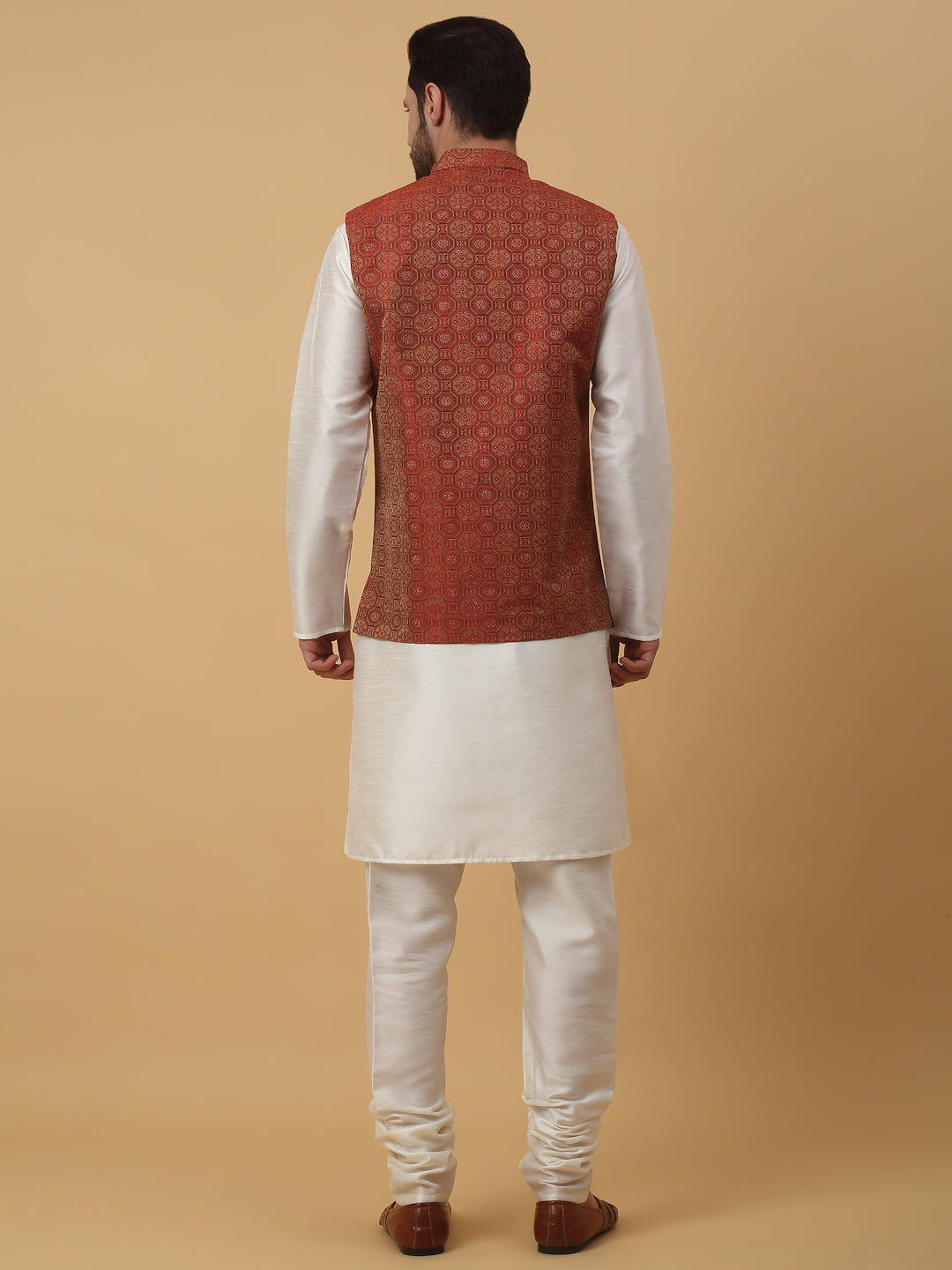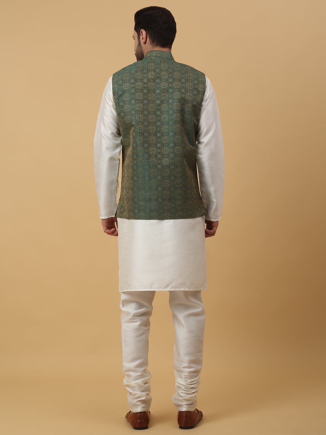 KRAFT INDIA Men's Silk Blend Cream Kurta, Churidar with Jacquard Bandhani Silk Blend Nehru Jacket Set