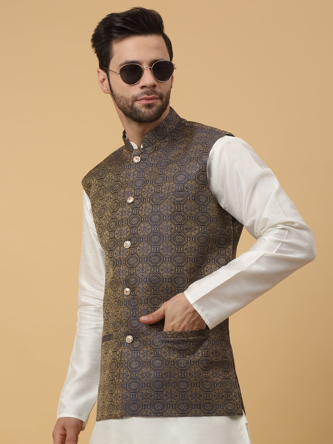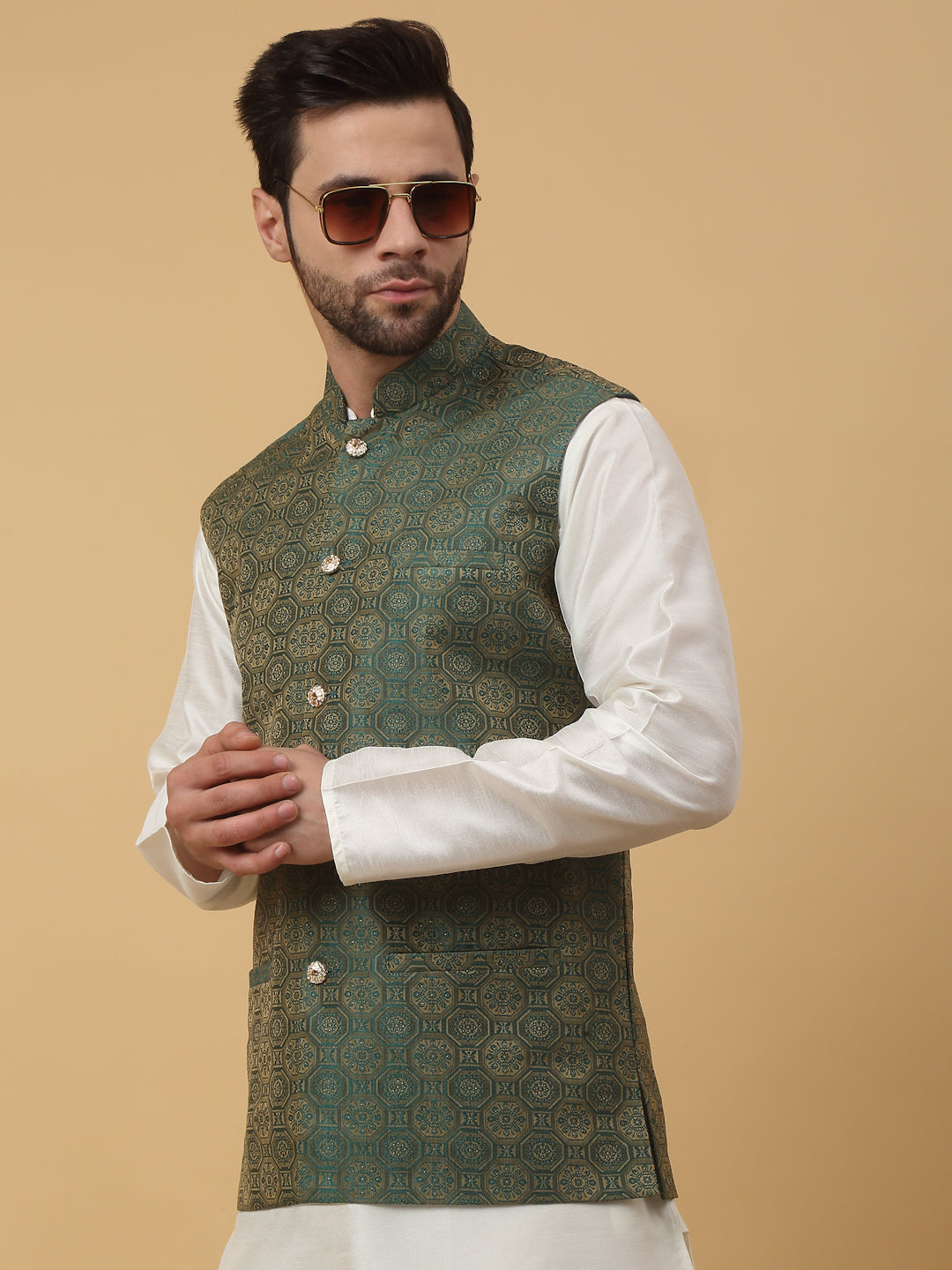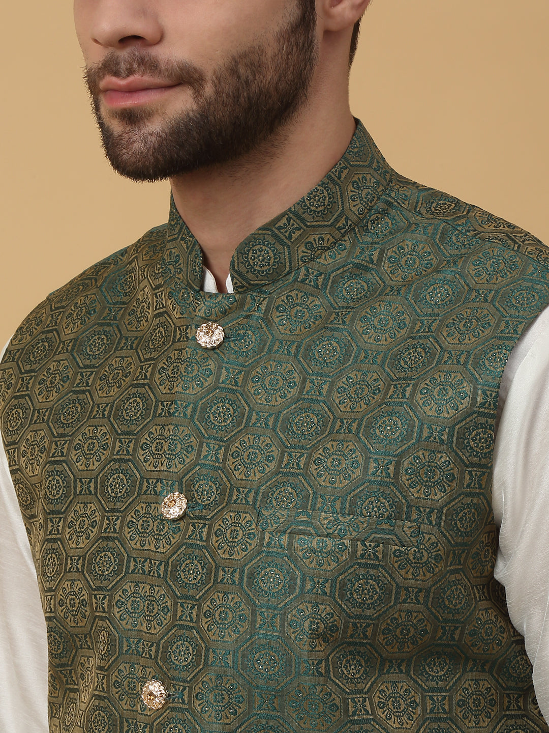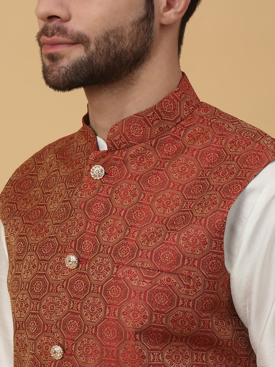 KRAFT INDIA Men's Silk Blend Cream Kurta, Churidar with Jacquard Bandhani Silk Blend Nehru Jacket Set