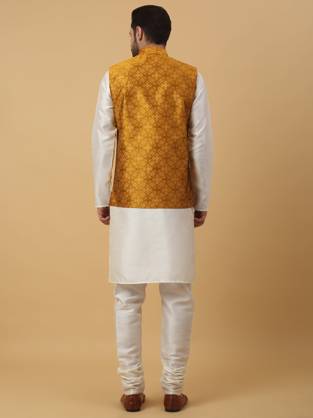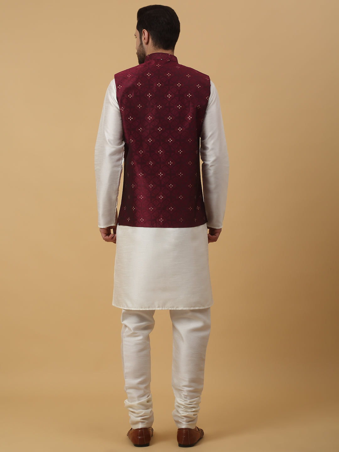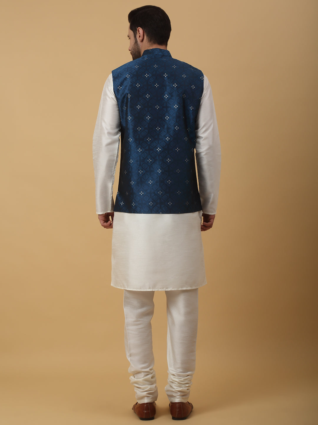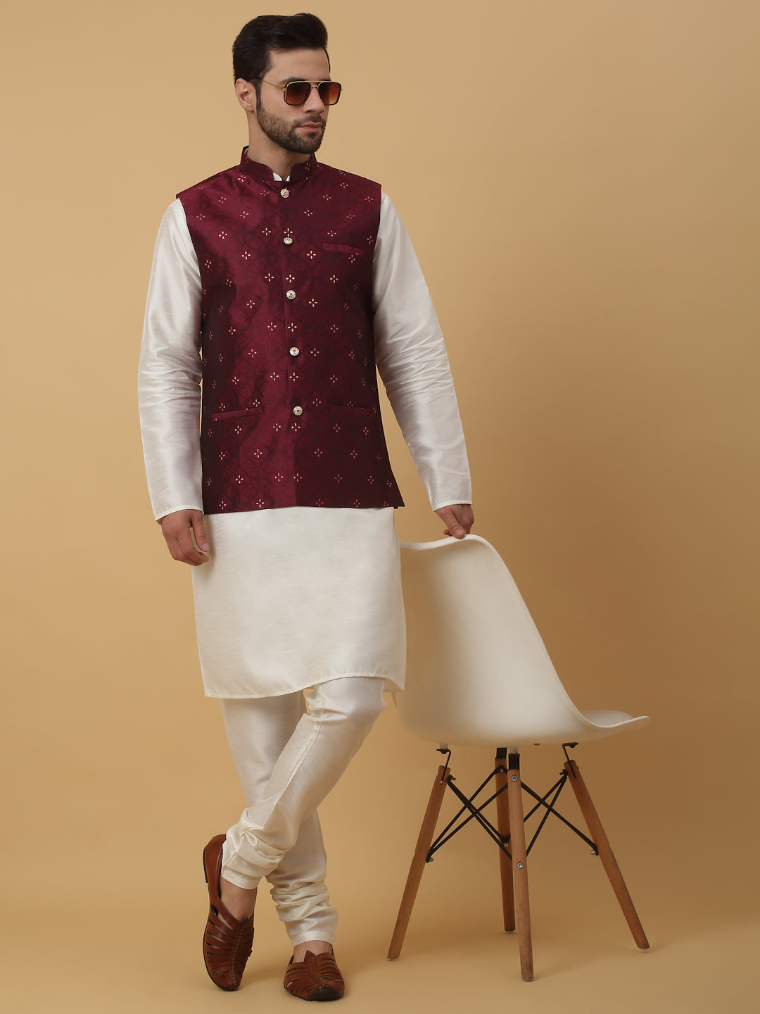 KRAFT INDIA Men's Silk Blend Cream Kurta, Churidar with Jacquard Silk Blend Floral Nehru Jacket Set