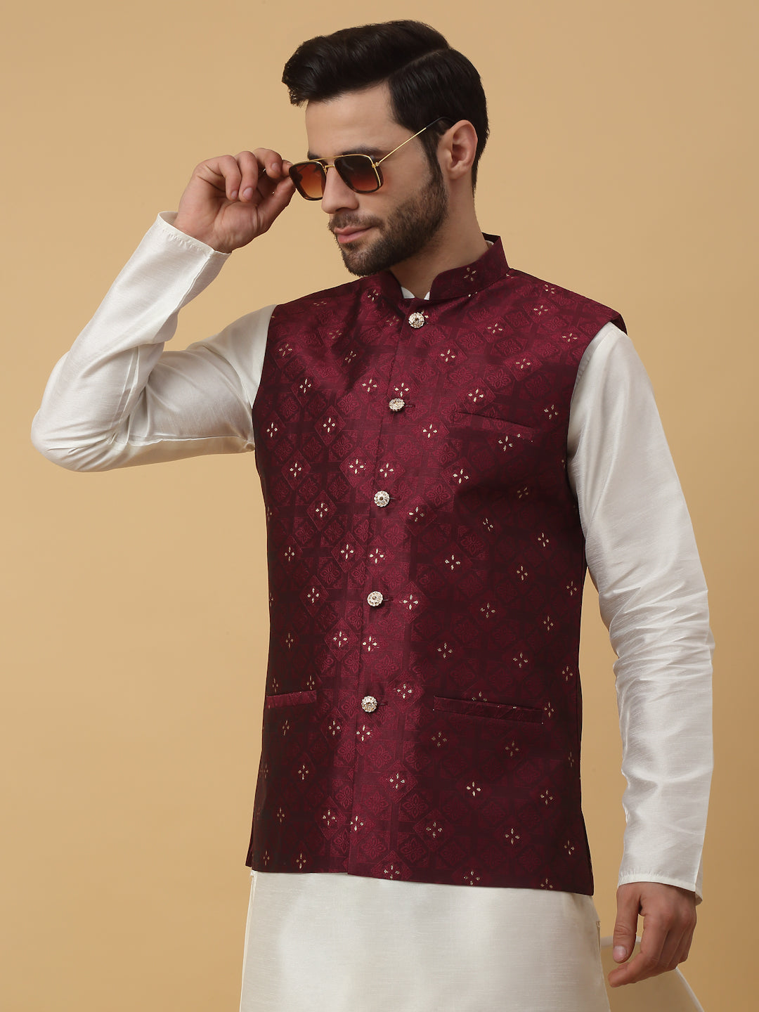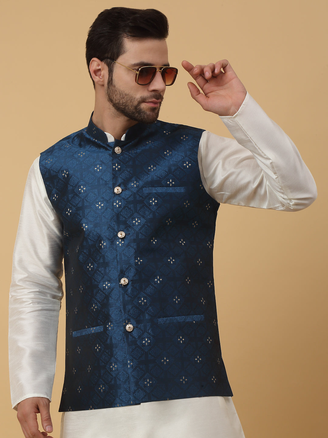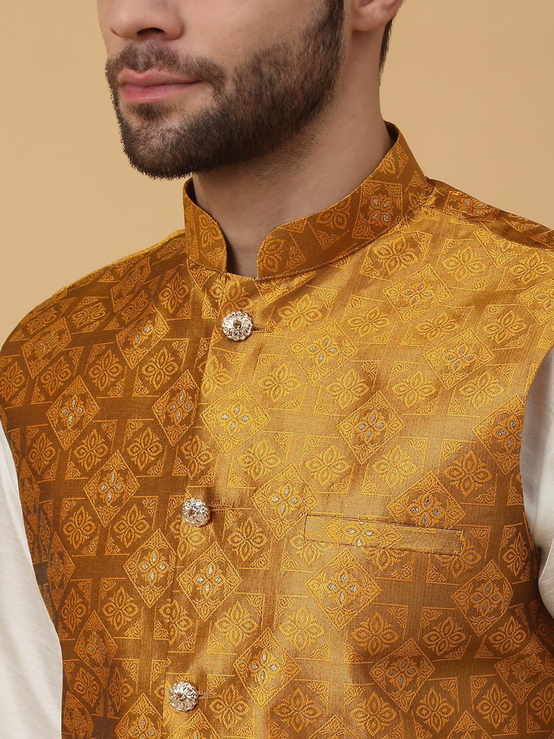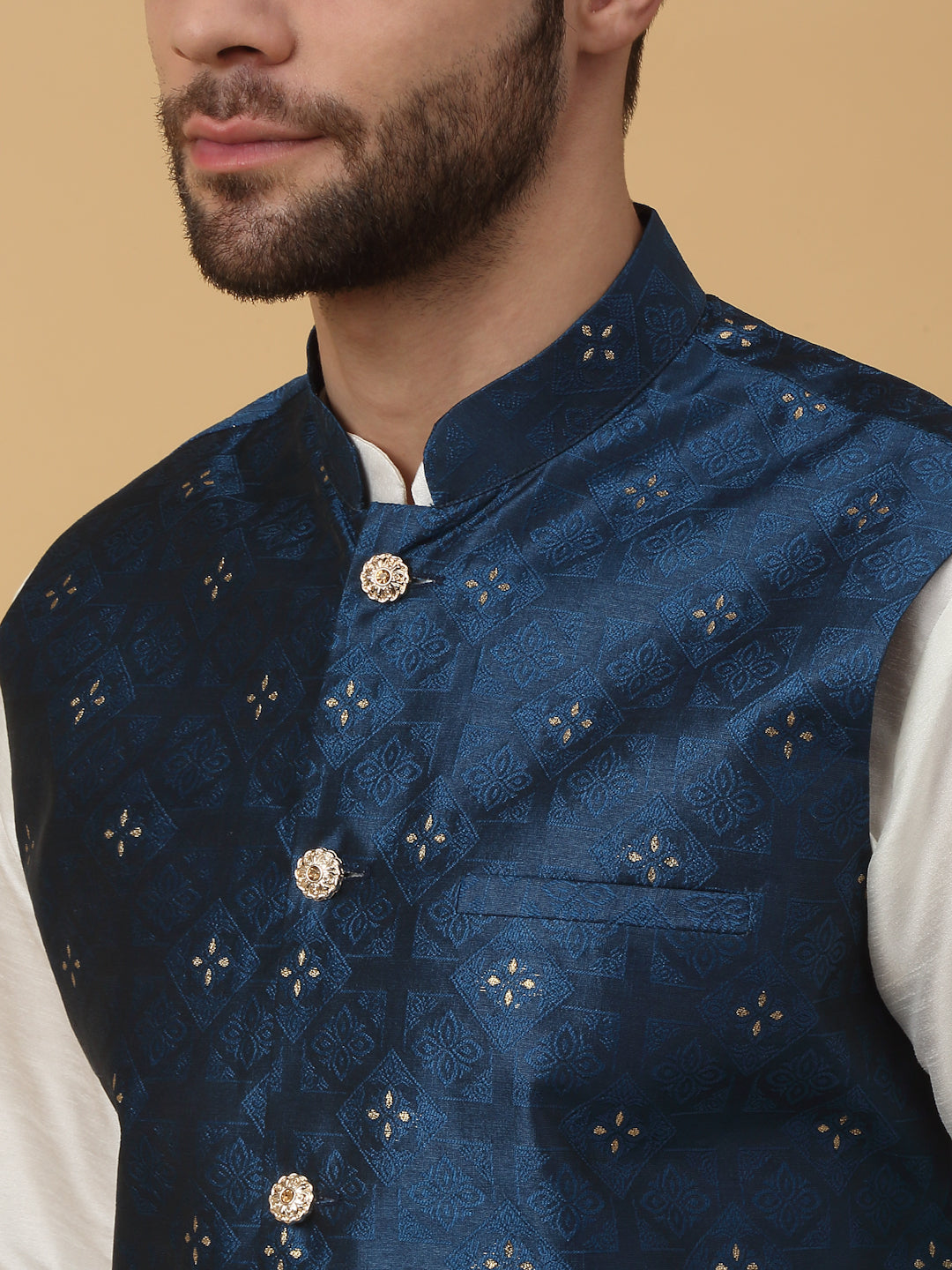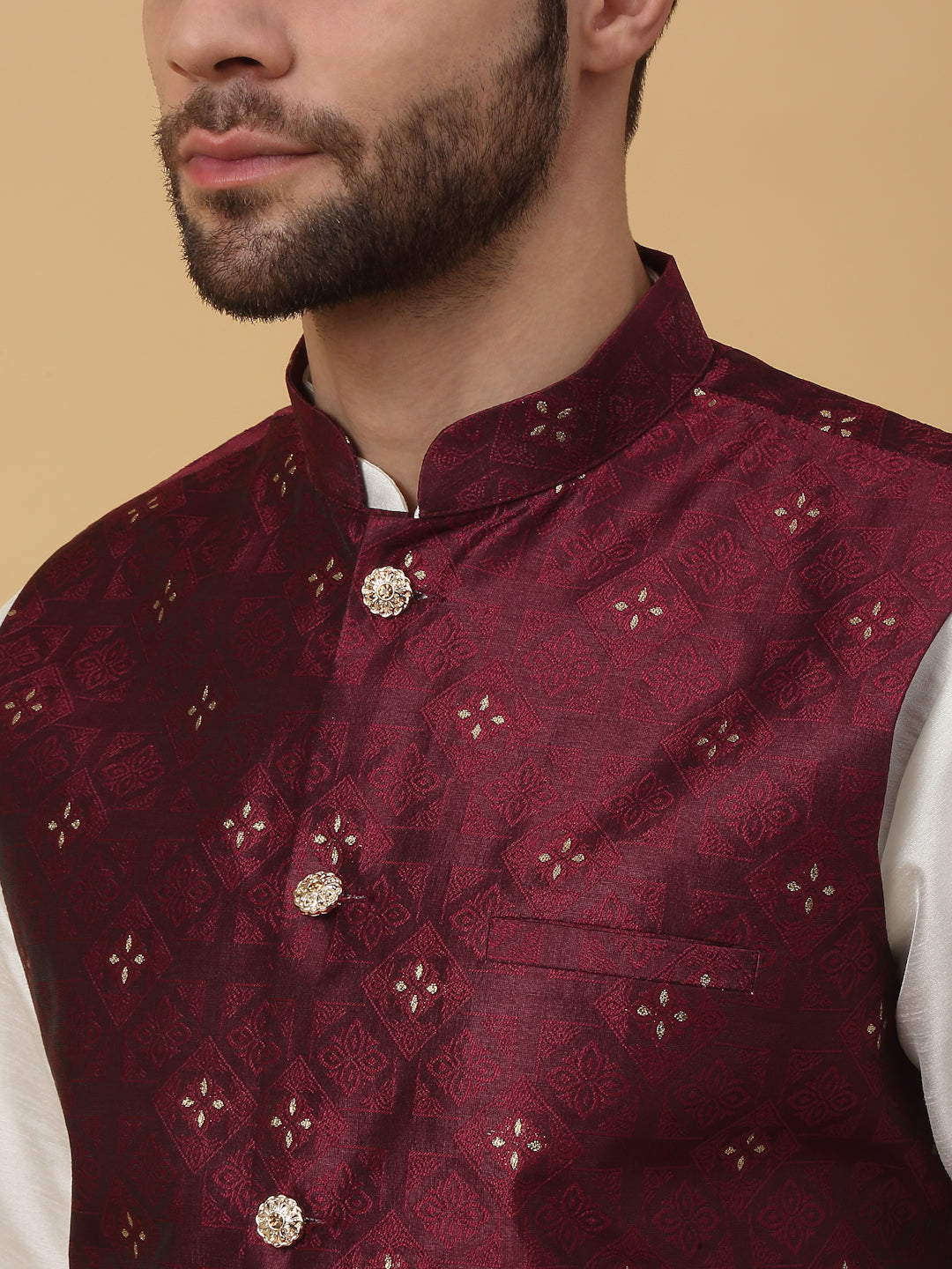 KRAFT INDIA Men's Silk Blend Cream Kurta, Churidar with Jacquard Silk Blend Floral Nehru Jacket Set