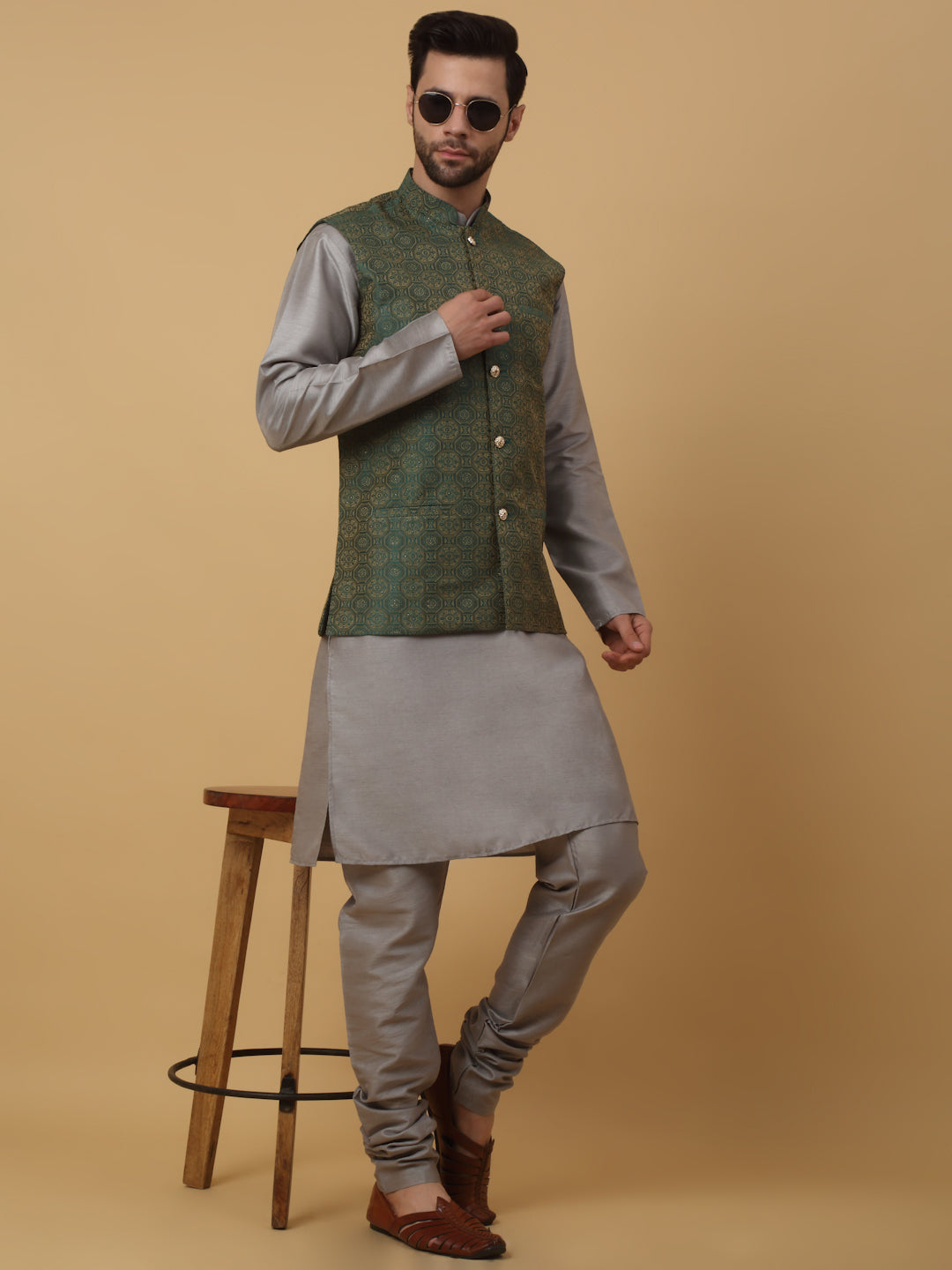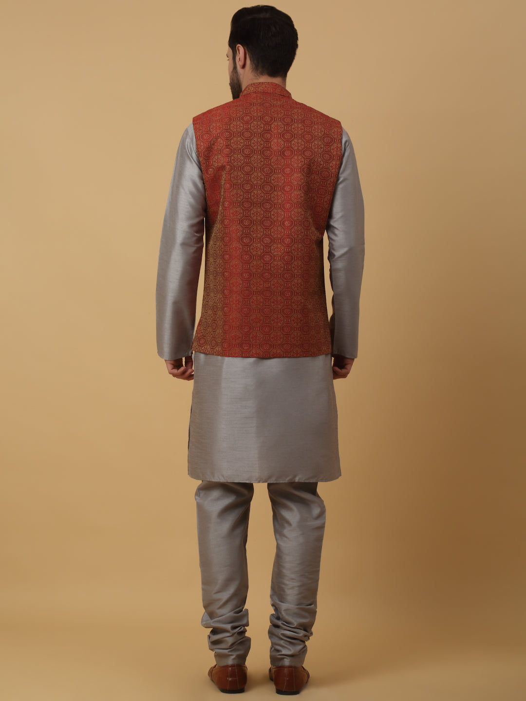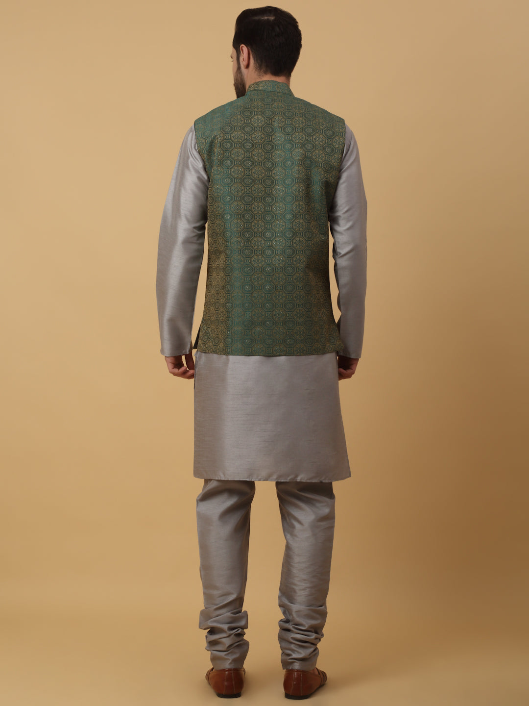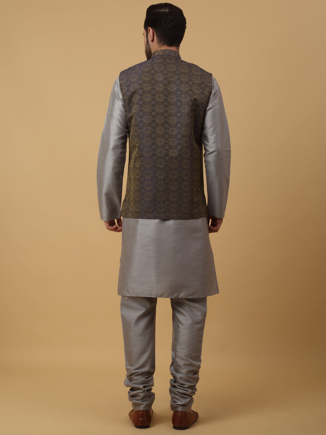 KRAFT INDIA Men's Silk Blend Grey Kurta, Churidar with Jacquard Bandhani Silk Blend Nehru Jacket Set