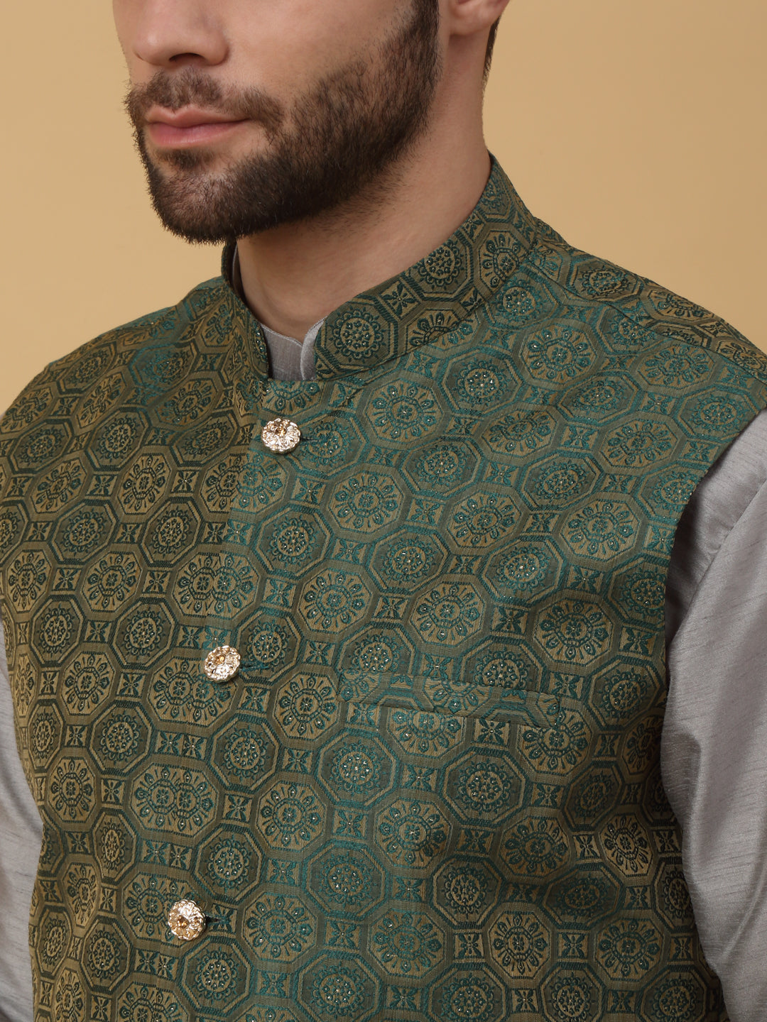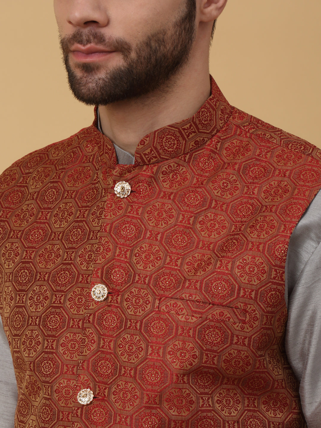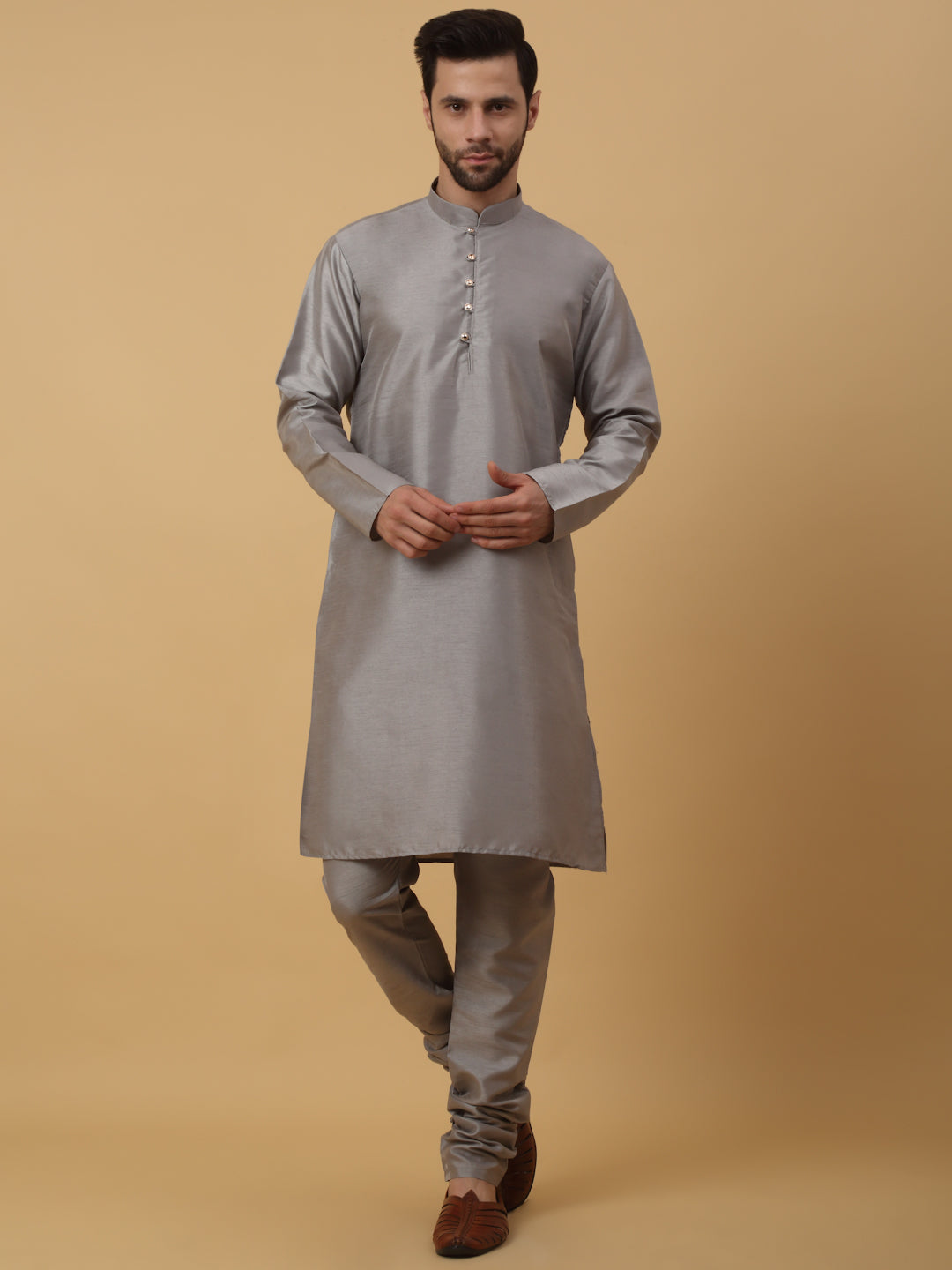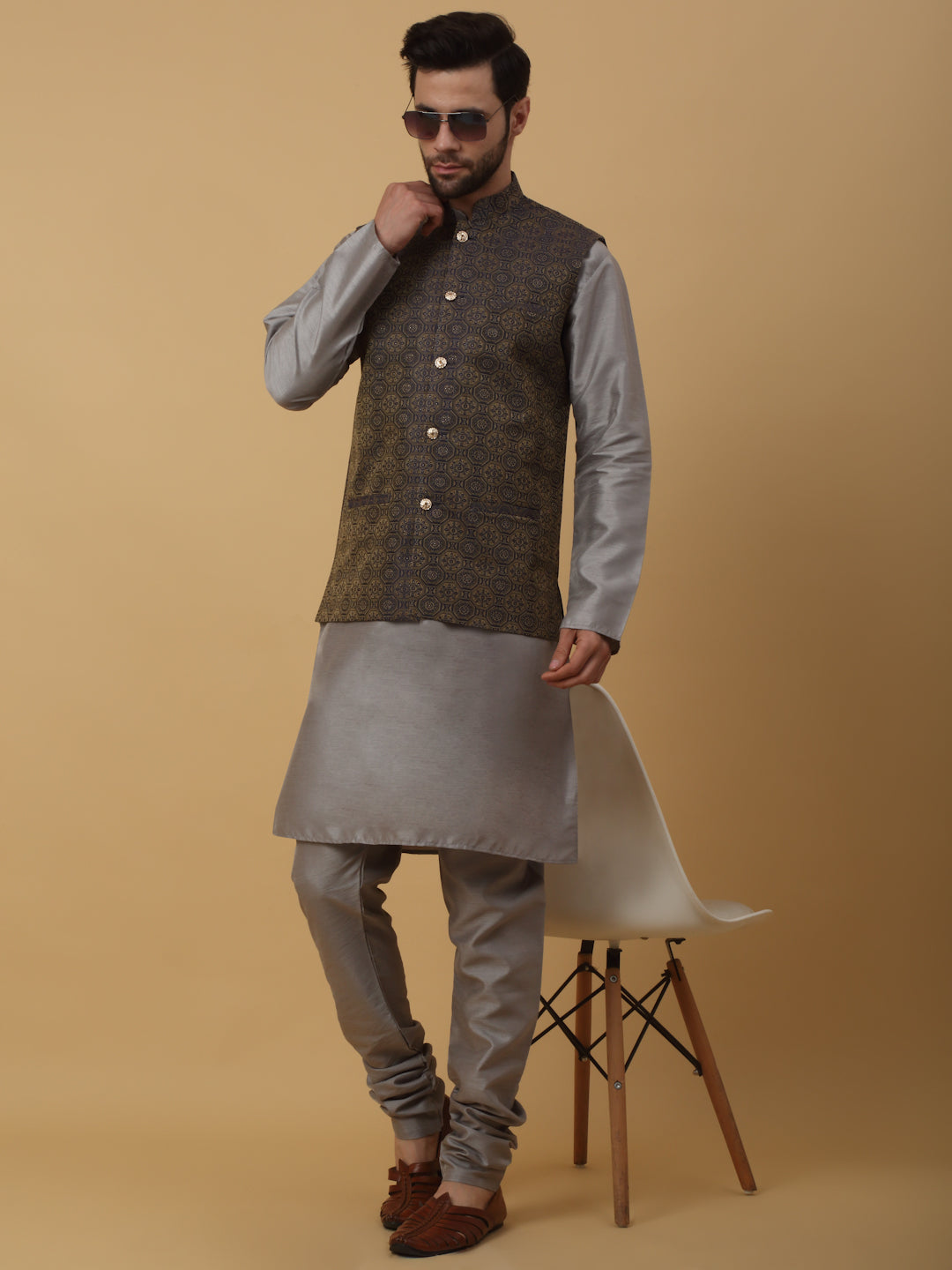KRAFT INDIA Men's Silk Blend Grey Kurta, Churidar with Jacquard Bandhani Silk Blend Nehru Jacket Set