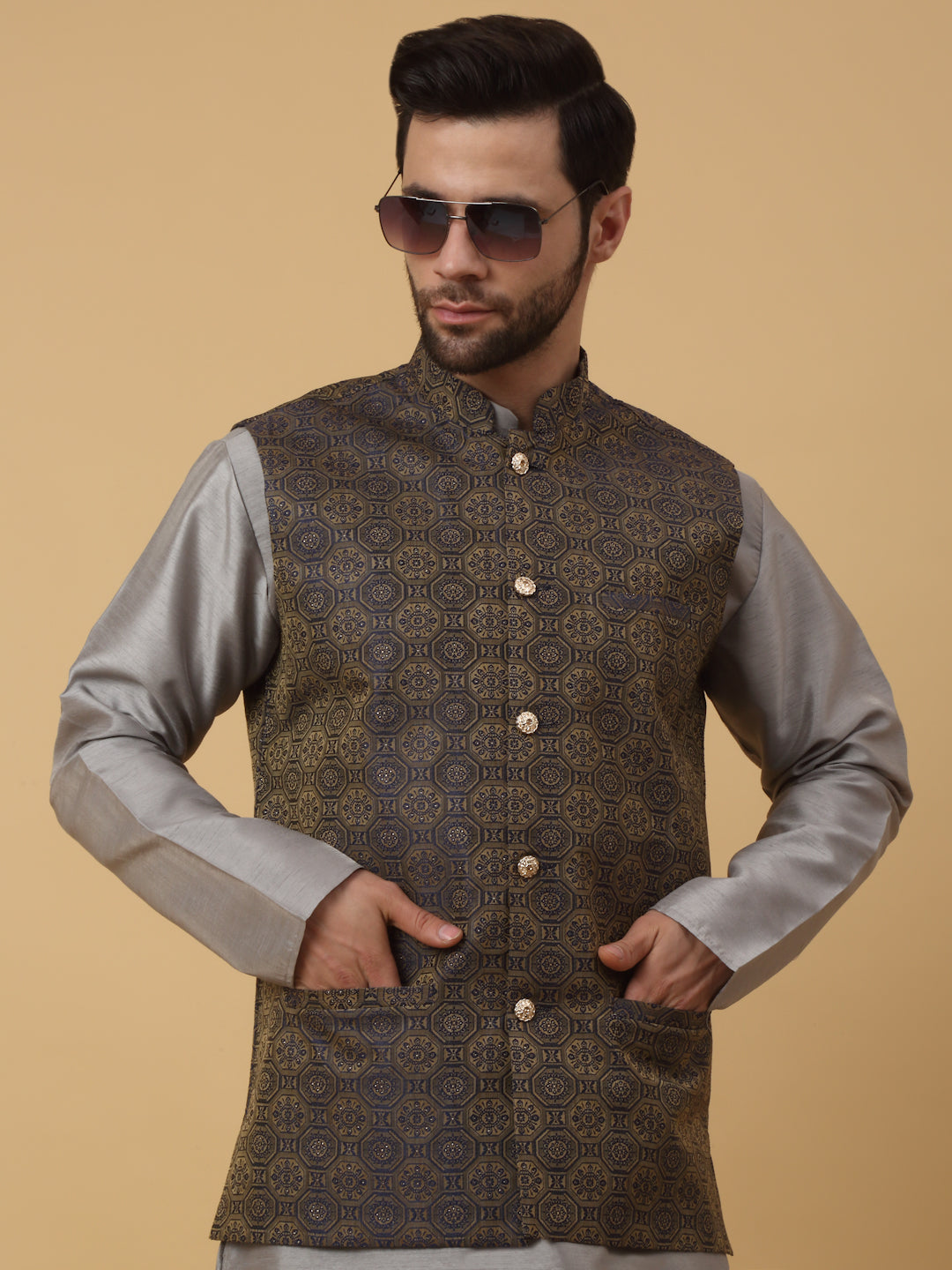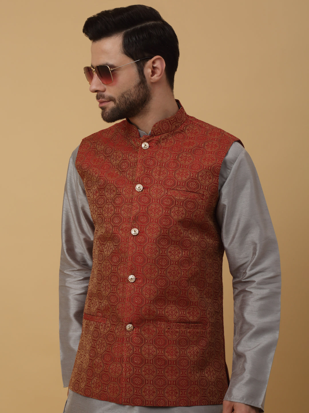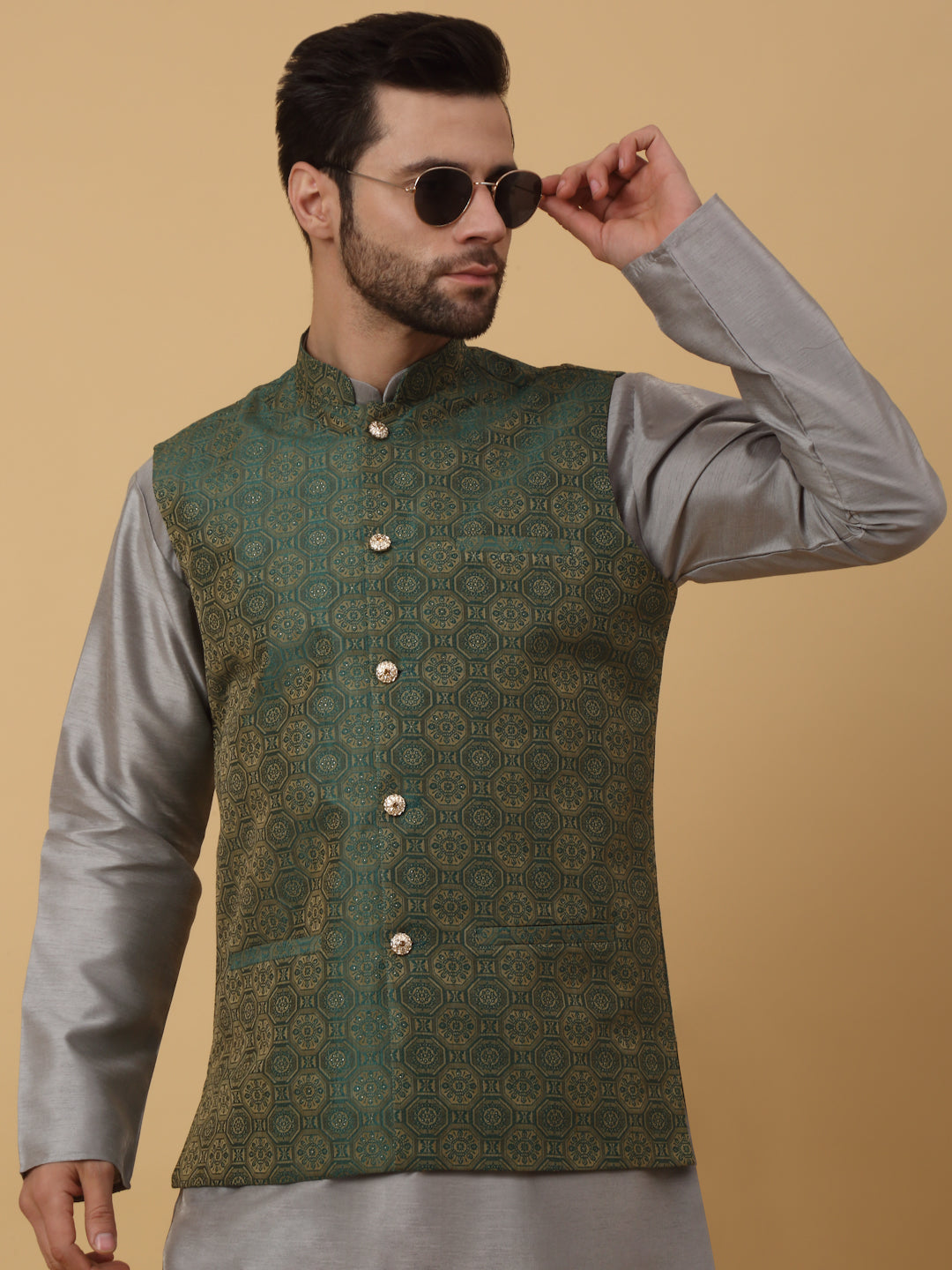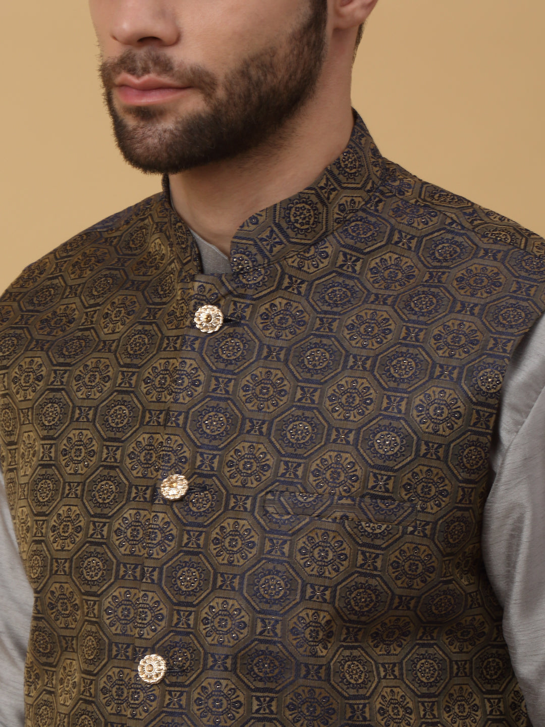 KRAFT INDIA Men's Silk Blend Grey Kurta, Churidar with Jacquard Bandhani Silk Blend Nehru Jacket Set
