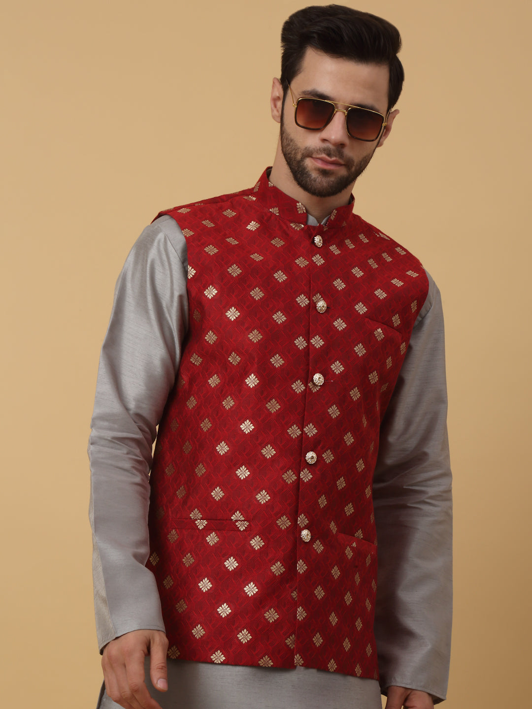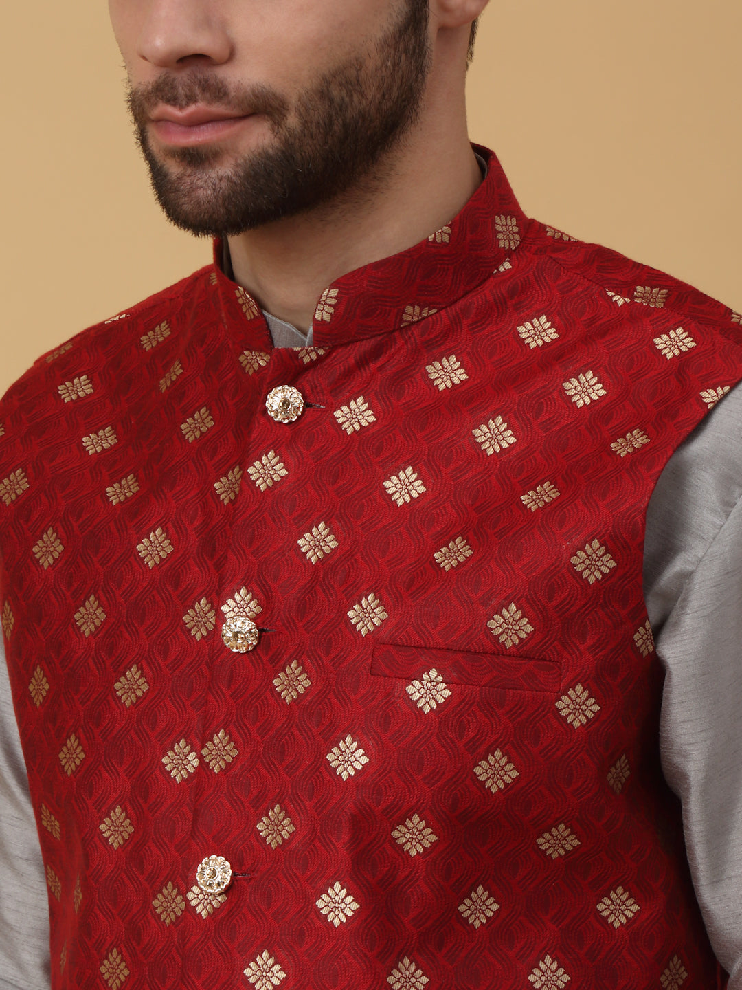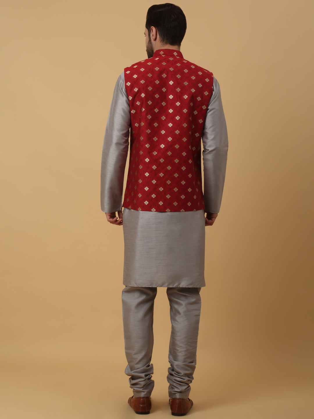 KRAFT INDIA Men's Silk Blend Grey Kurta, Churidar with Jacquard Silk Blend Floral Print Nehru Jacket Set