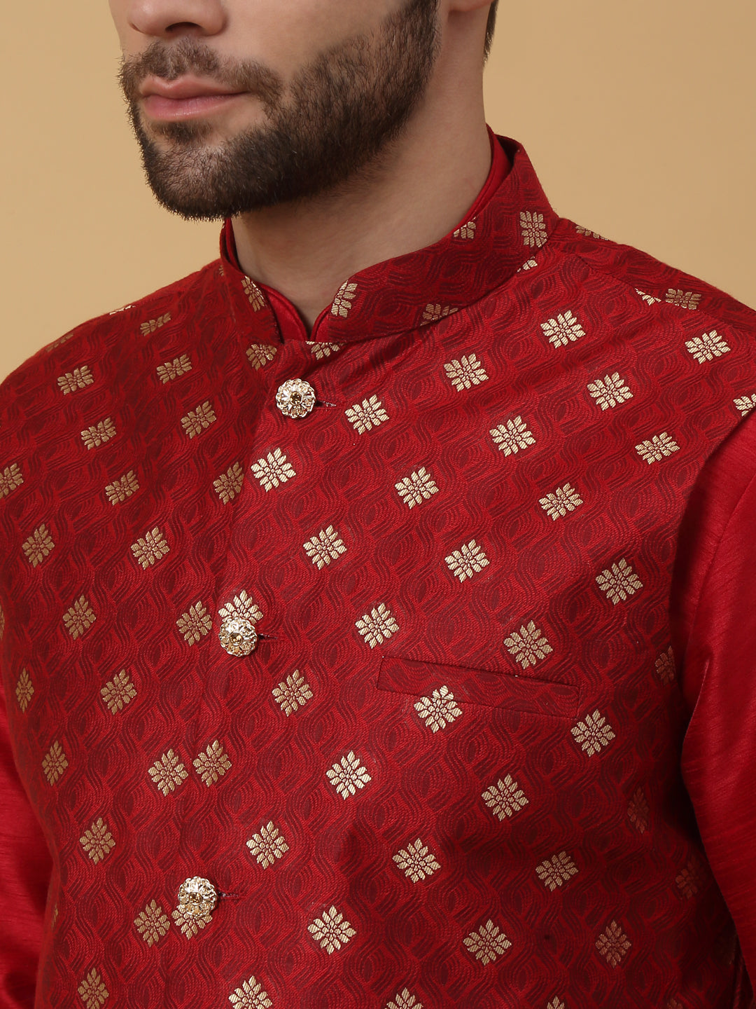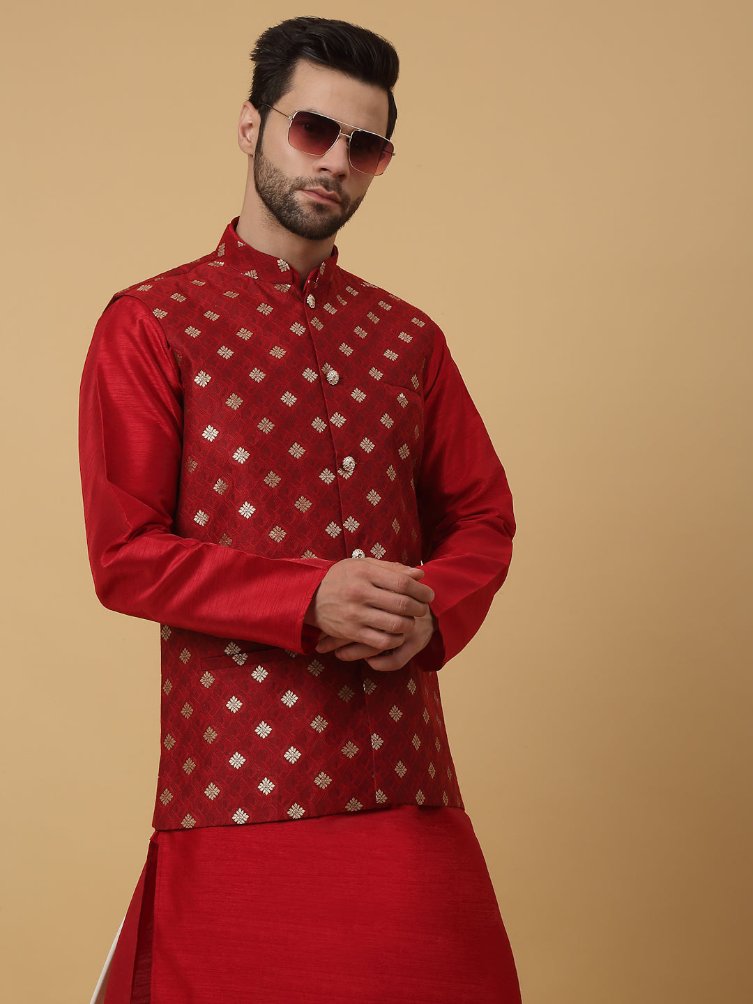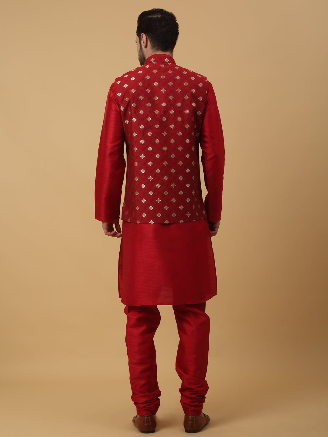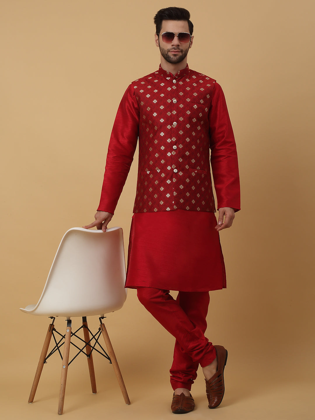 KRAFT INDIA Men's Silk Blend Maroon Kurta, Churidar with Jacquard Silk Blend Floral Print Nehru Jacket Set