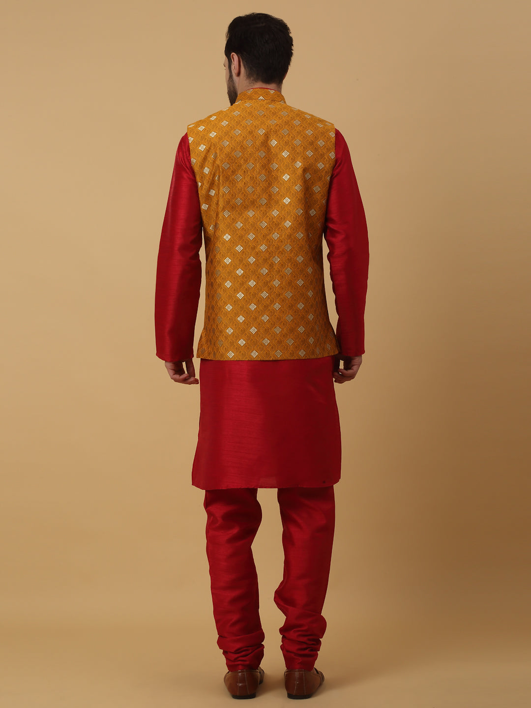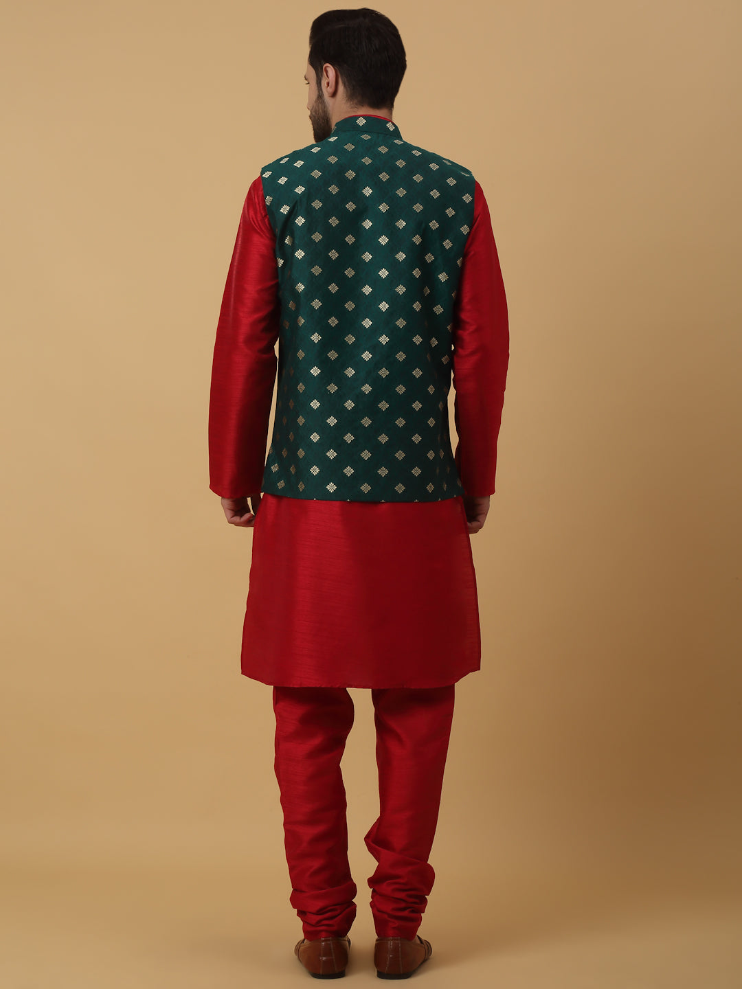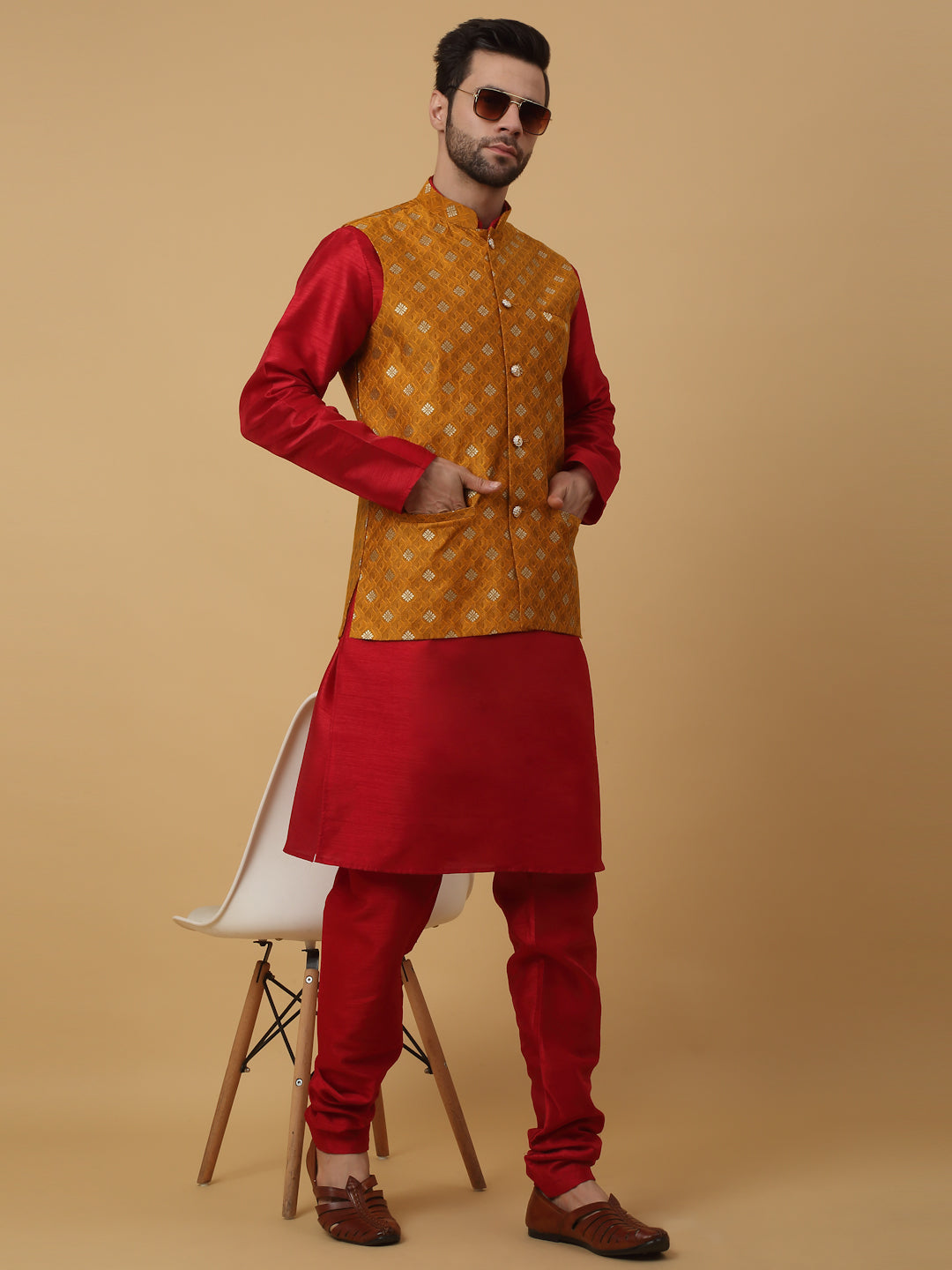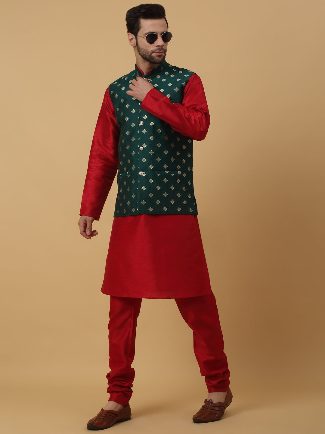 KRAFT INDIA Men's Silk Blend Maroon Kurta, Churidar with Jacquard Silk Blend Floral Print Nehru Jacket Set