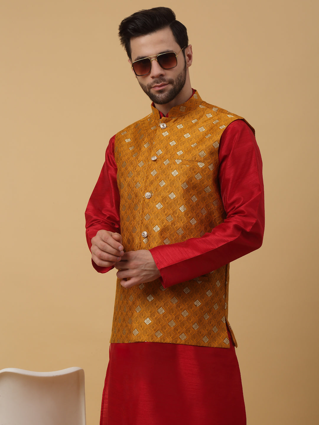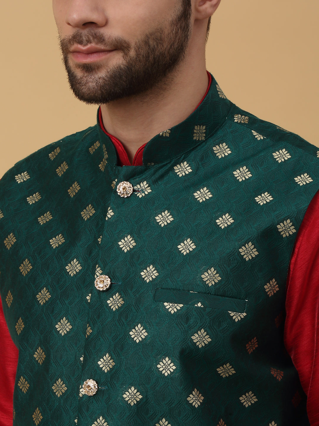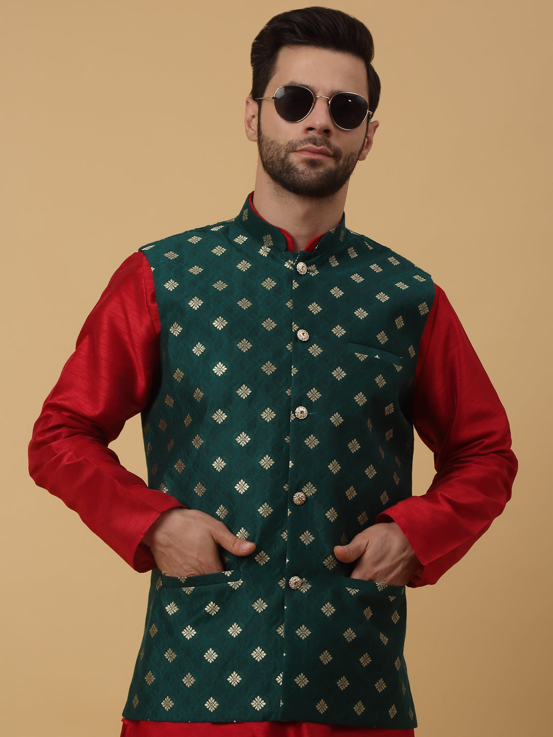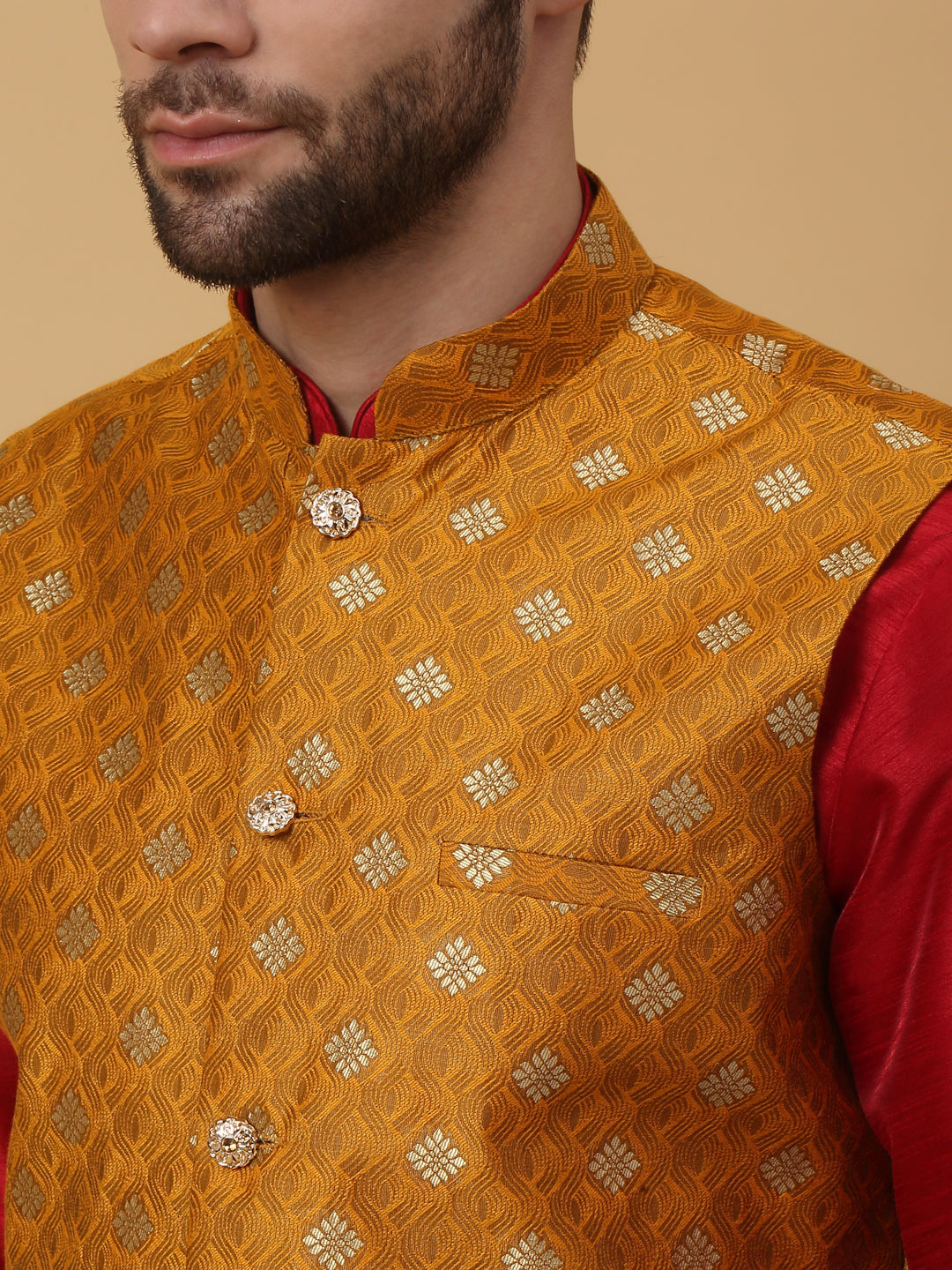 KRAFT INDIA Men's Silk Blend Maroon Kurta, Churidar with Jacquard Silk Blend Floral Print Nehru Jacket Set