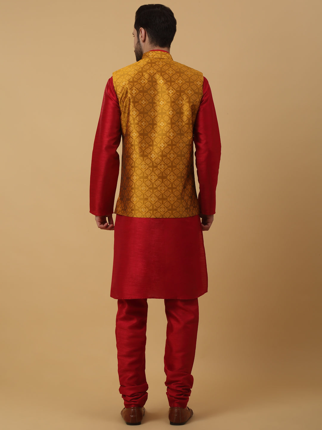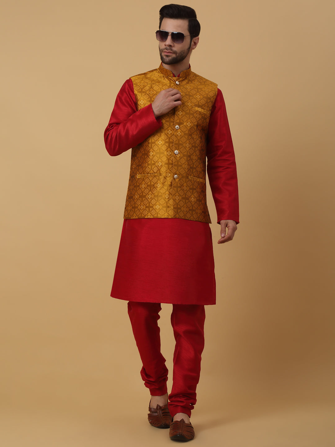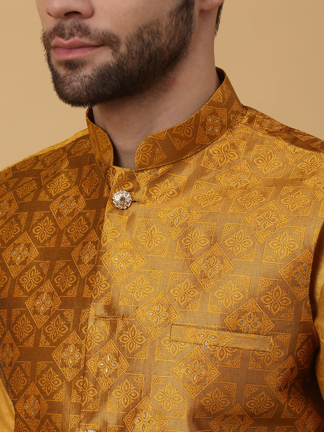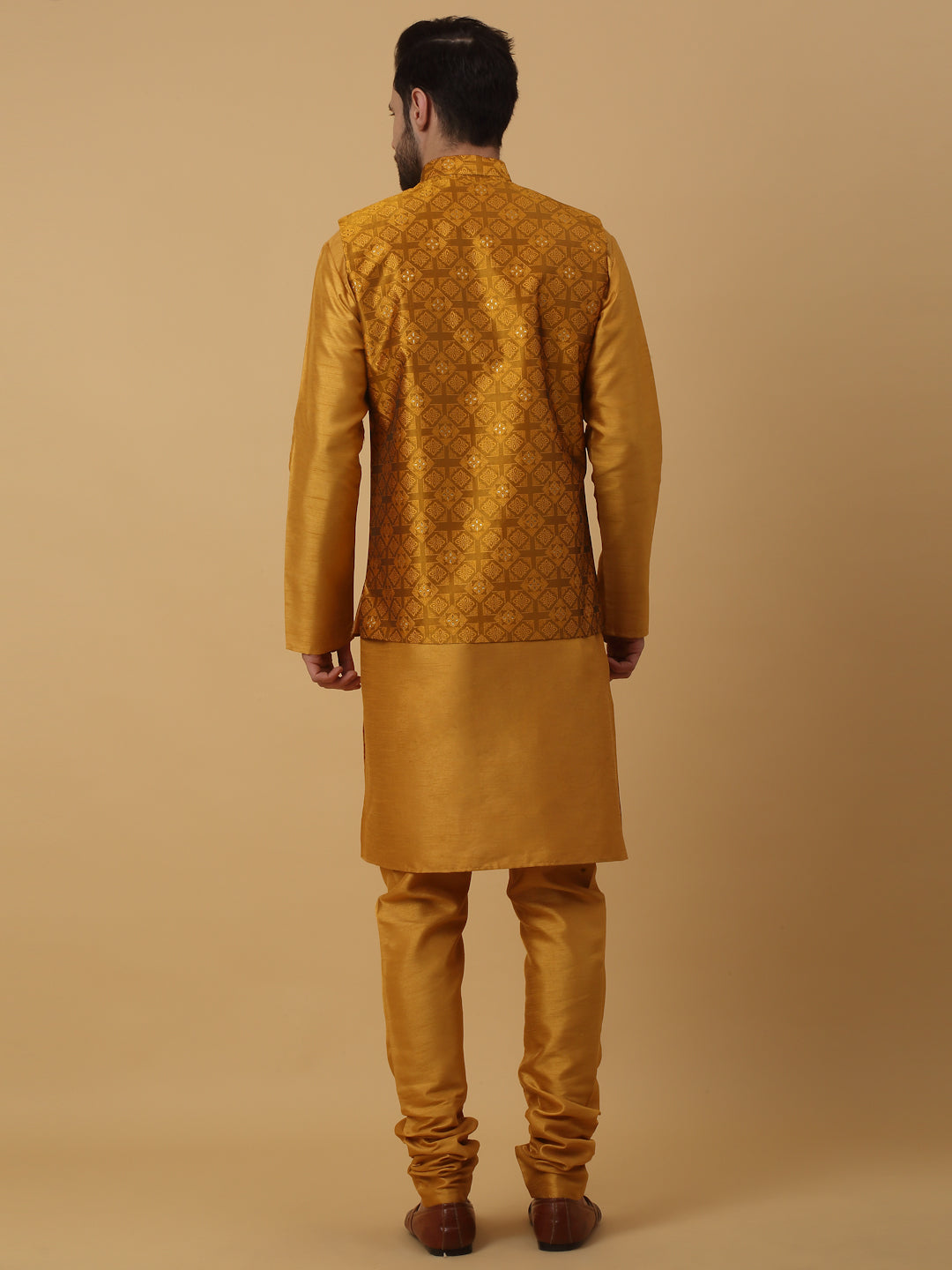 KRAFT INDIA Men's Silk Blend Mustard Kurta, Churidar with Jacquard Silk Blend Floral Nehru Jacket Set