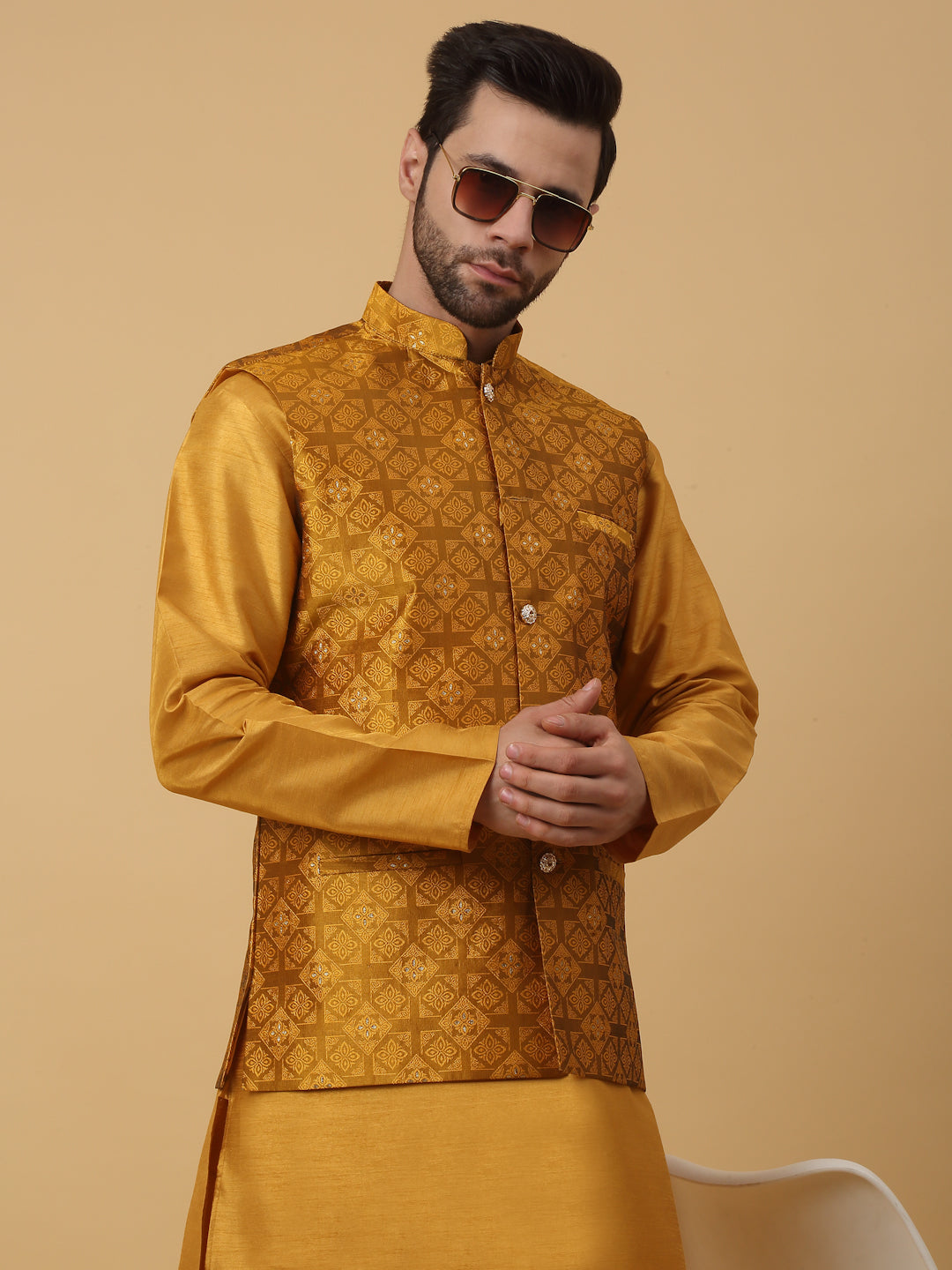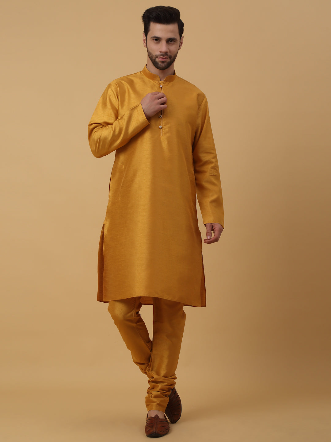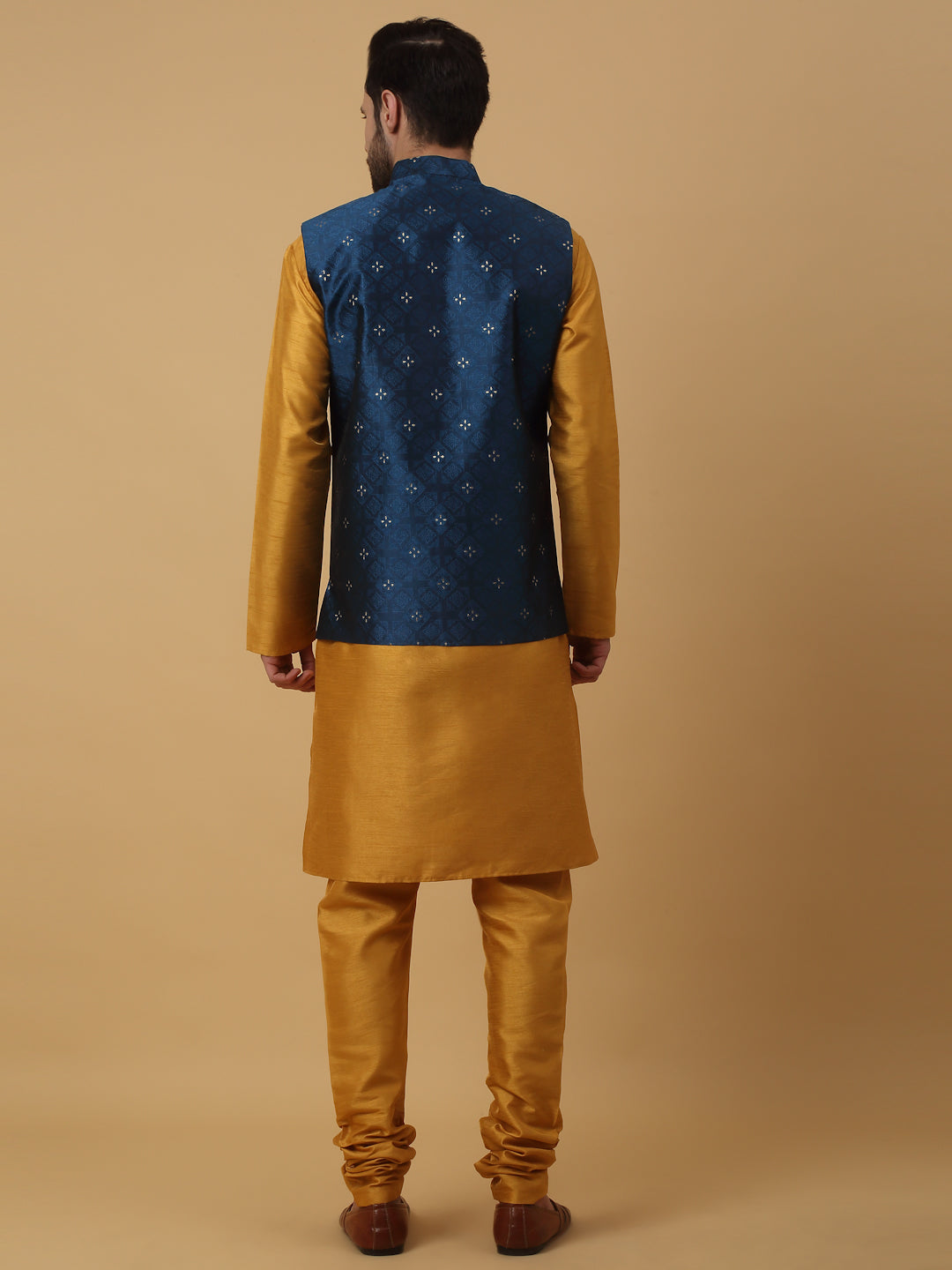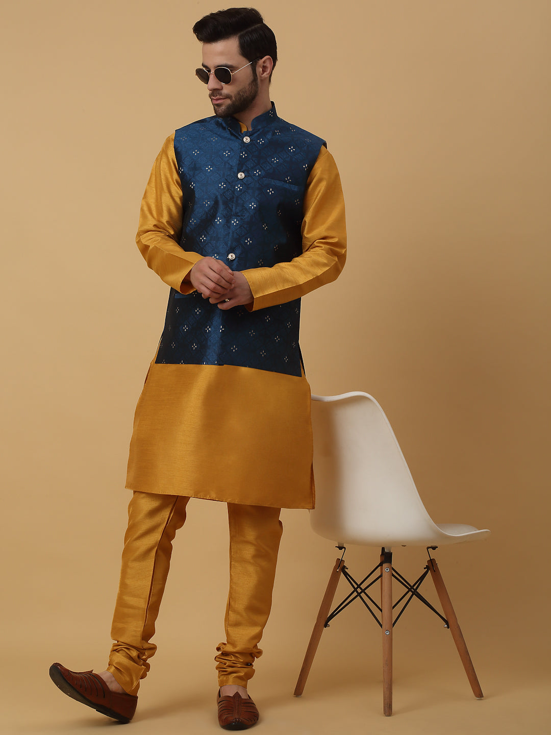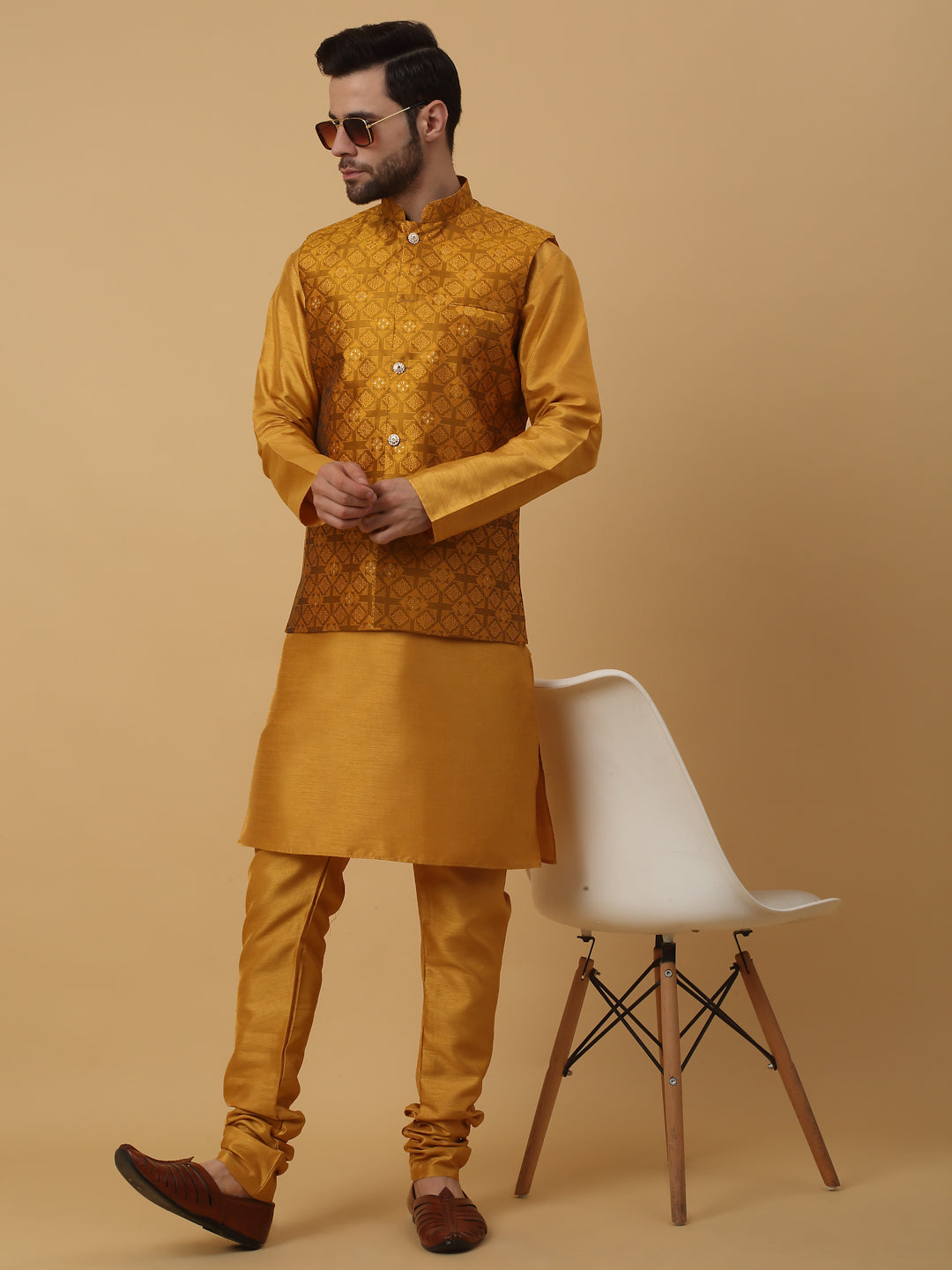 KRAFT INDIA Men's Silk Blend Mustard Kurta, Churidar with Jacquard Silk Blend Floral Nehru Jacket Set