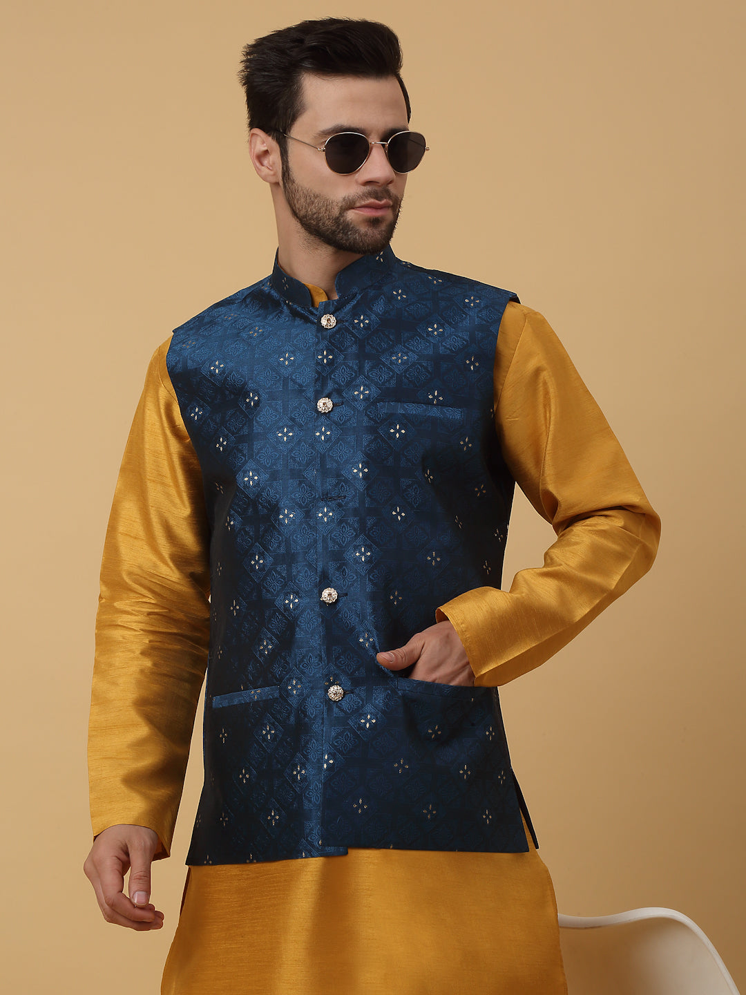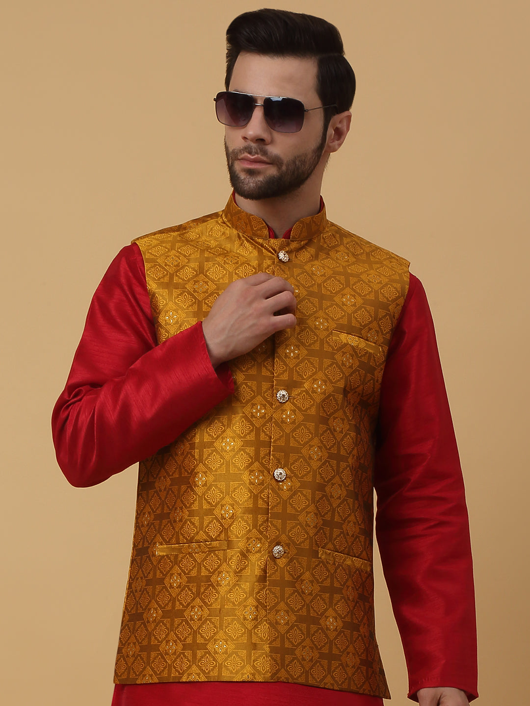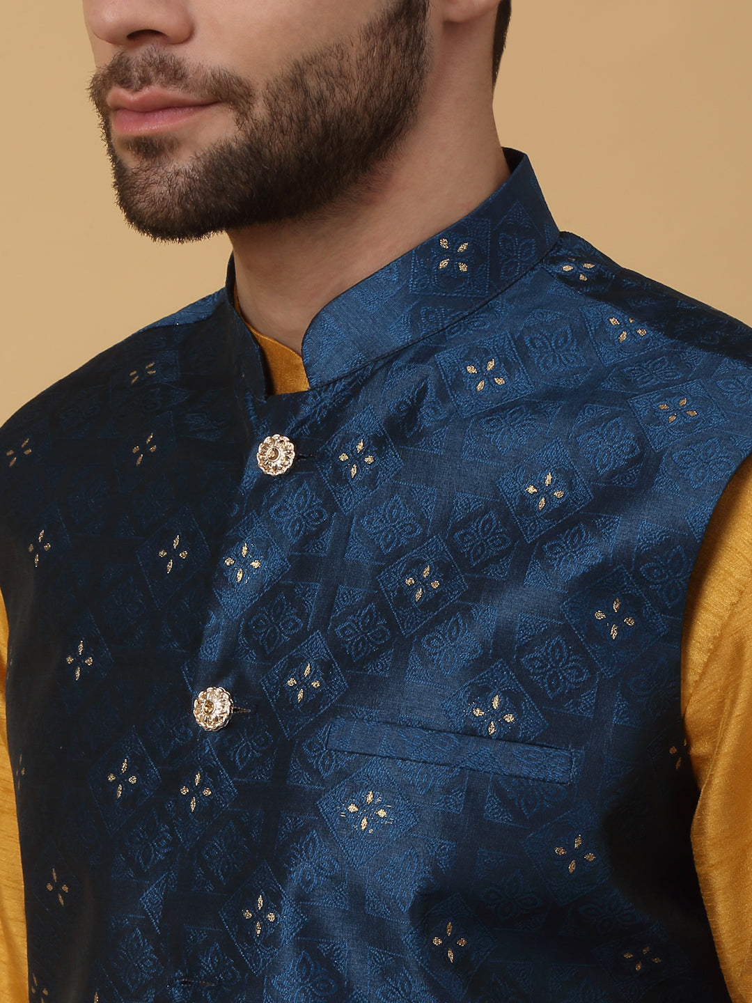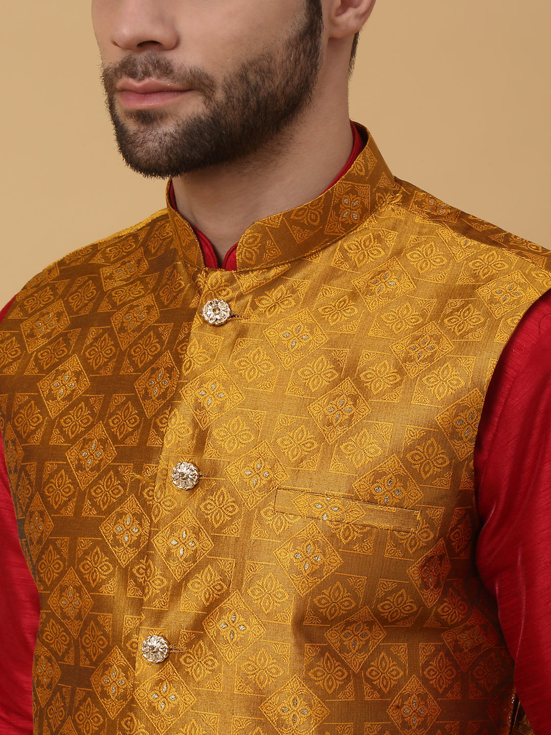KRAFT INDIA Men's Silk Blend Mustard Kurta, Churidar with Jacquard Silk Blend Floral Nehru Jacket Set