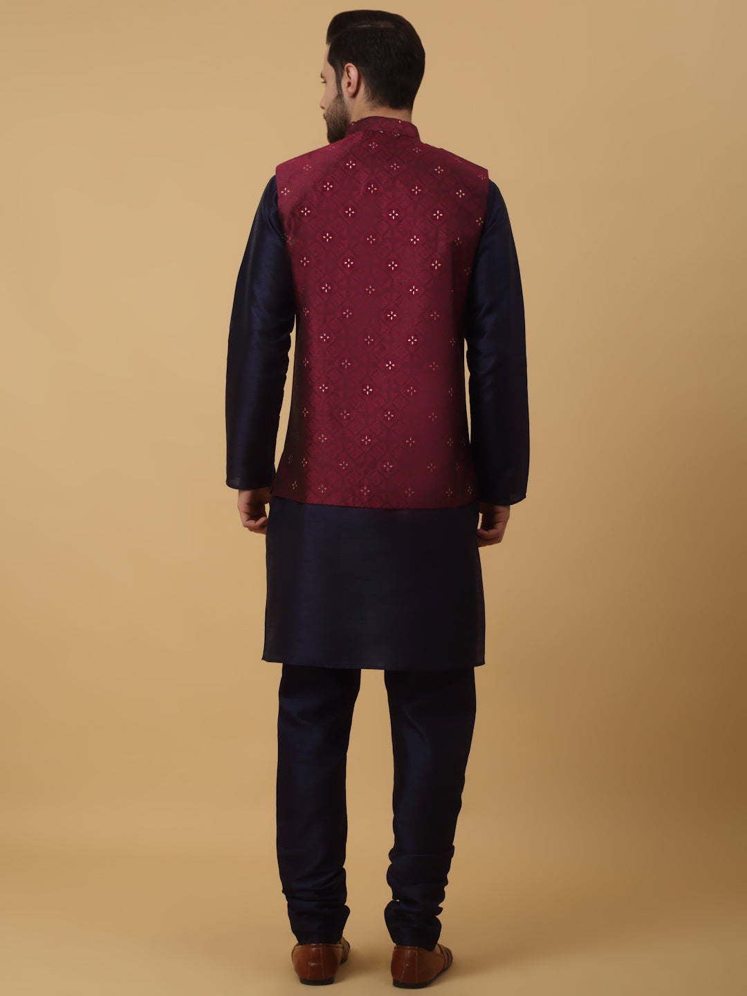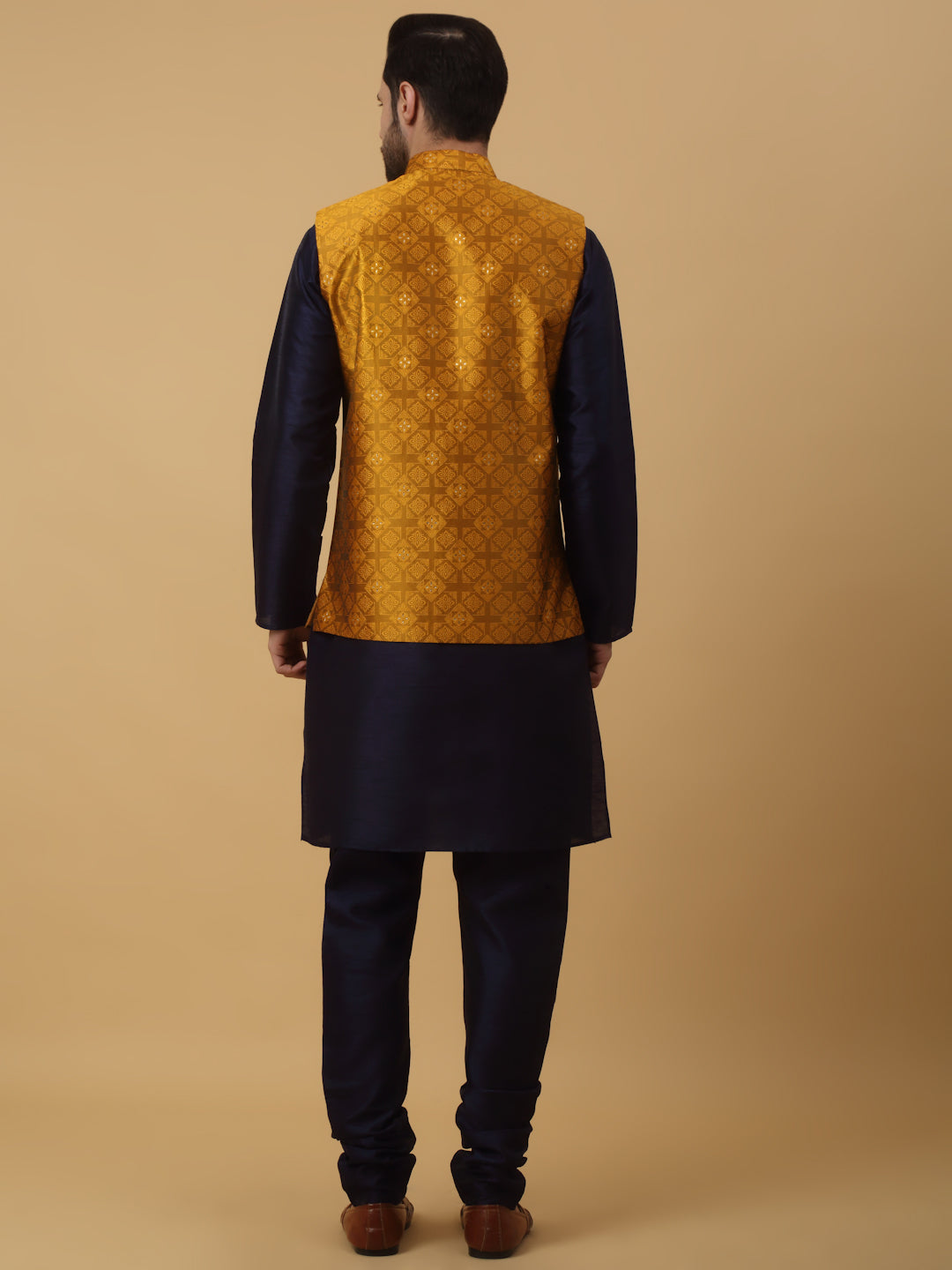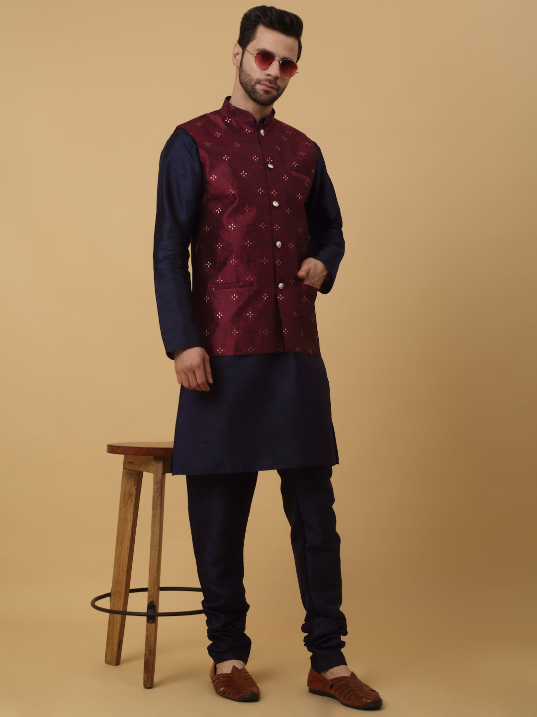 KRAFT INDIA Men's Silk Blend Navy Blue Kurta, Churidar with Jacquard Silk Blend Floral Nehru Jacket Set