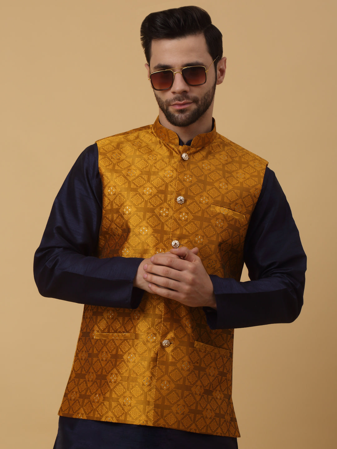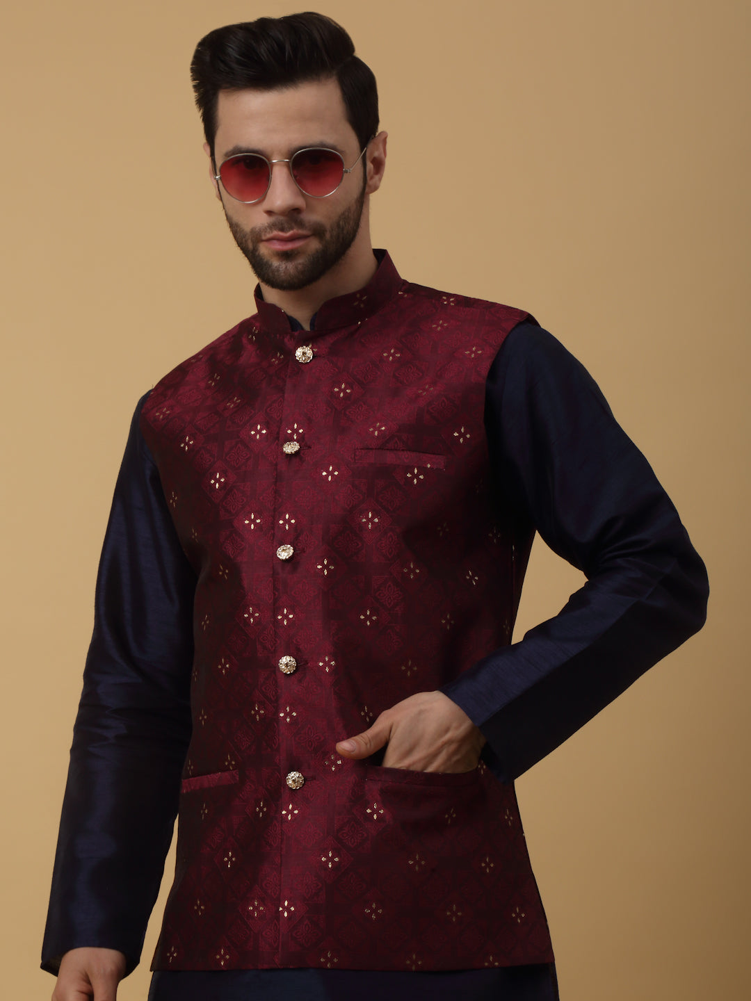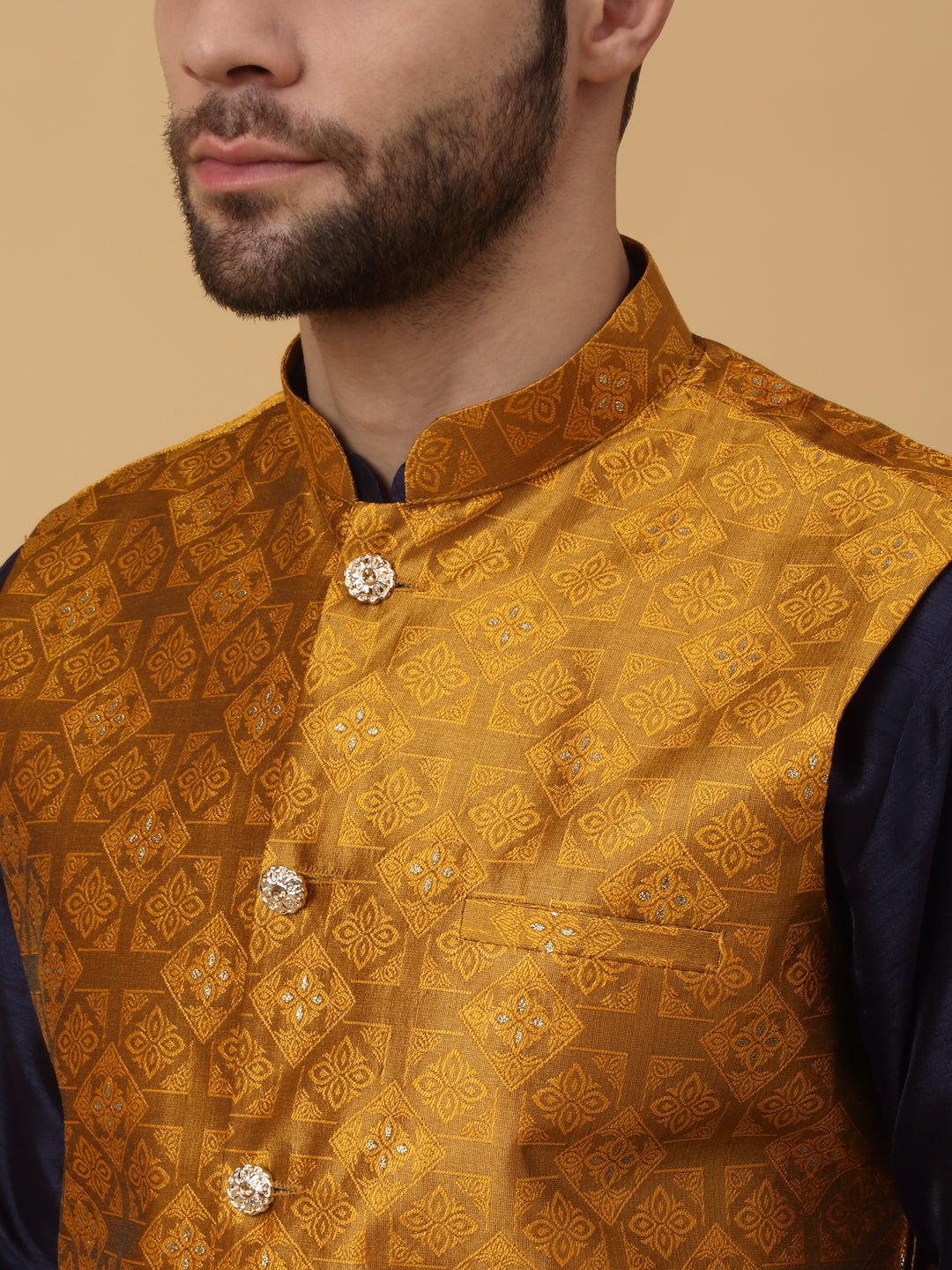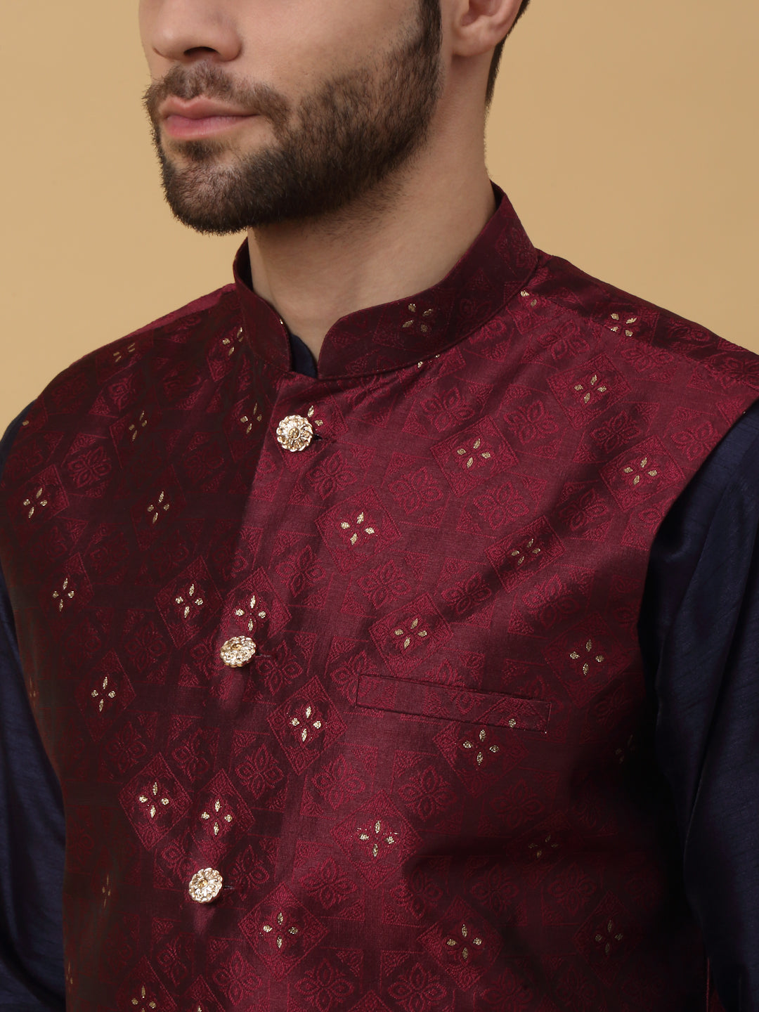 KRAFT INDIA Men's Silk Blend Navy Blue Kurta, Churidar with Jacquard Silk Blend Floral Nehru Jacket Set