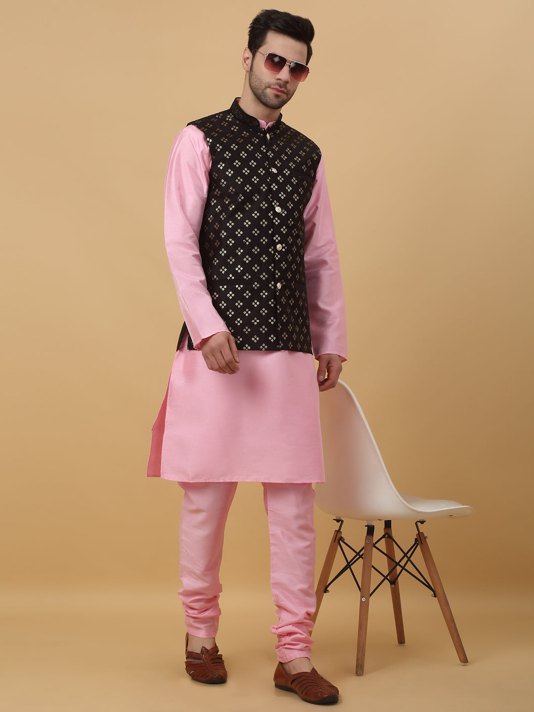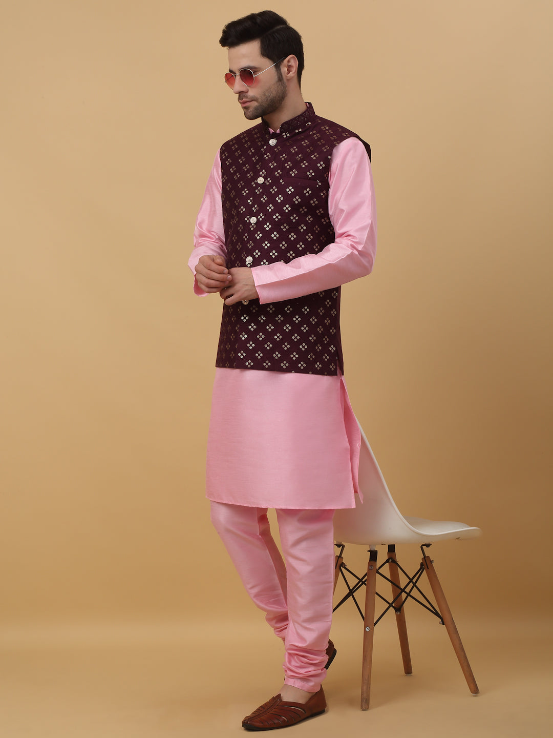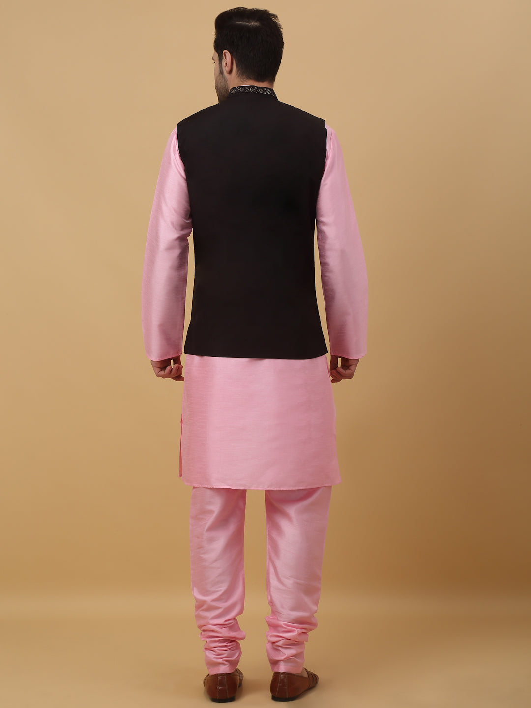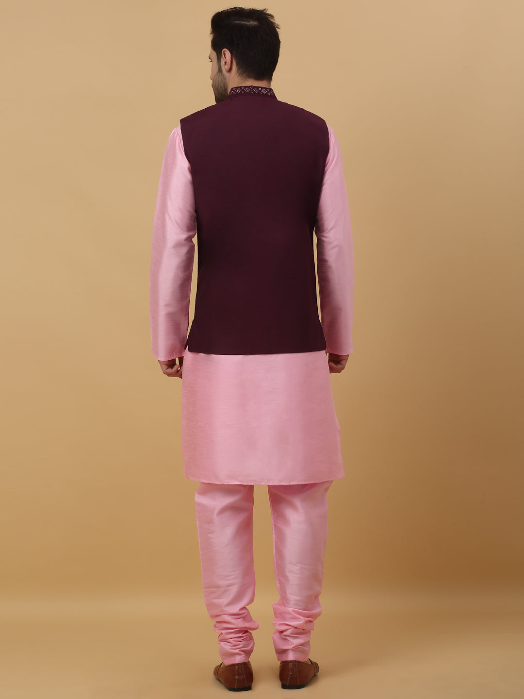 KRAFT INDIA Men's Silk Blend Pink Kurta, Churidar with Cotton Silk Embroided Sequenced Nehru Jacket Set