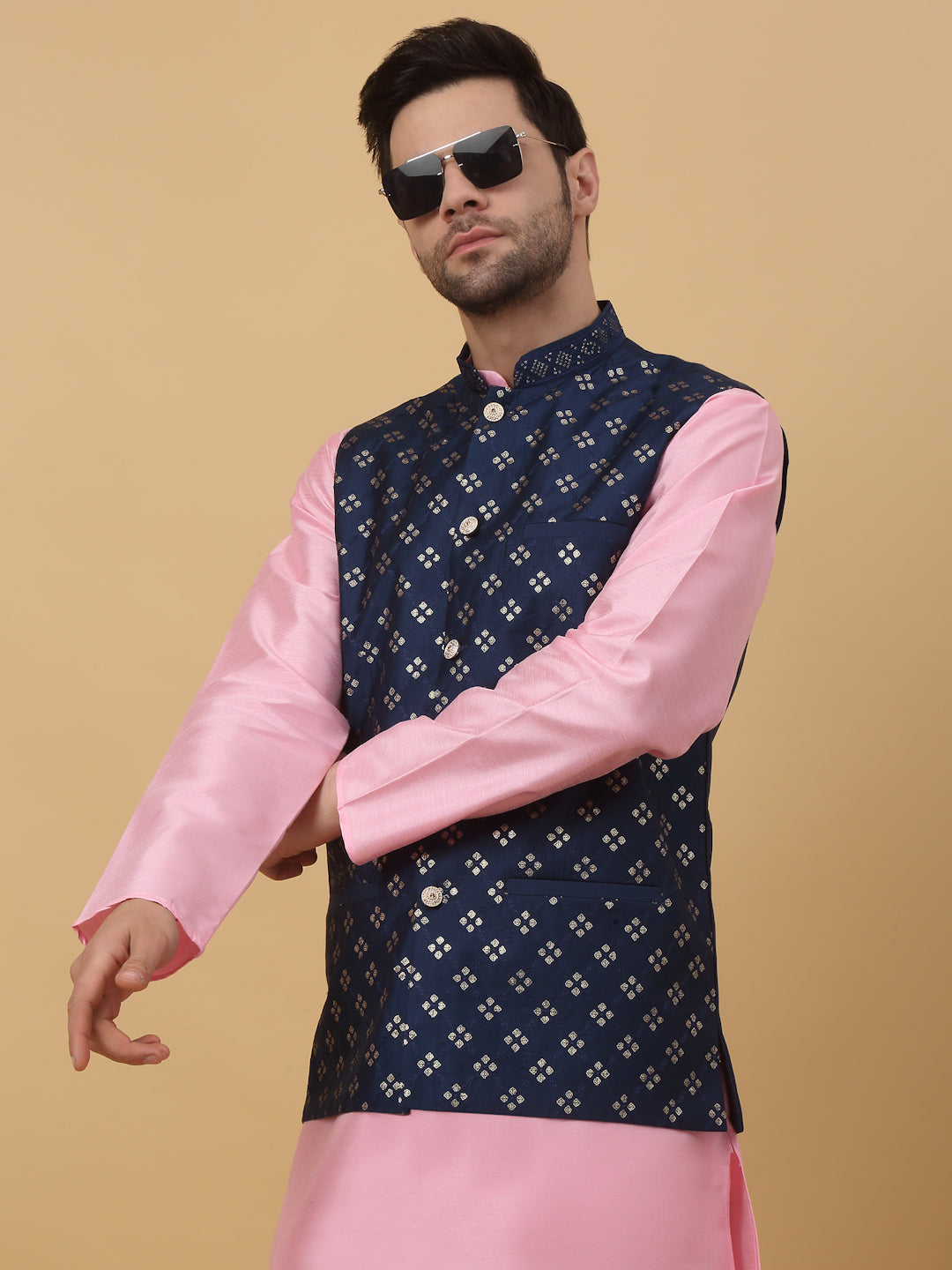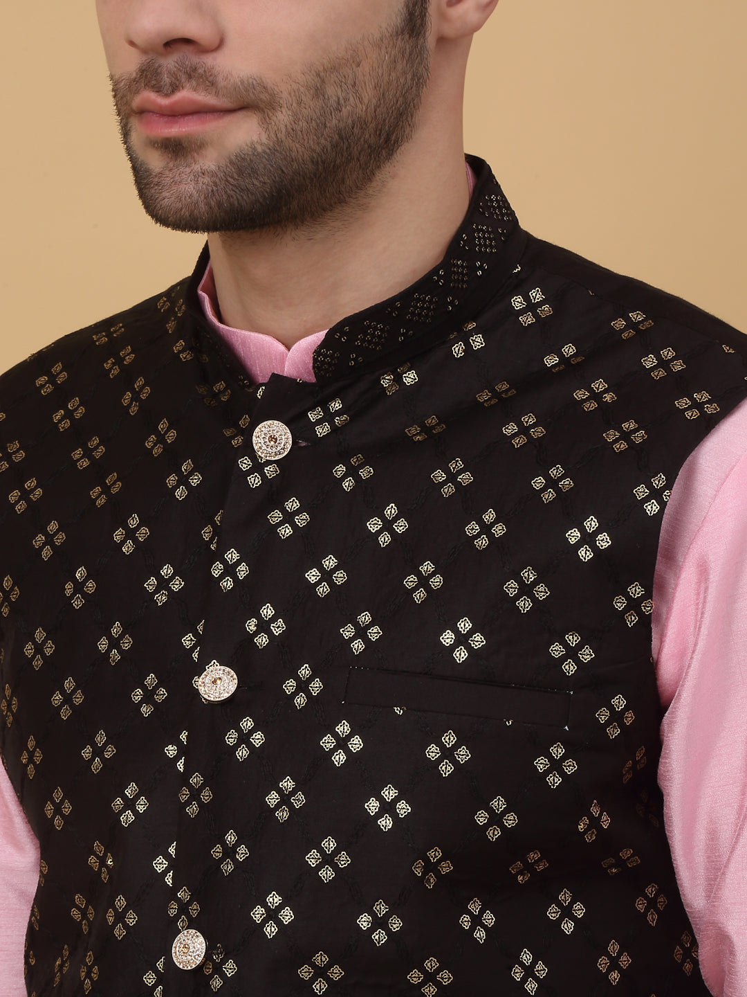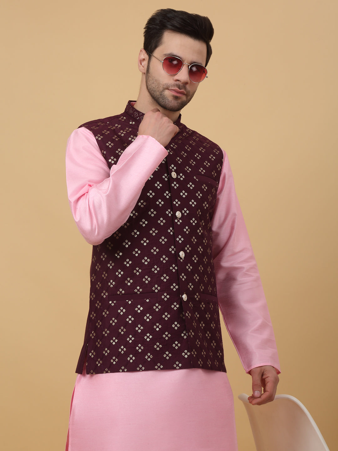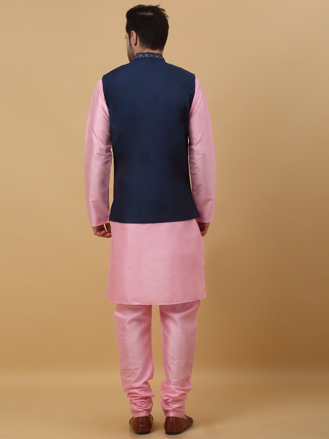 KRAFT INDIA Men's Silk Blend Pink Kurta, Churidar with Cotton Silk Embroided Sequenced Nehru Jacket Set