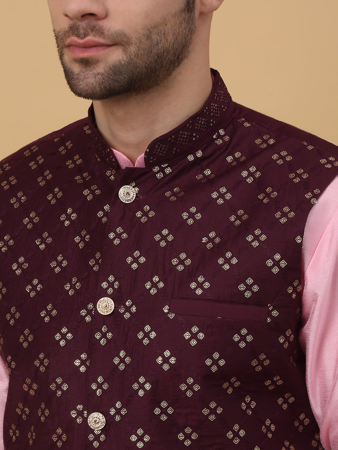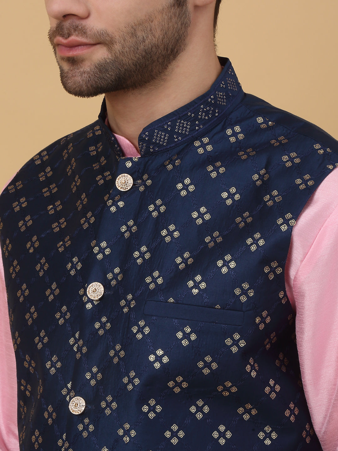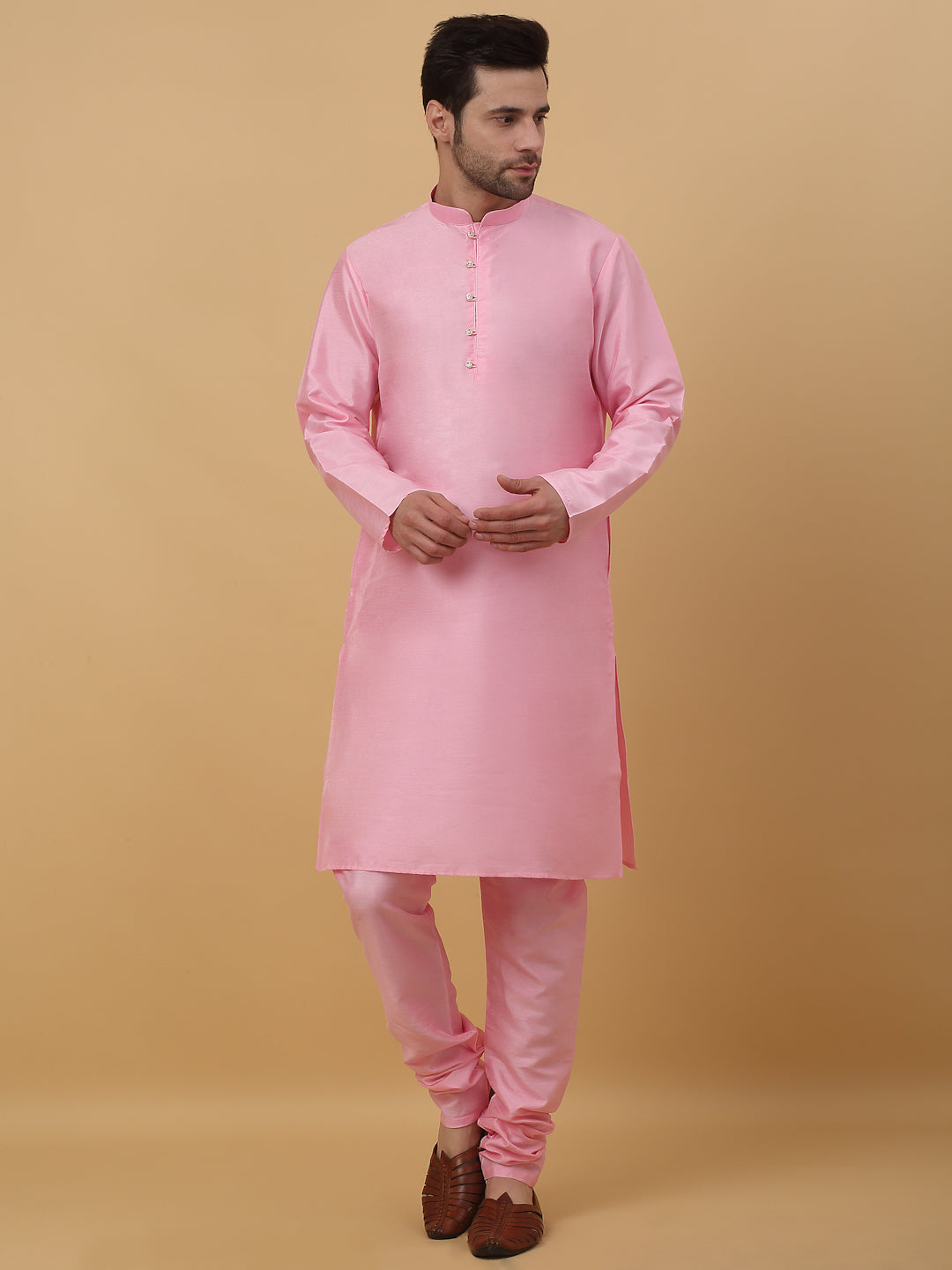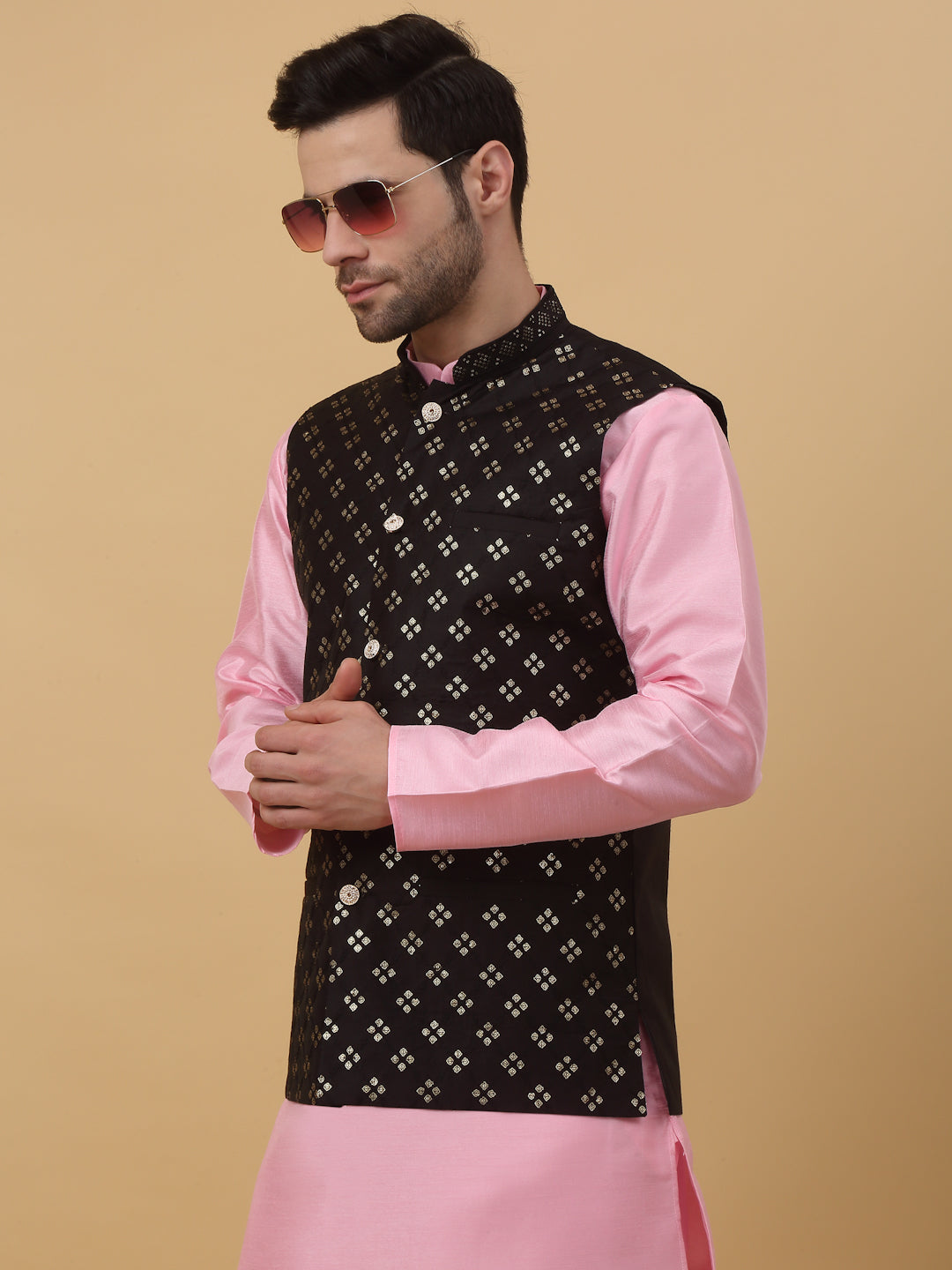 KRAFT INDIA Men's Silk Blend Pink Kurta, Churidar with Cotton Silk Embroided Sequenced Nehru Jacket Set