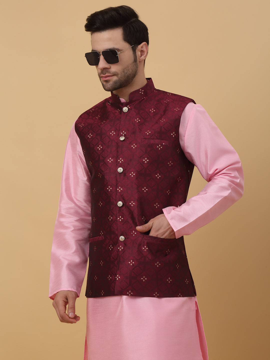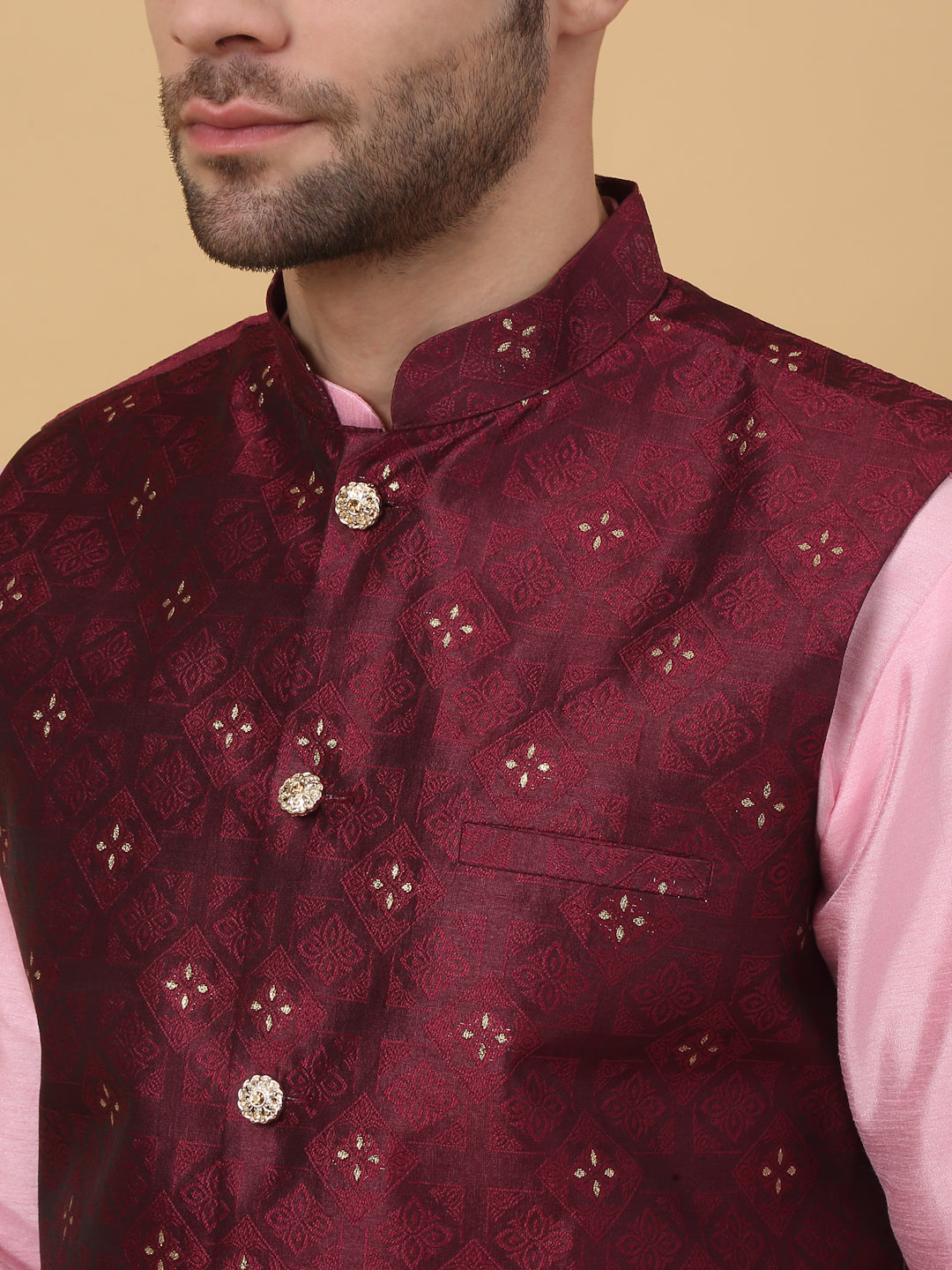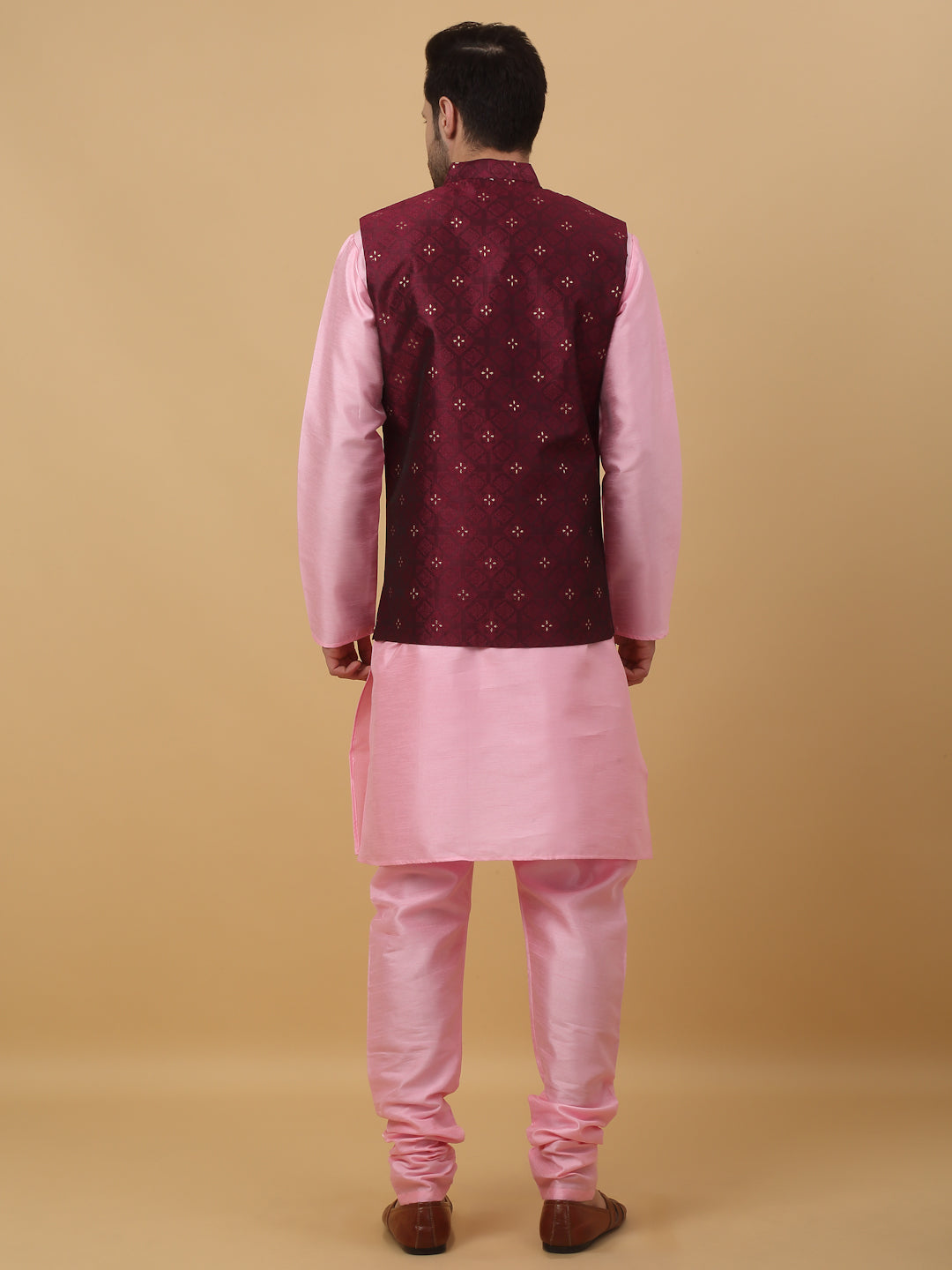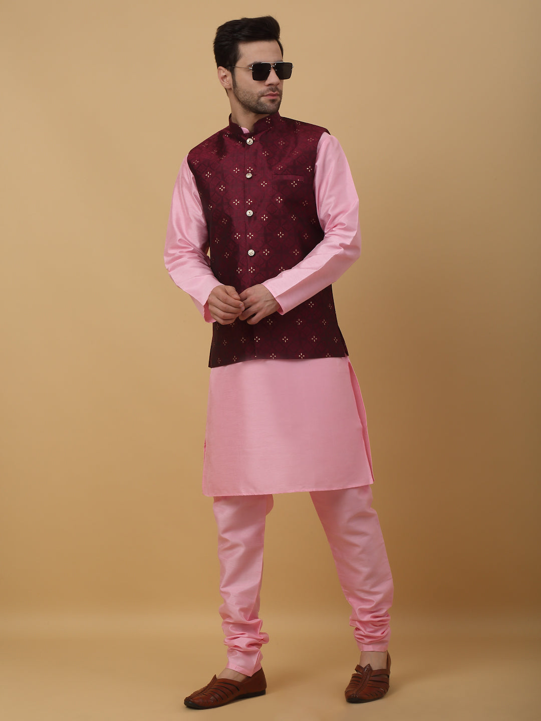KRAFT INDIA Men's Silk Blend Pink Kurta, Churidar with Jacquard Silk Blend Floral Nehru Jacket Set