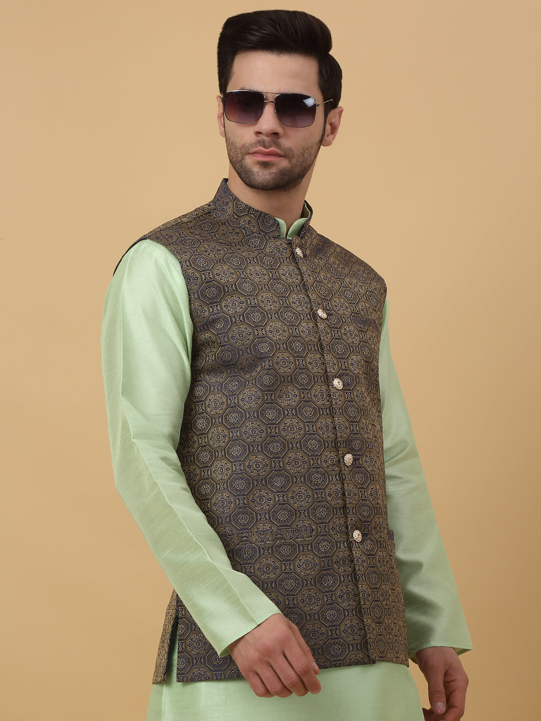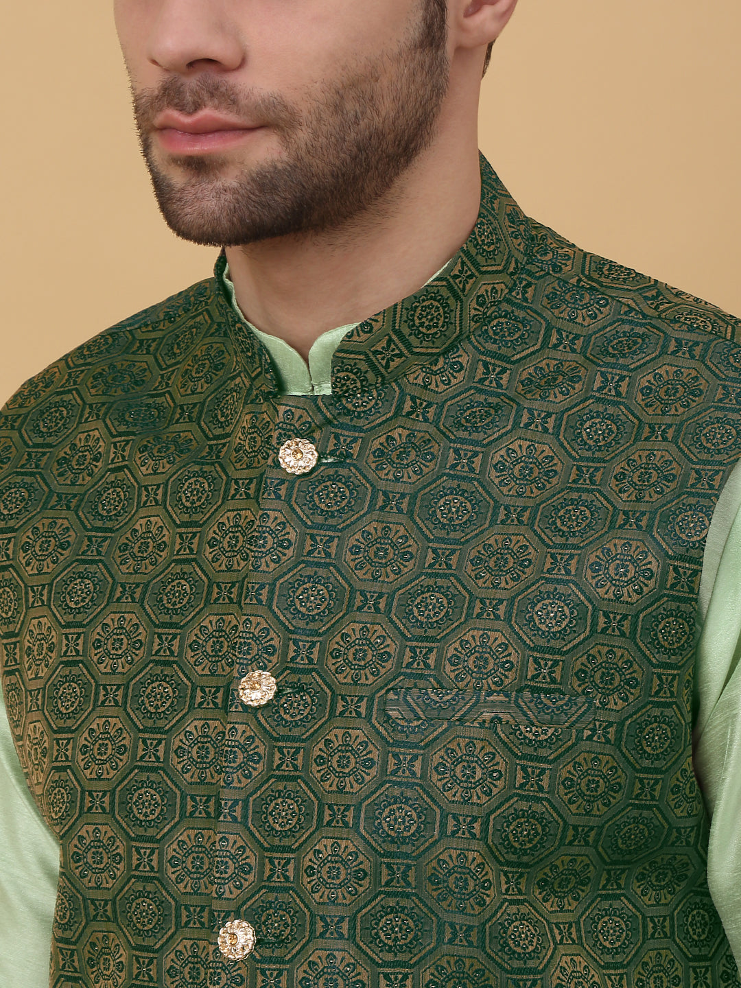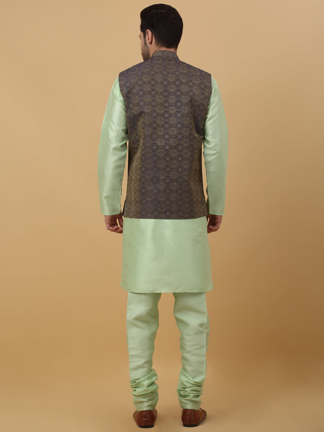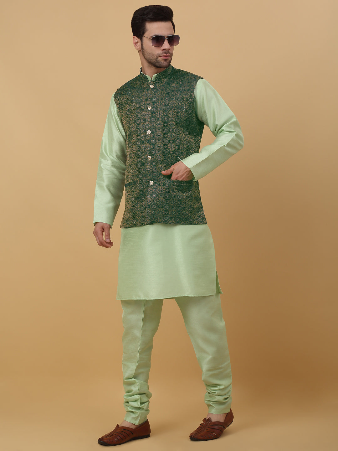 KRAFT INDIA Men's Silk Blend Sea Green Kurta, Churidar with Jacquard Bandhani Silk Blend Nehru Jacket Set