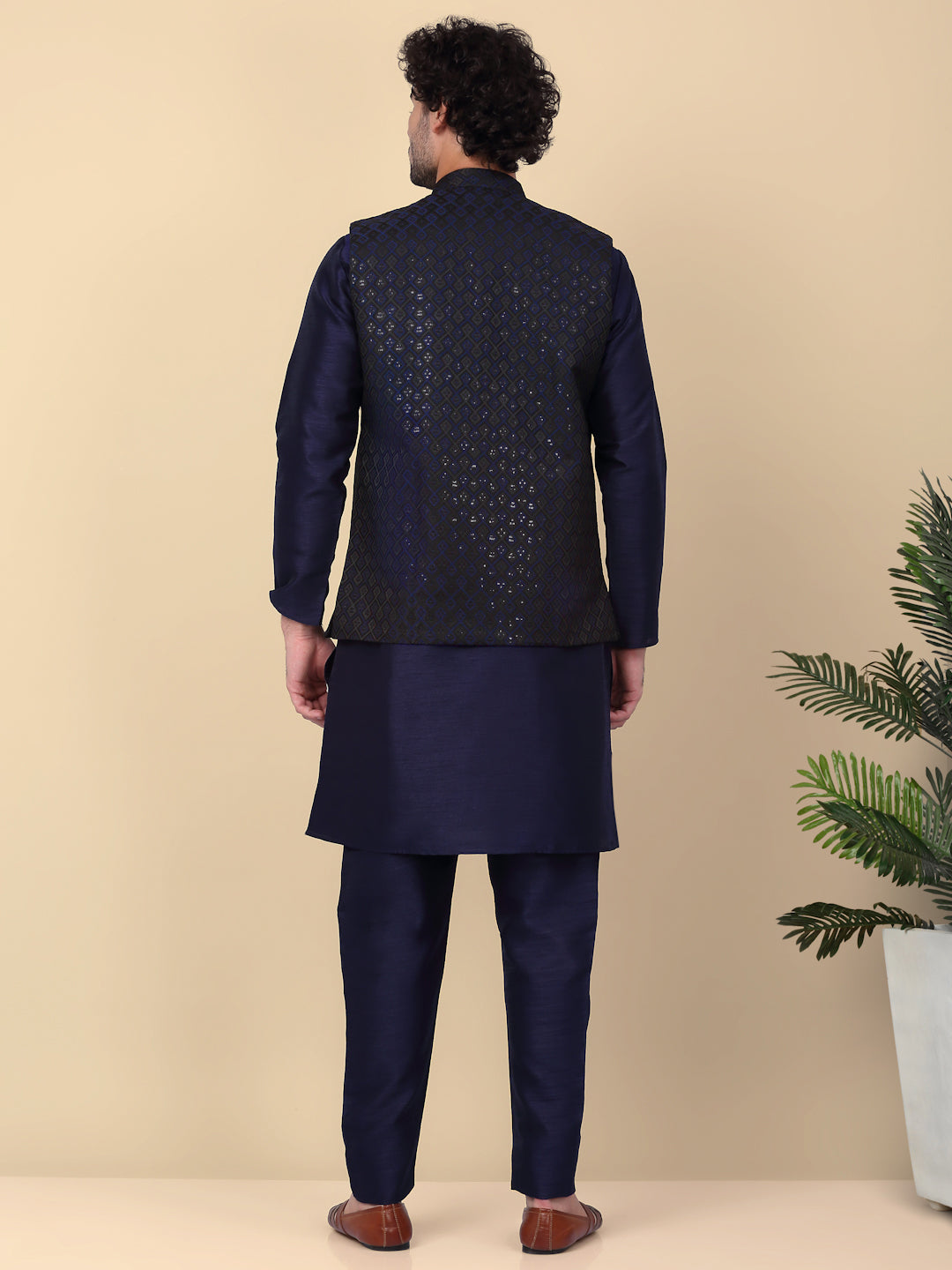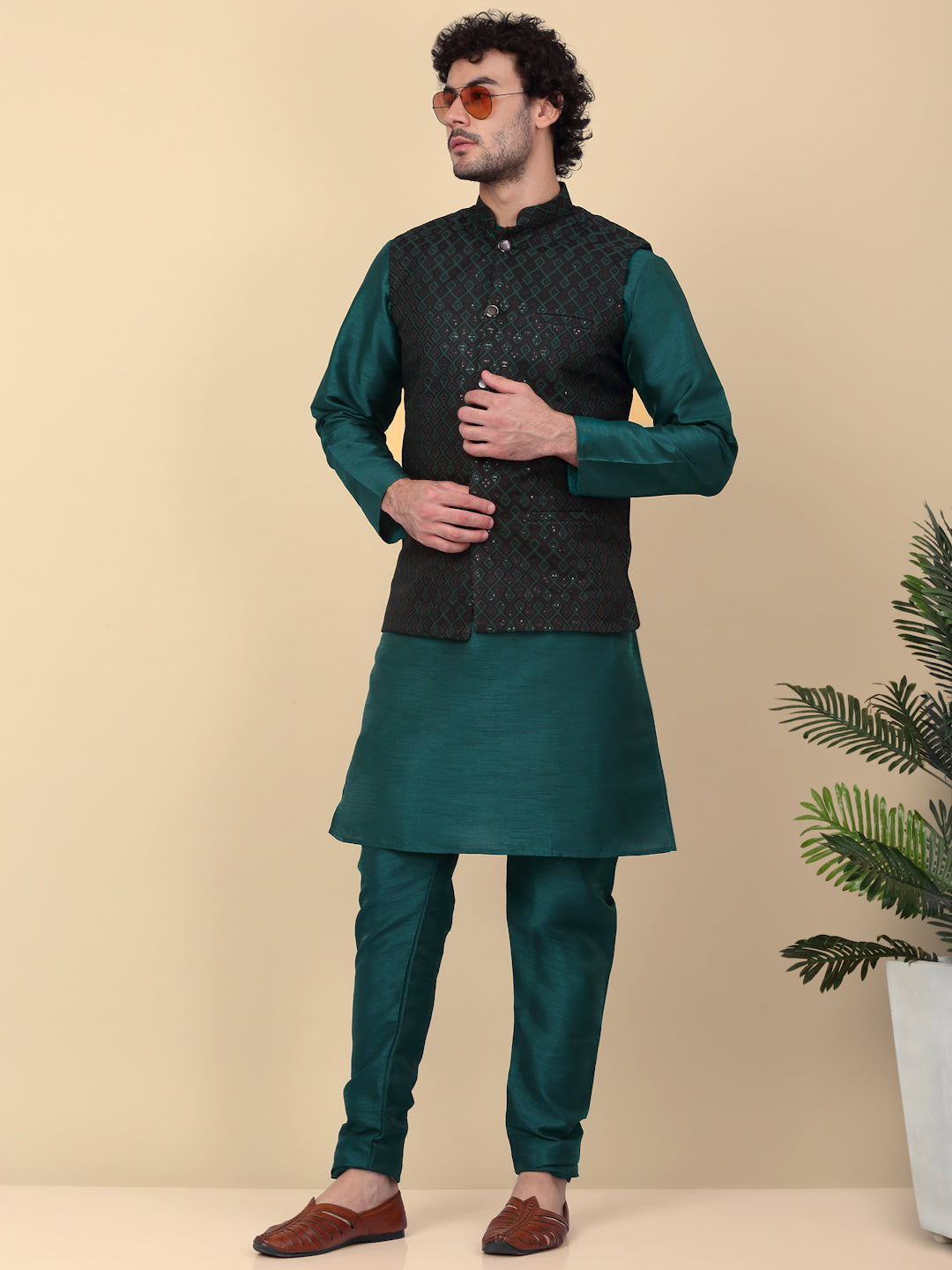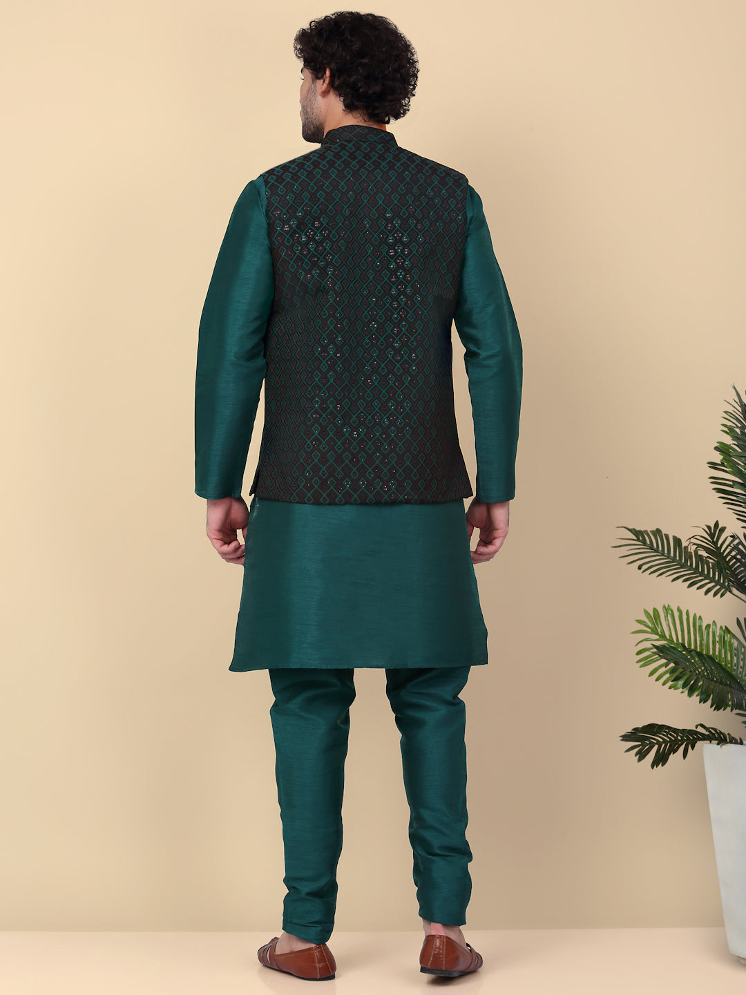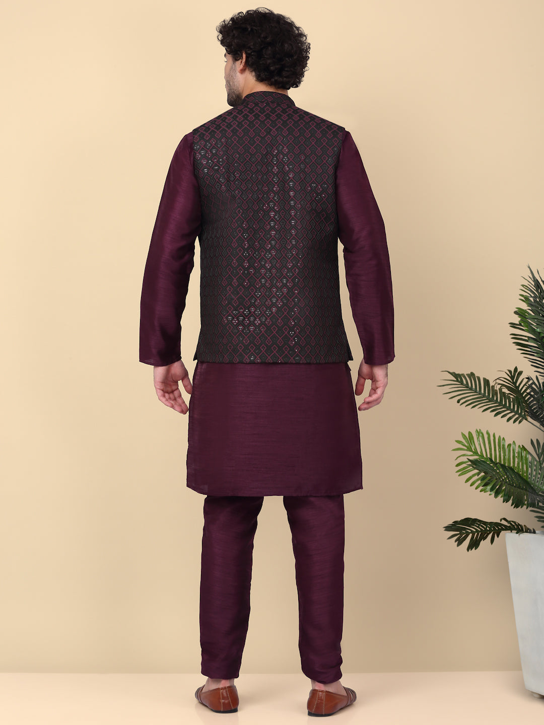 KRAFT INDIA Men's Silk Blend Solid Knee Length Kurta Churidar With Jacquard Embroidered Sequins Nehru Jacket Set