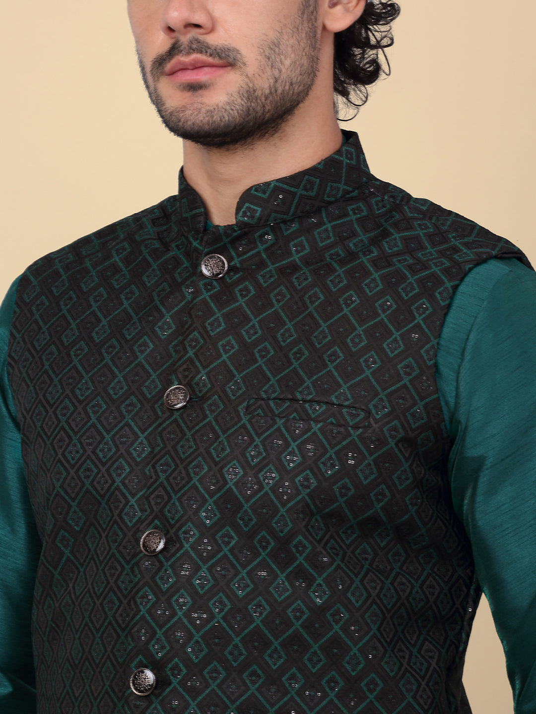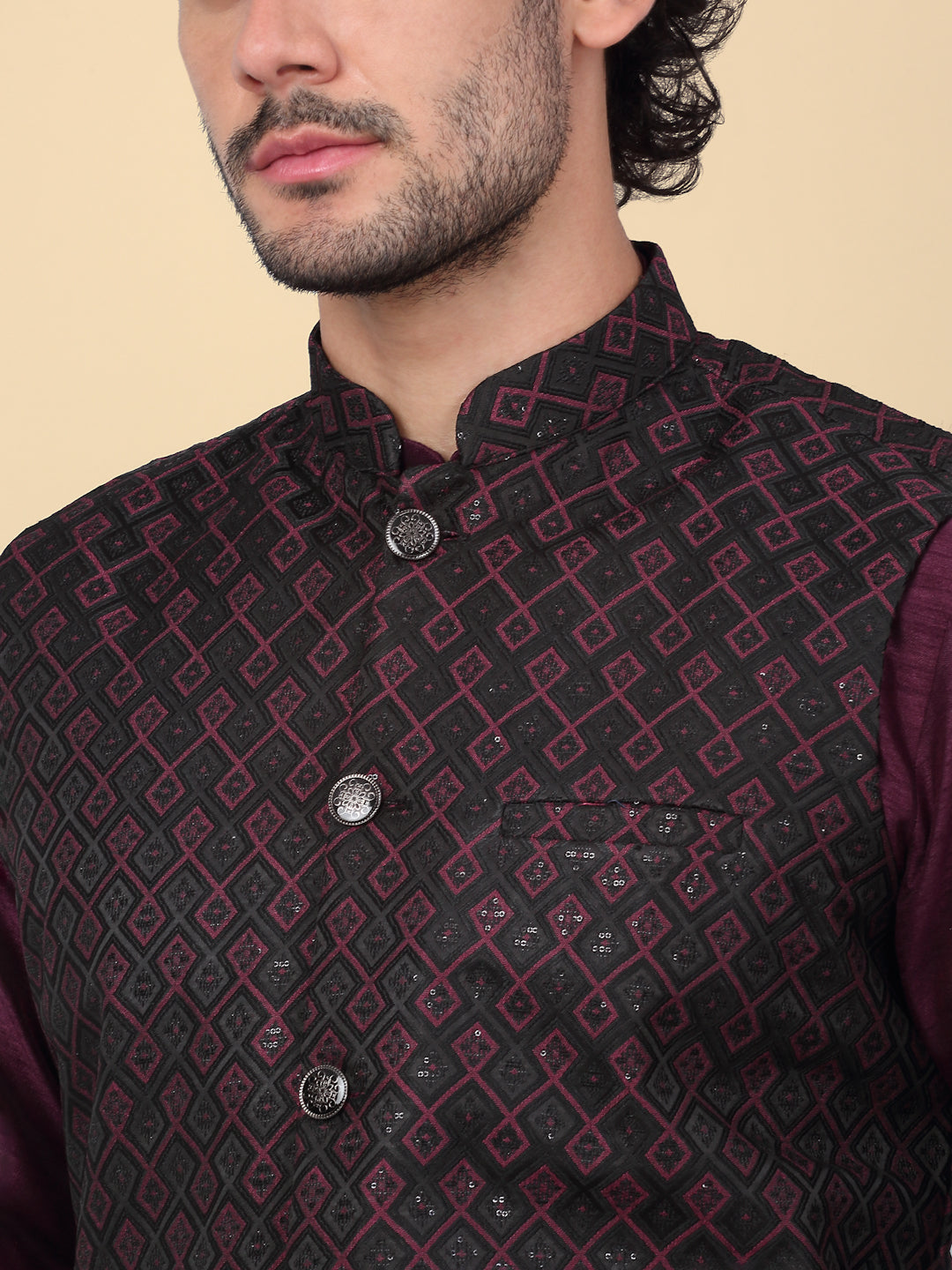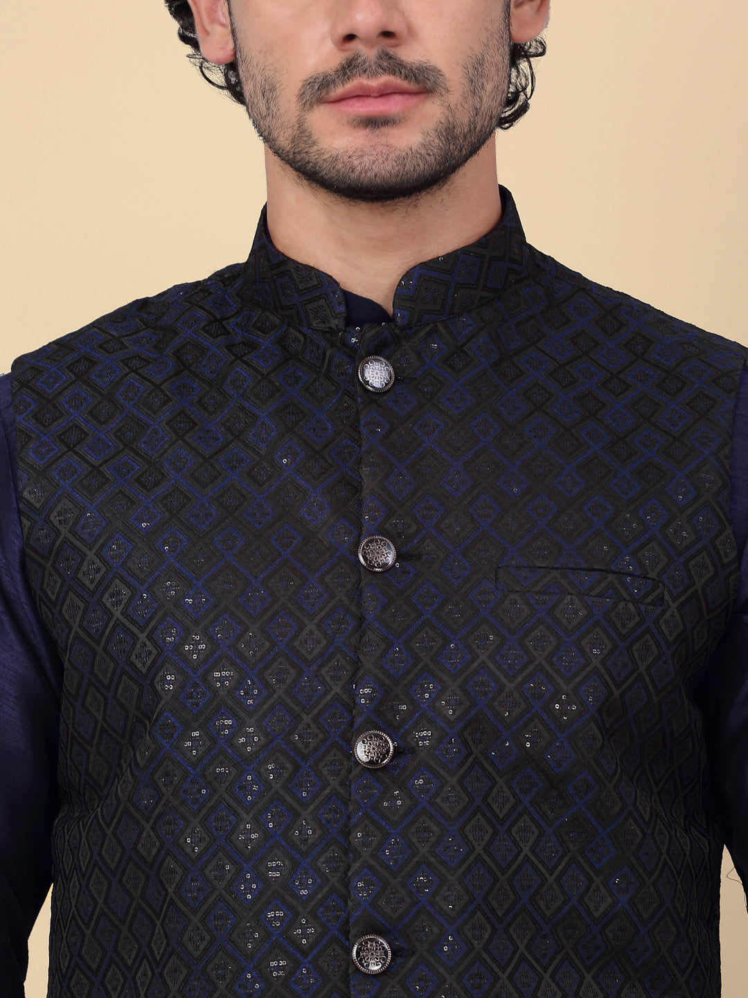 KRAFT INDIA Men's Silk Blend Solid Knee Length Kurta Churidar With Jacquard Embroidered Sequins Nehru Jacket Set
