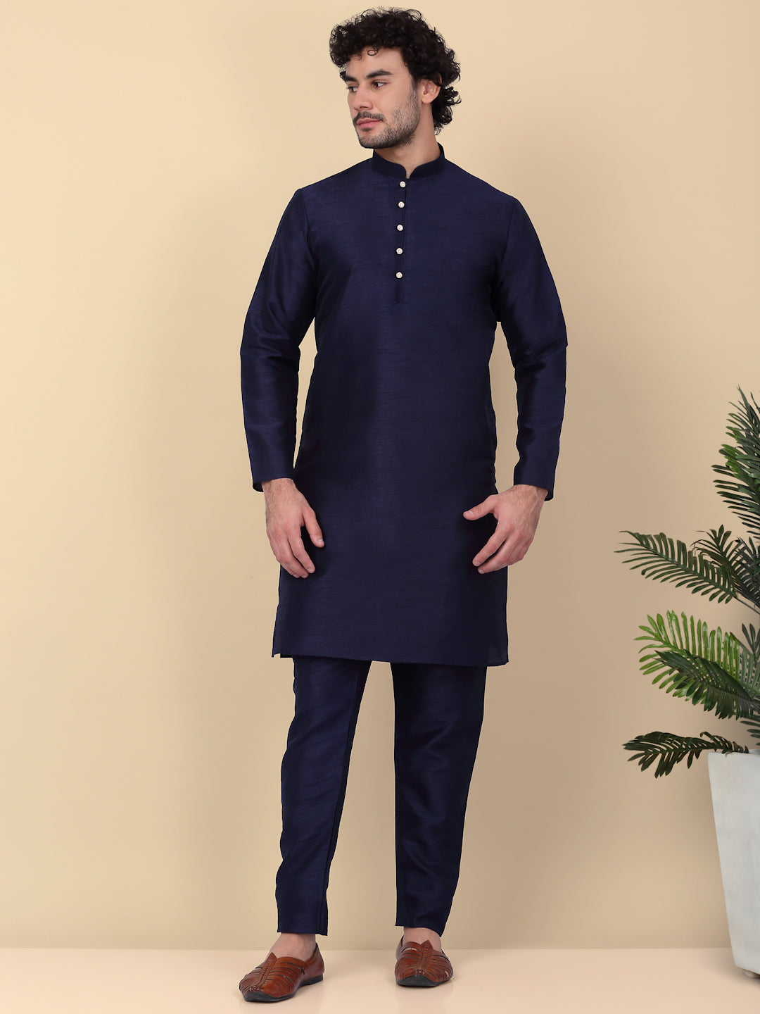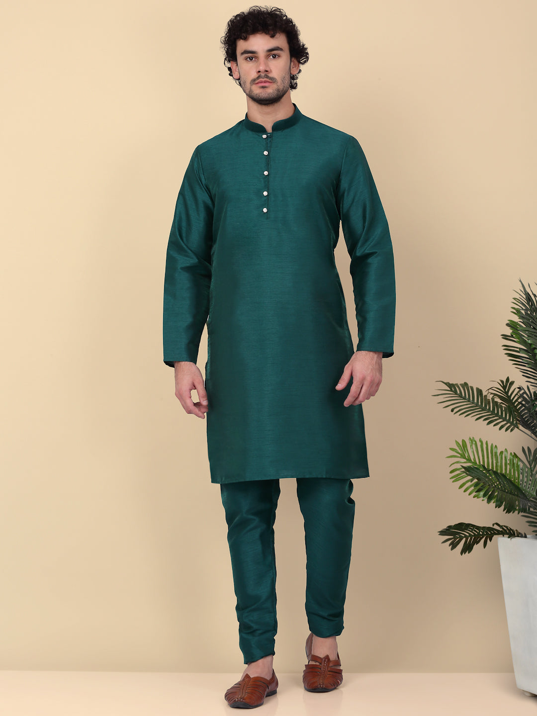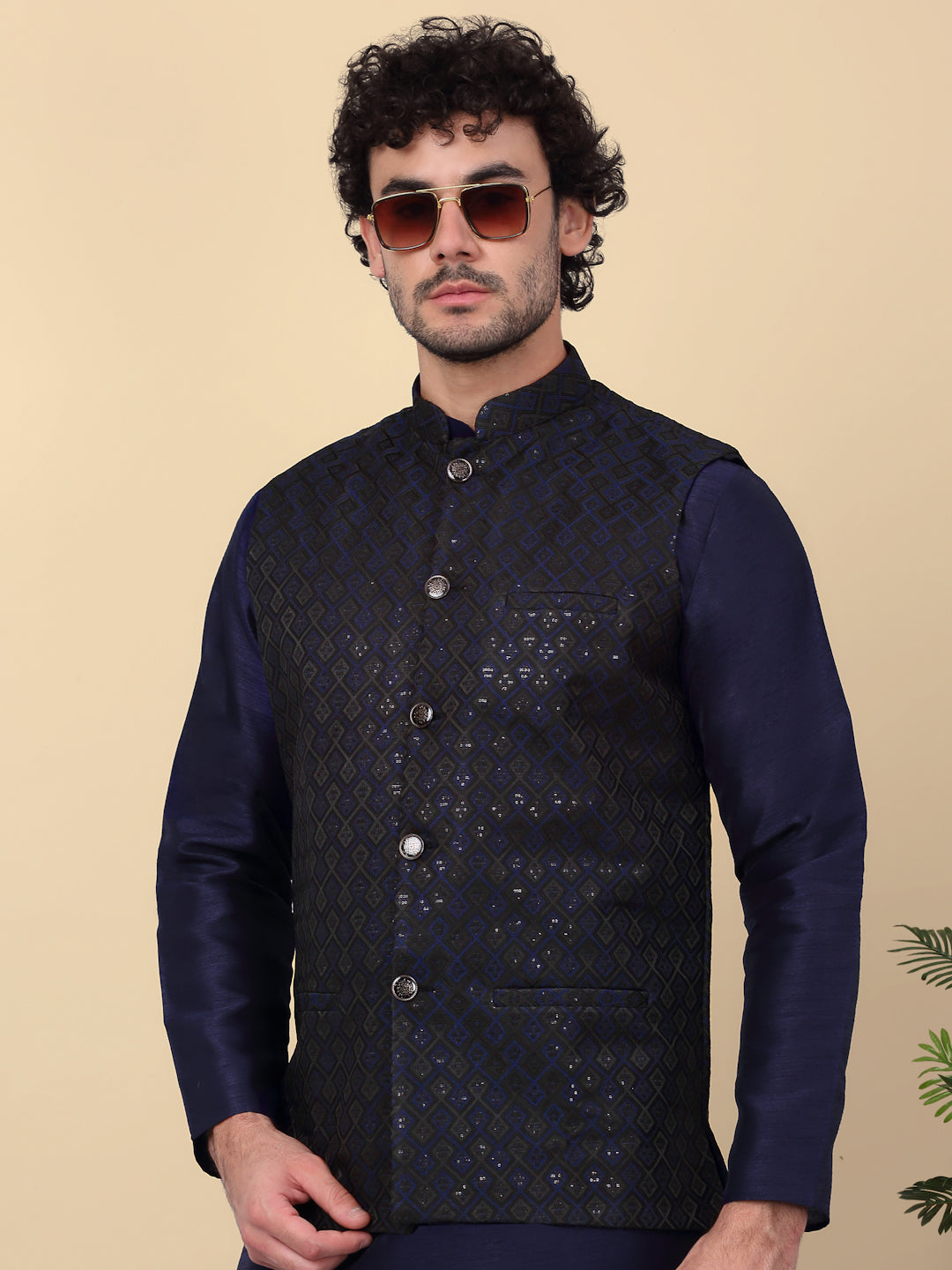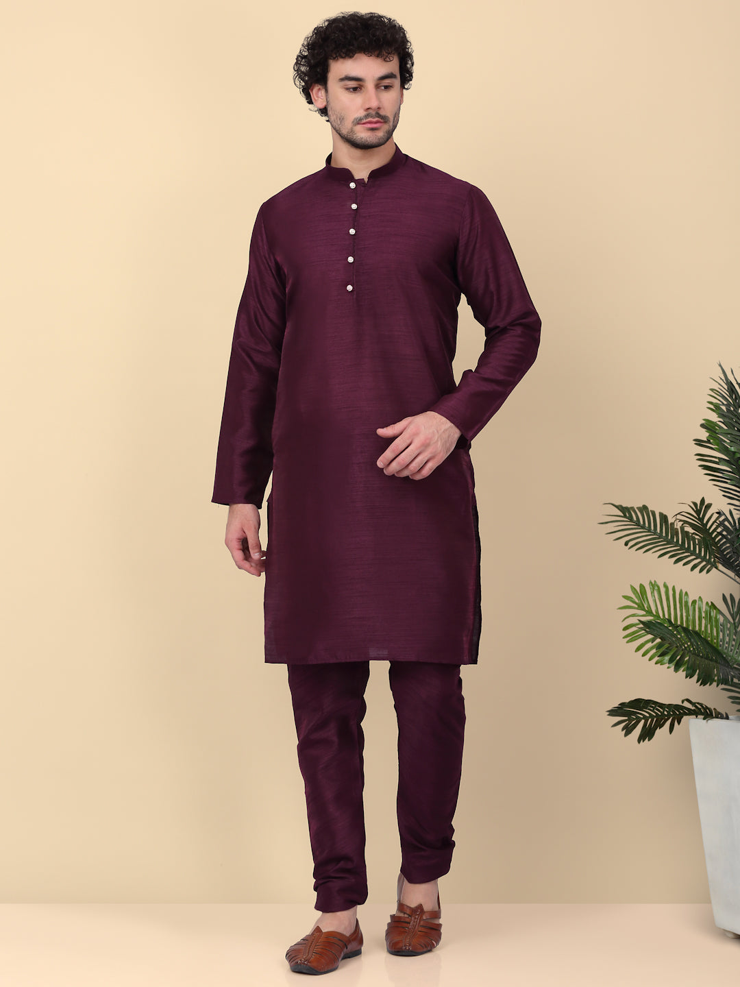 KRAFT INDIA Men's Silk Blend Solid Knee Length Kurta Churidar With Jacquard Embroidered Sequins Nehru Jacket Set