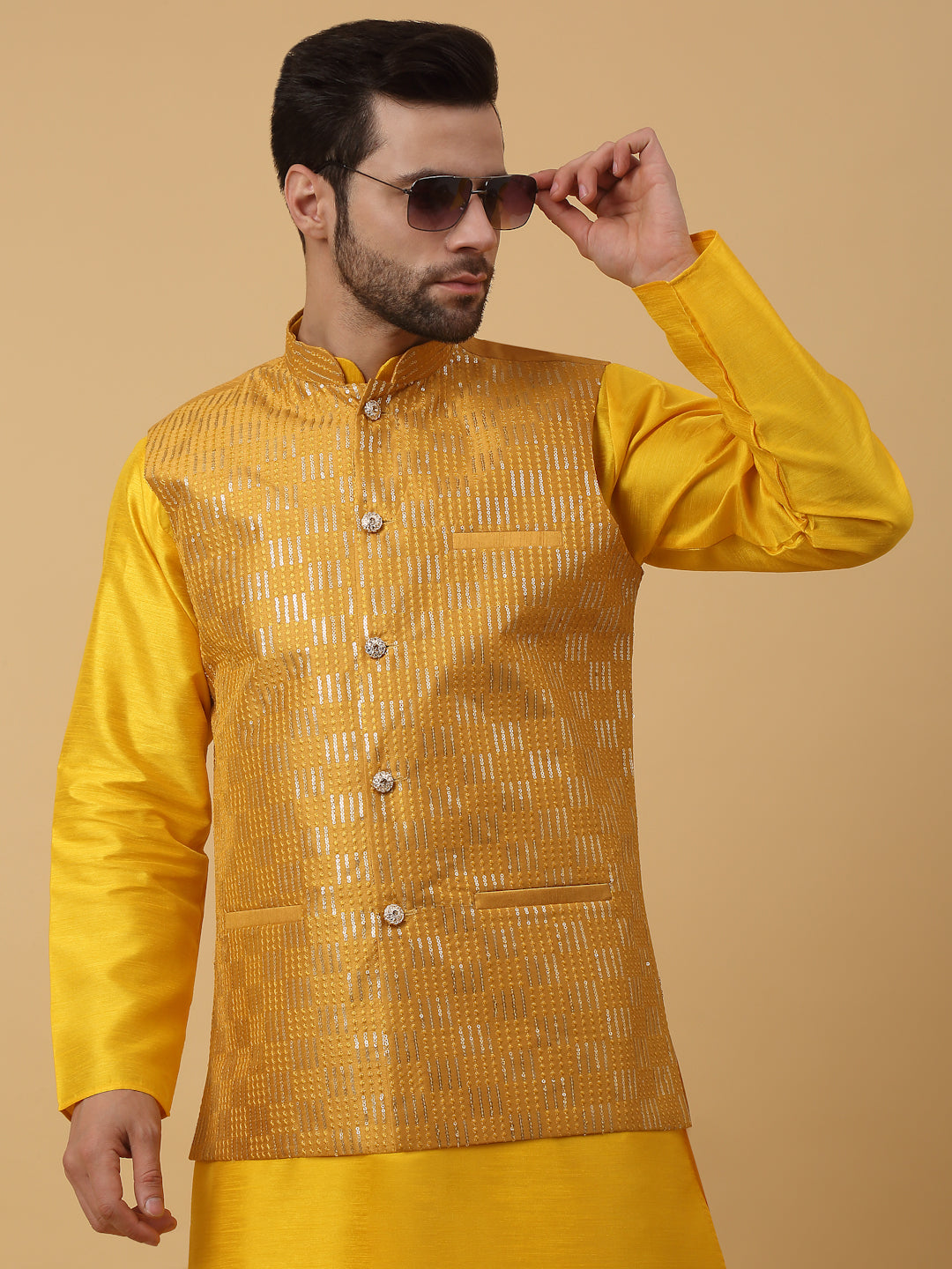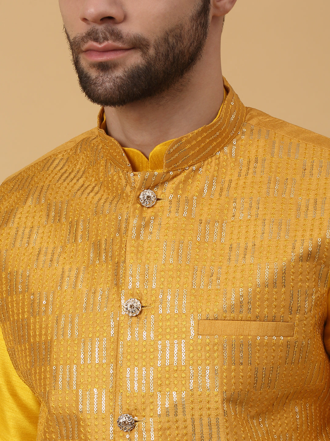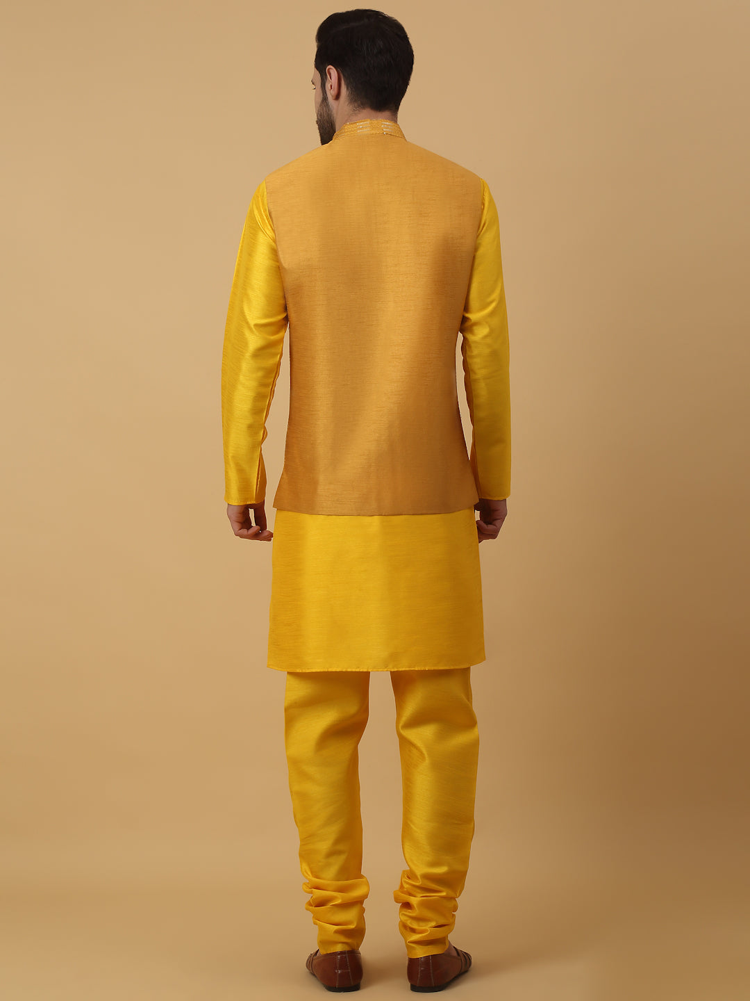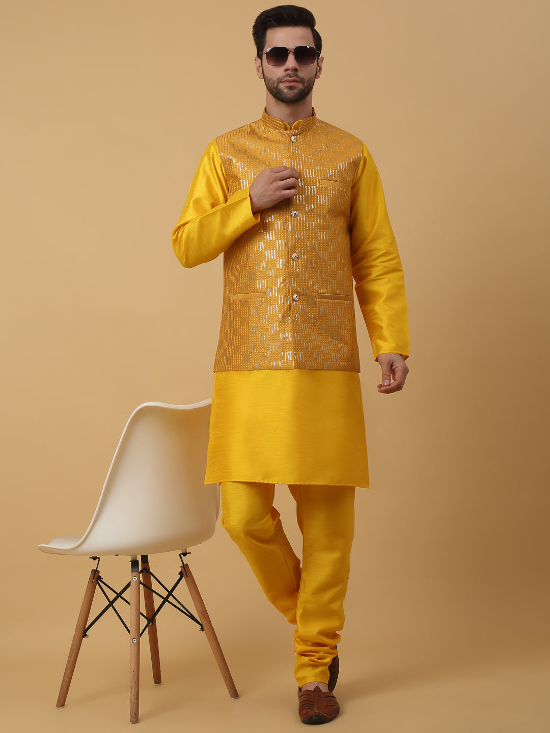 KRAFT INDIA Men's Silk Blend Yellow Kurta, Churidar With Cotton Silk Sequenced Embroided Nehru Jacket set