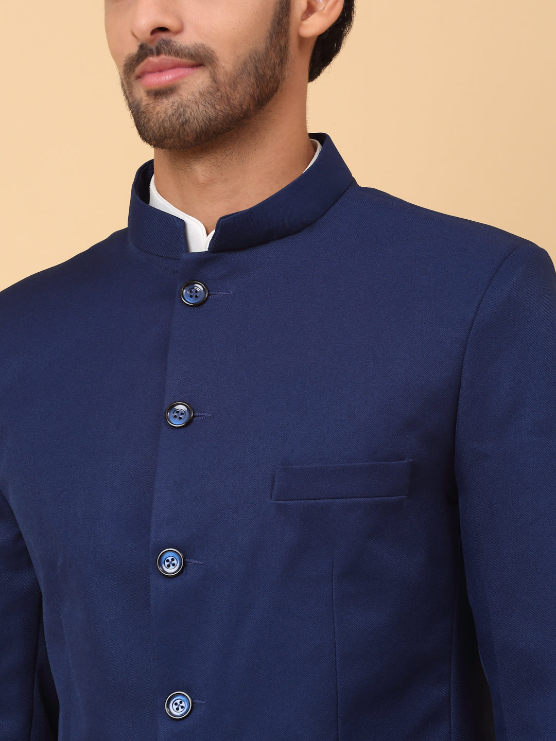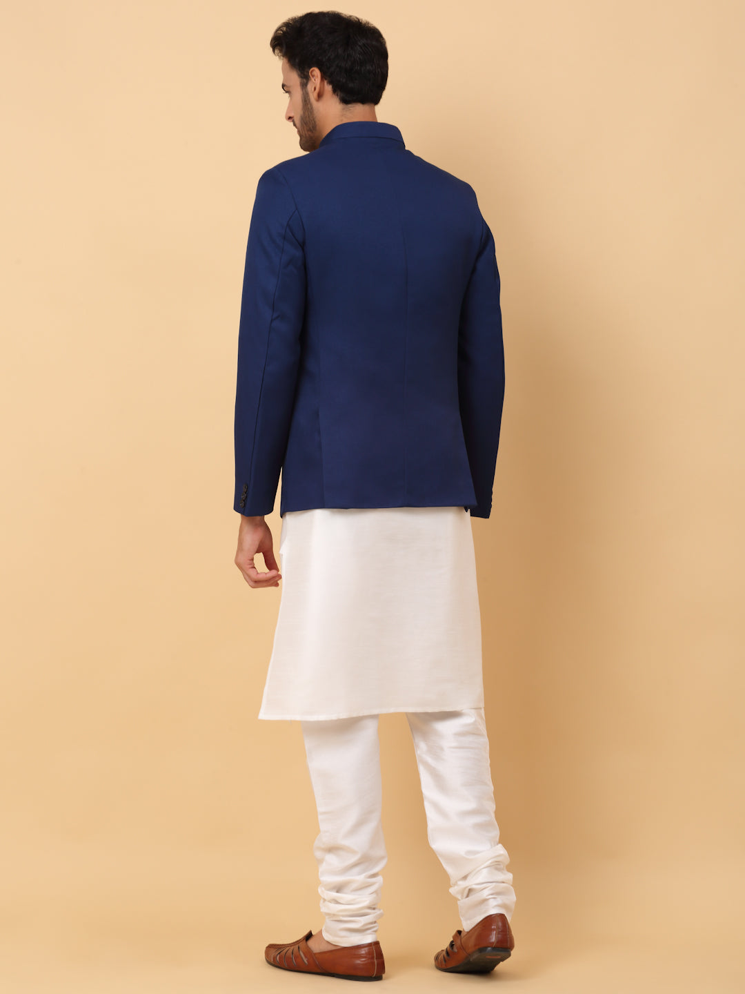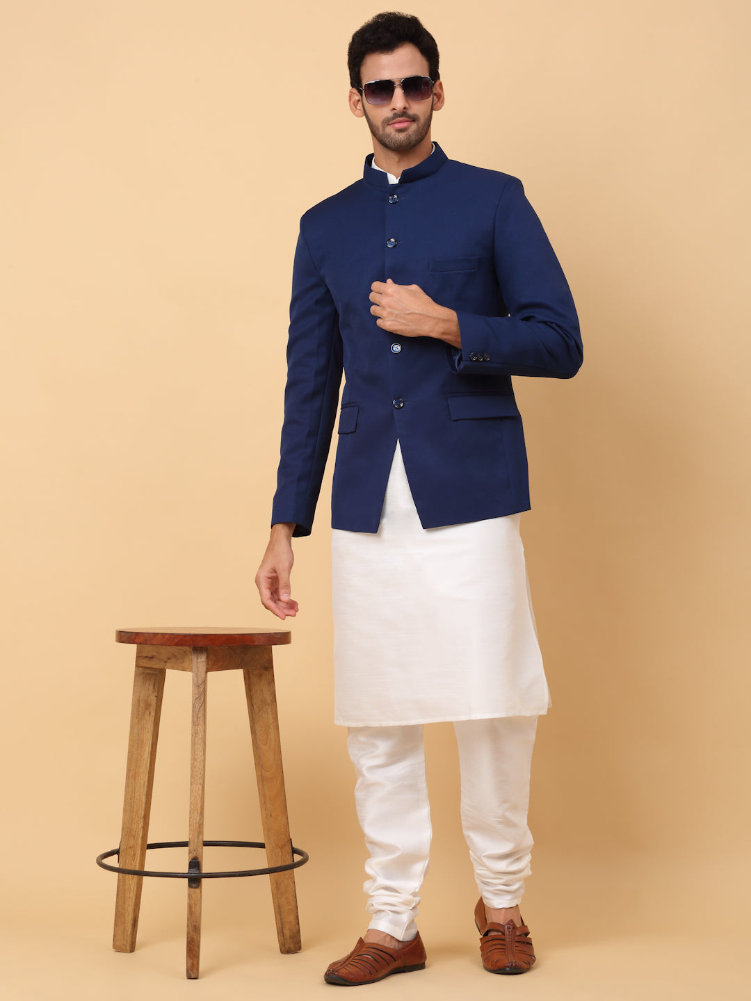Cream Solid Kurta & Churidar with Bandhgala Coat. The solid straight knee-length kurta has a mandarin collar, long sleeves, side pockets, straight hem, loops button closure,  and side slits, with drawstring closure Cream churidar. Twill Solid regular-fit blazer, has a mandarin collar, long sleeves, single-breasted, two pockets, one welt pocket, and a double-vented back hem.