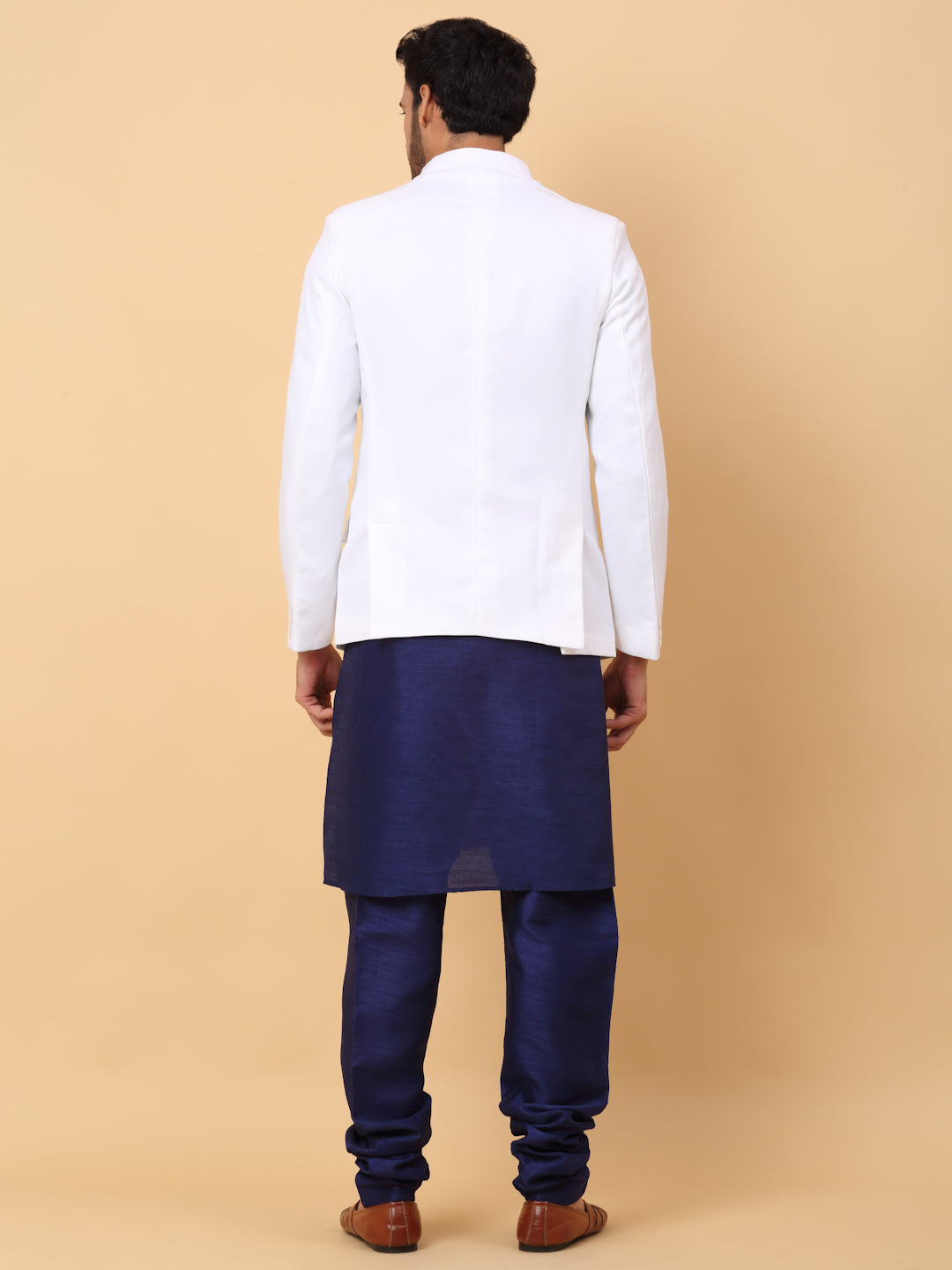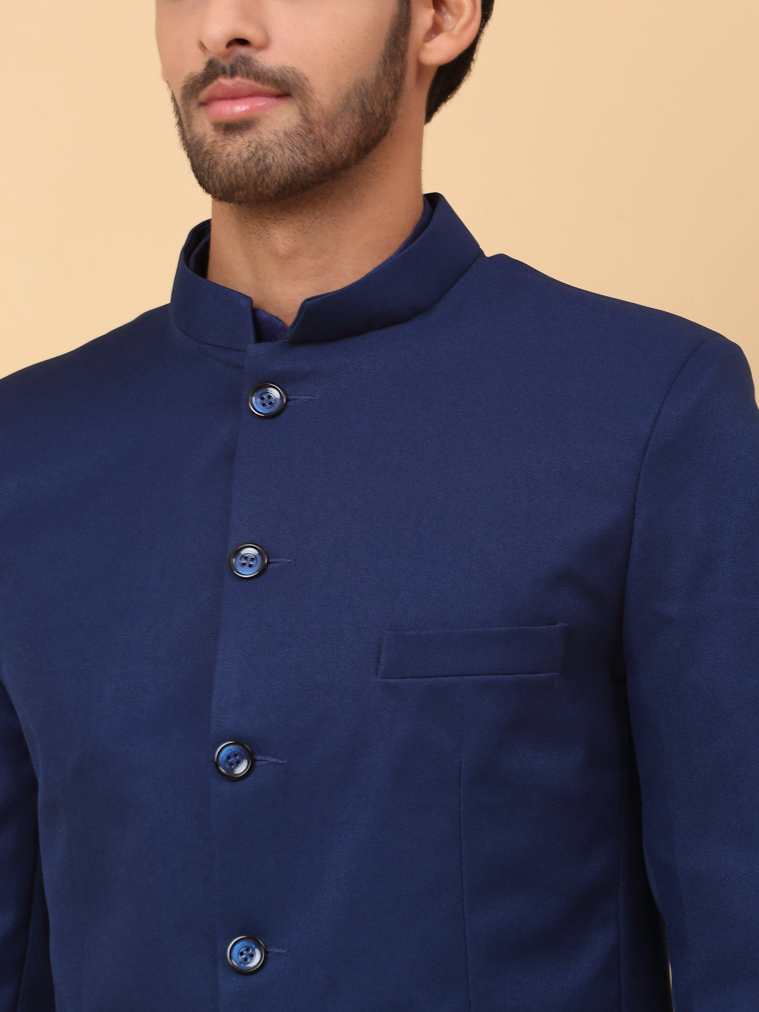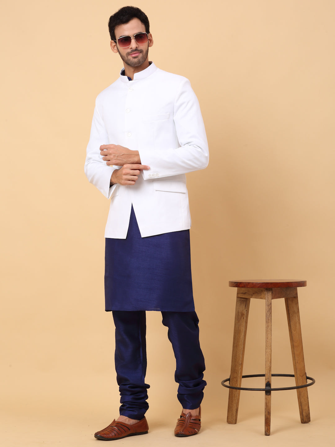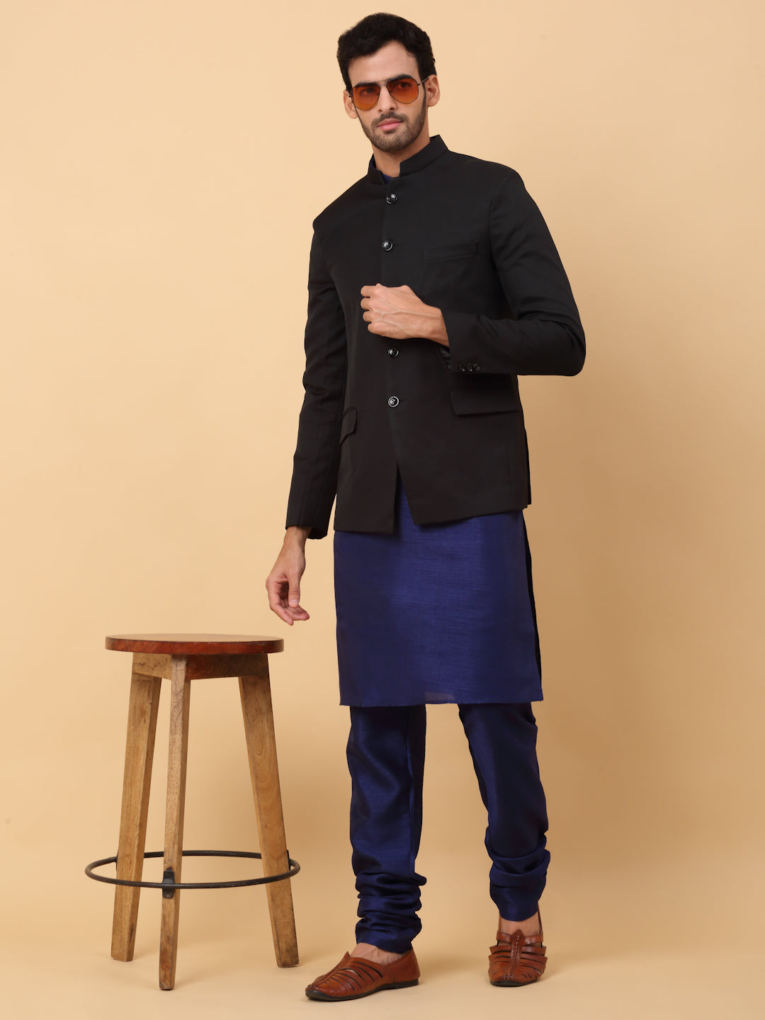 Navy Blue Solid Kurta & Churidar with Bandhgala Coat. The solid straight knee-length kurta has a mandarin collar, long sleeves, side pockets, straight hem, loops button closure, and side slits, with drawstring closure Navy Blue churidar. Twill Solid regular-fit blazer, has a mandarin collar, long sleeves, single-breasted, two pockets, one welt pocket, and a double-vented back hem.