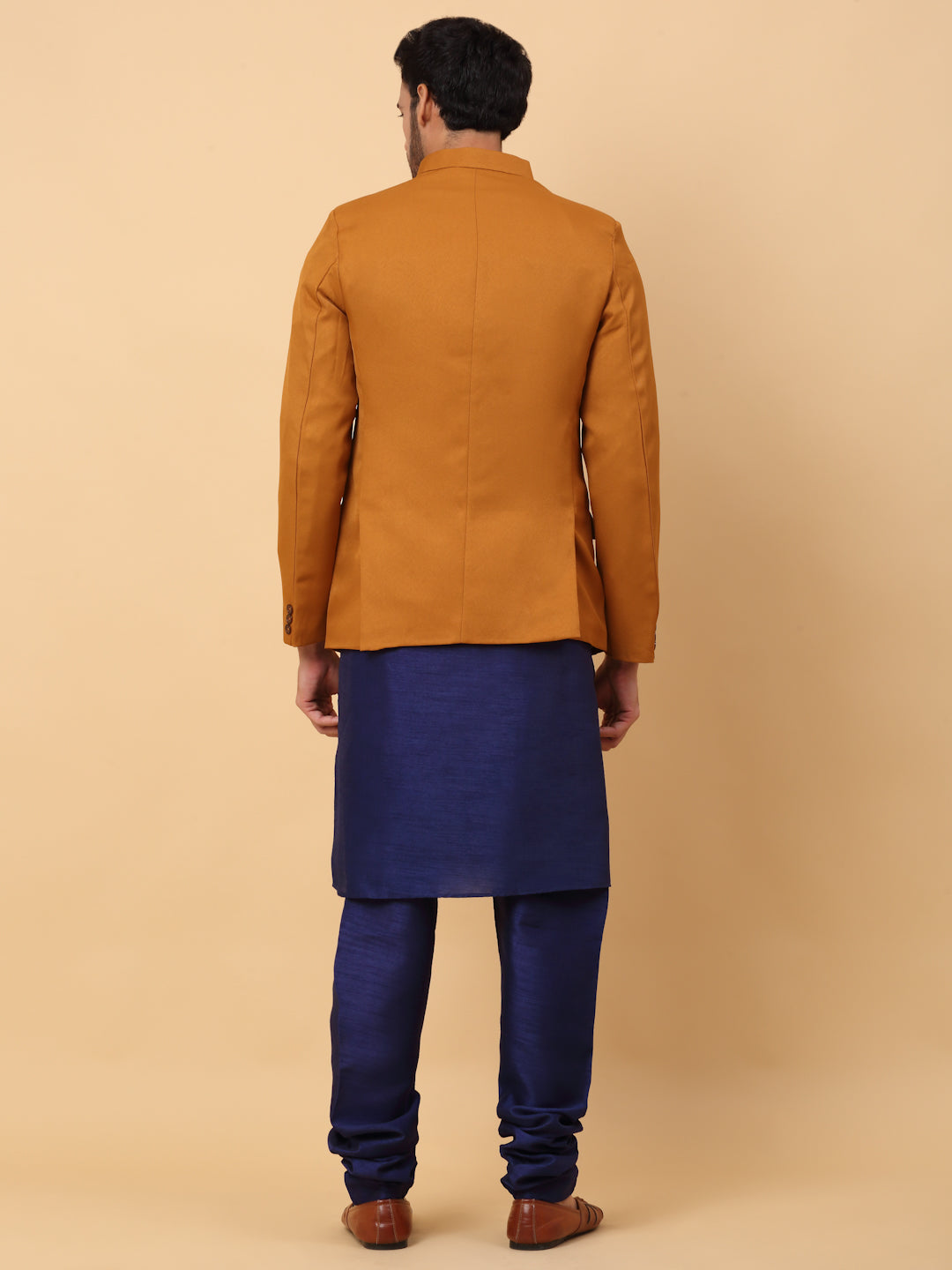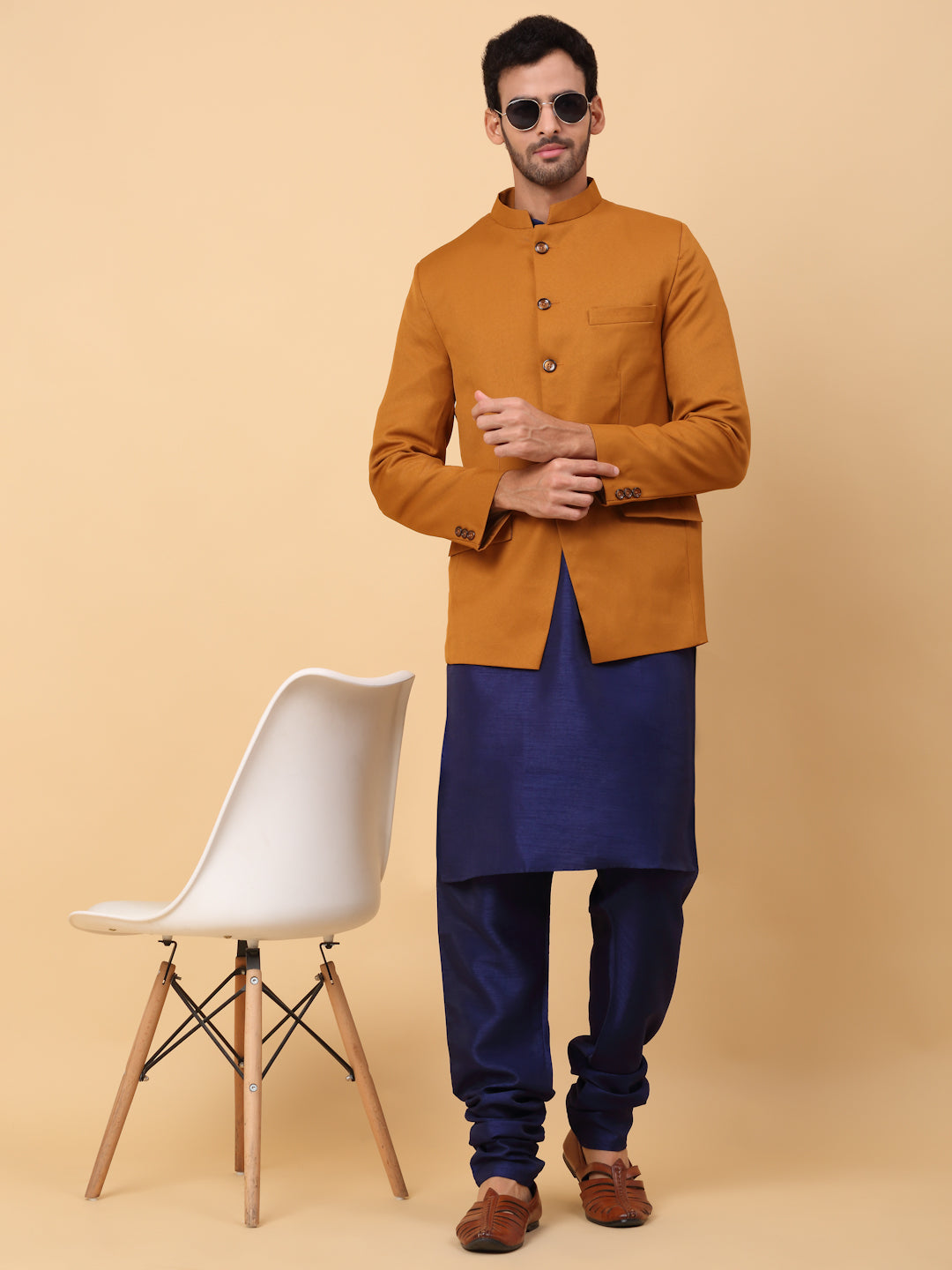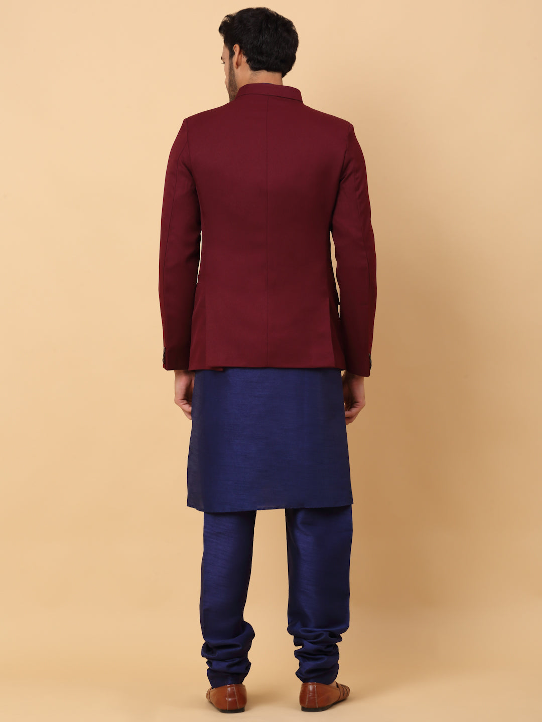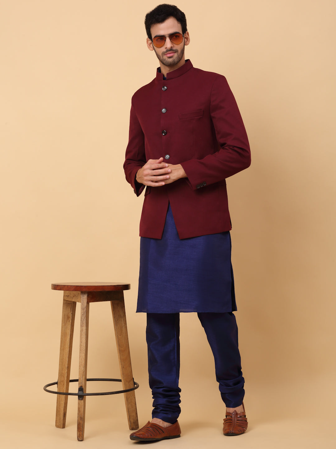 Navy Blue Solid Kurta & Churidar with Bandhgala Coat. The solid straight knee-length kurta has a mandarin collar, long sleeves, side pockets, straight hem, loops button closure, and side slits, with drawstring closure Navy Blue churidar. Twill Solid regular-fit blazer, has a mandarin collar, long sleeves, single-breasted, two pockets, one welt pocket, and a double-vented back hem.