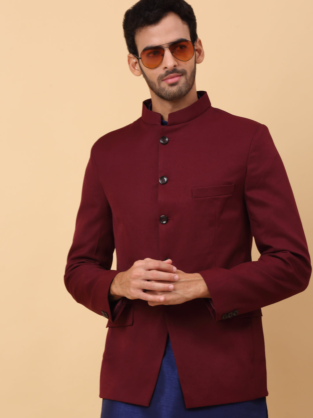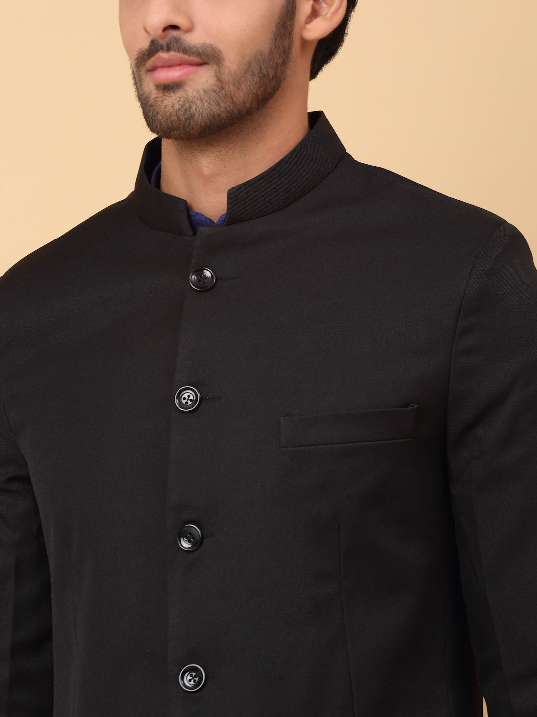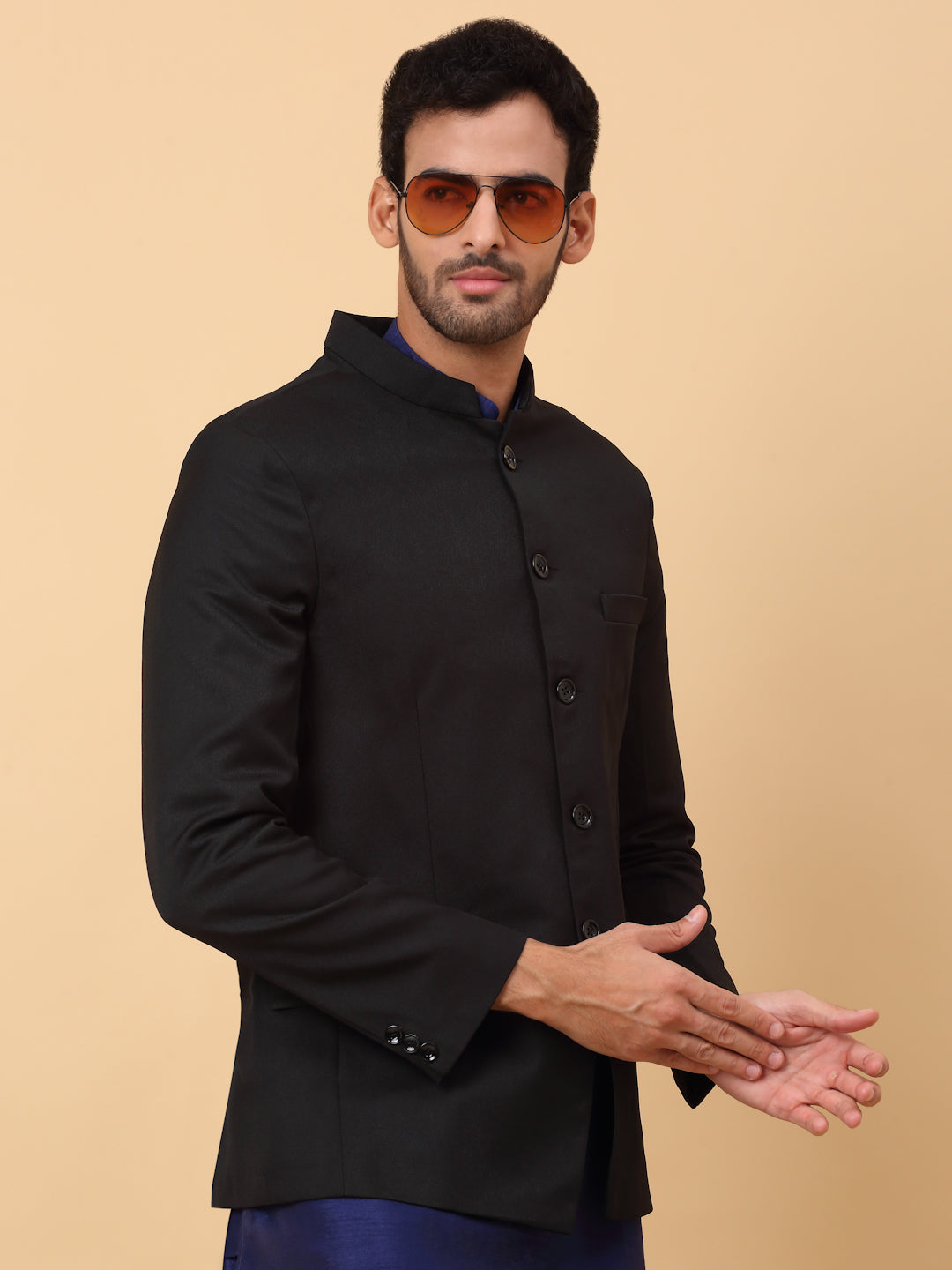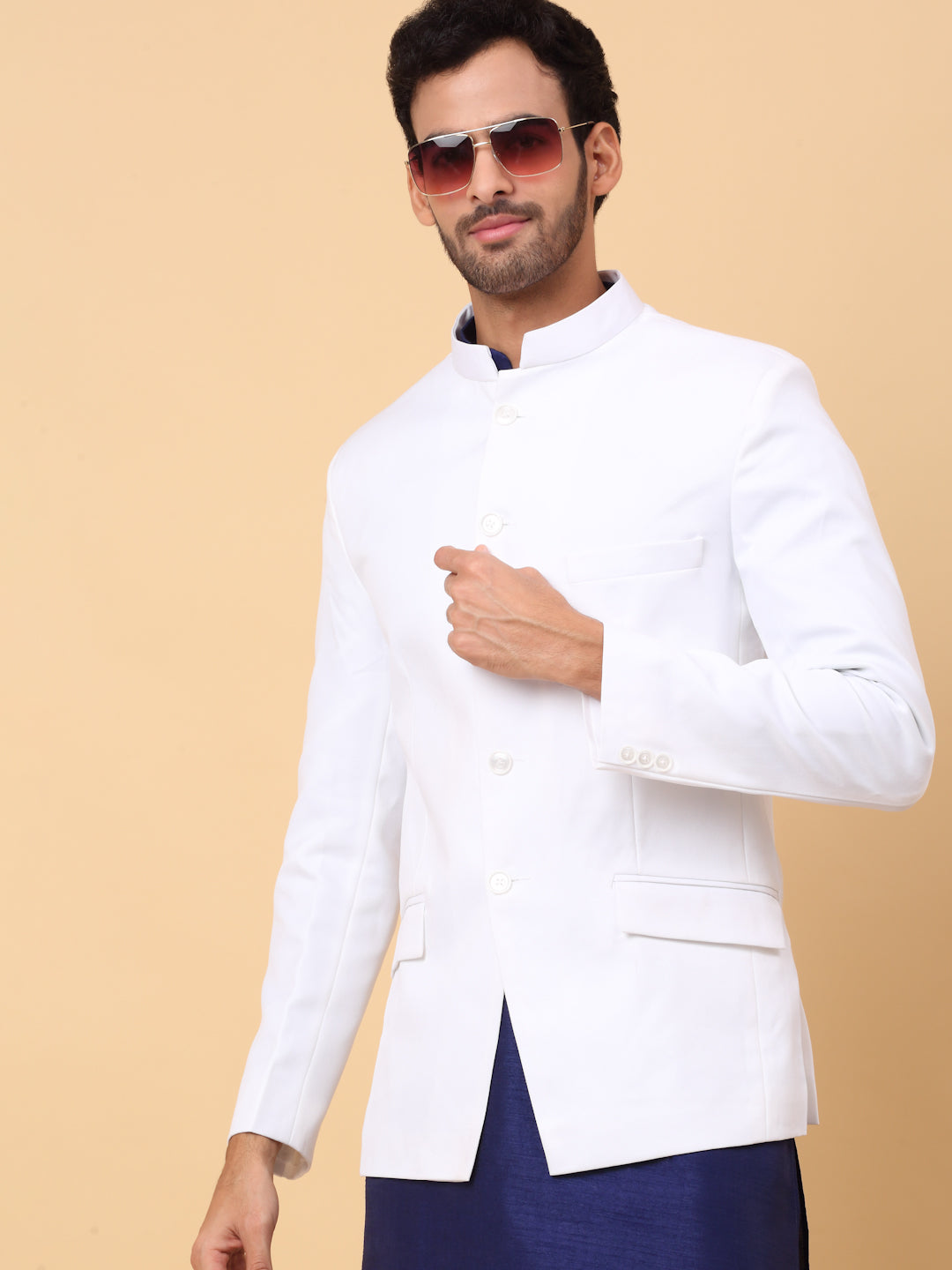Navy Blue Solid Kurta & Churidar with Bandhgala Coat. The solid straight knee-length kurta has a mandarin collar, long sleeves, side pockets, straight hem, loops button closure, and side slits, with drawstring closure Navy Blue churidar. Twill Solid regular-fit blazer, has a mandarin collar, long sleeves, single-breasted, two pockets, one welt pocket, and a double-vented back hem.