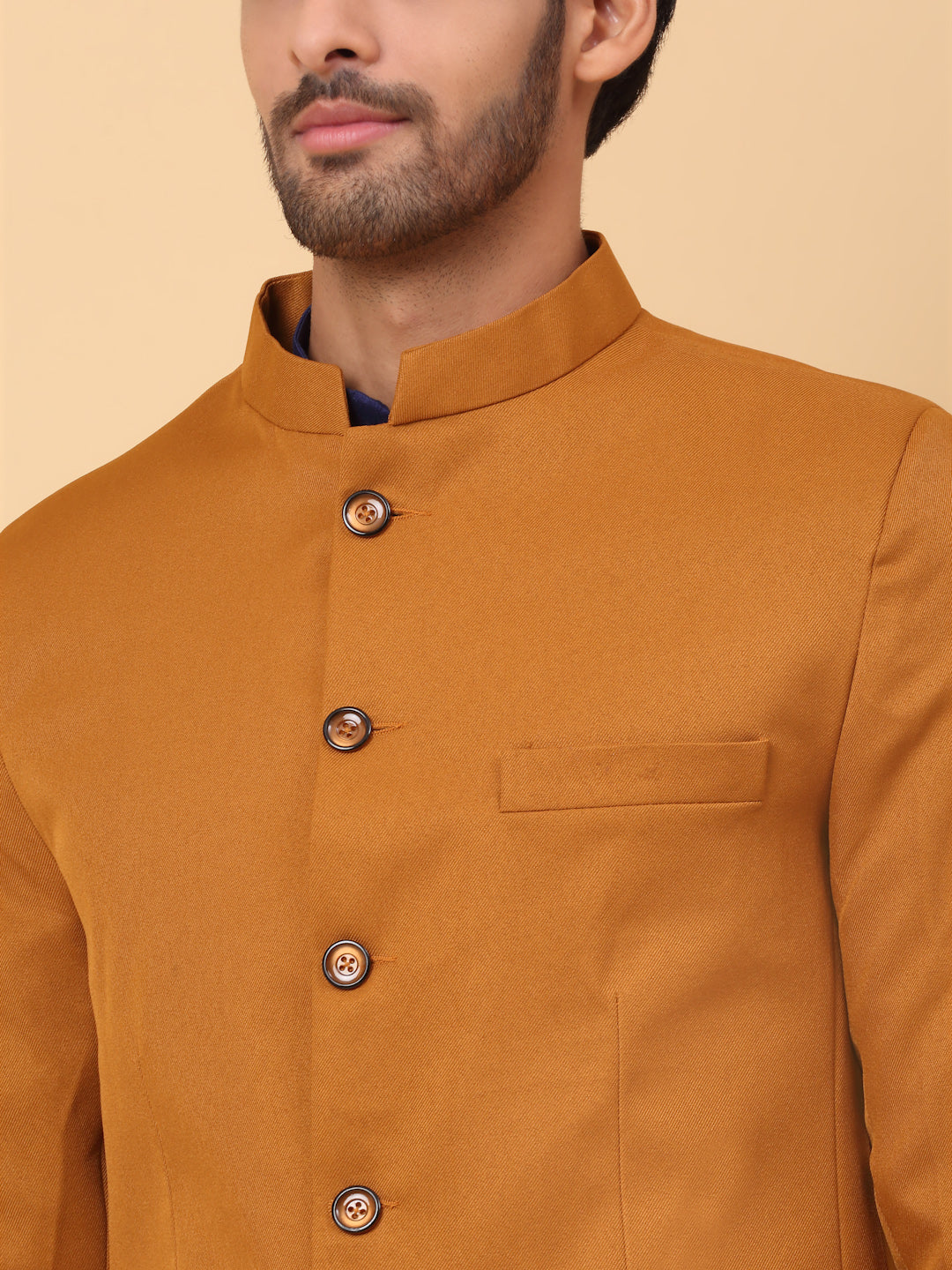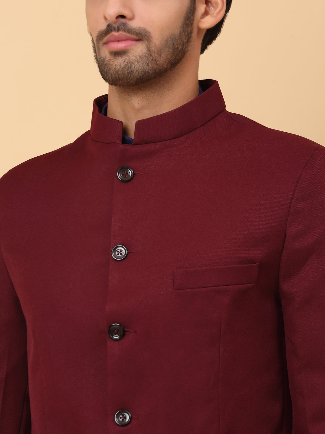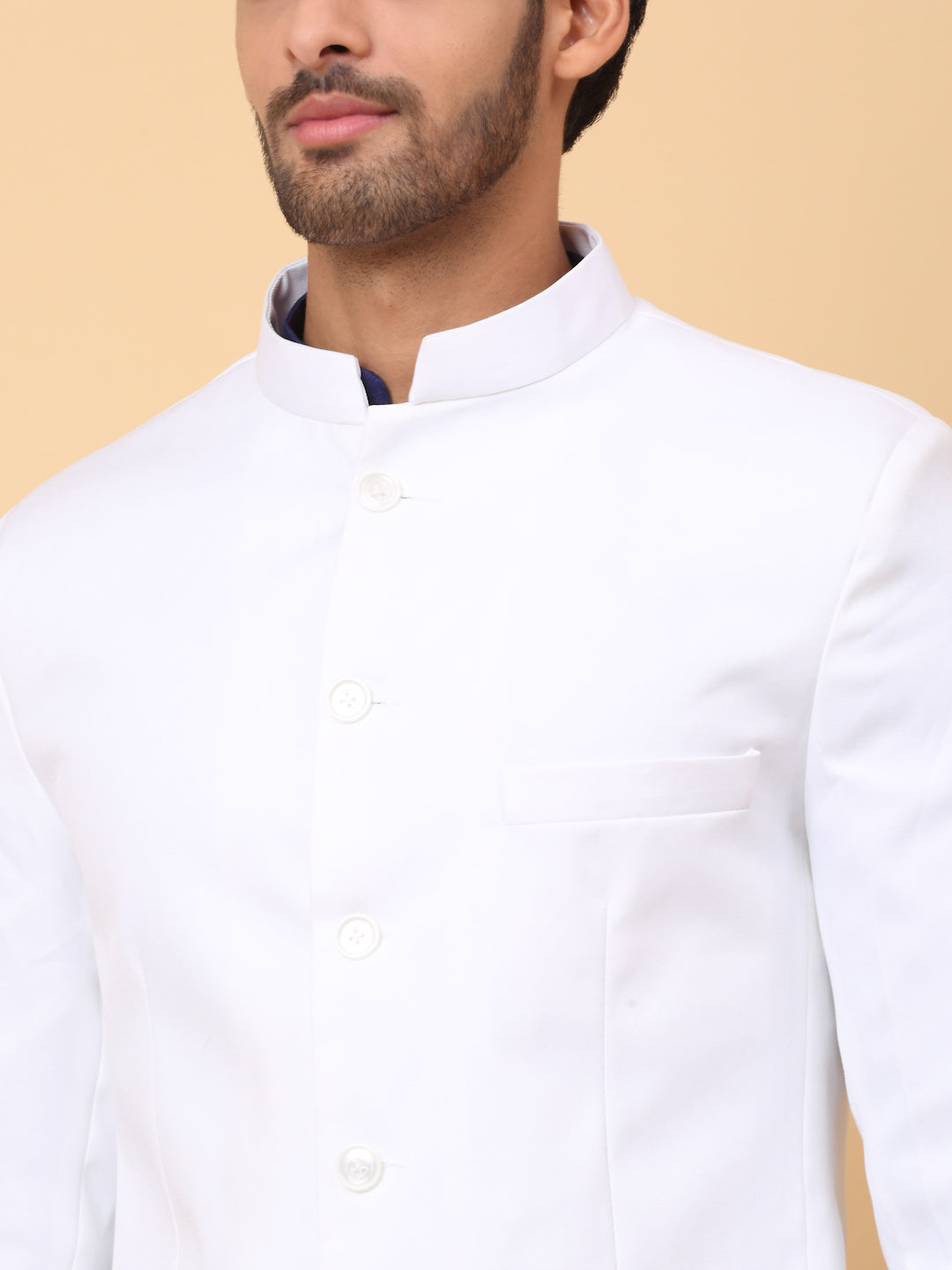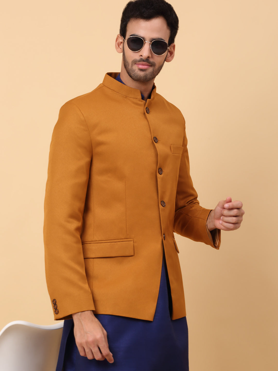 Navy Blue Solid Kurta & Churidar with Bandhgala Coat. The solid straight knee-length kurta has a mandarin collar, long sleeves, side pockets, straight hem, loops button closure, and side slits, with drawstring closure Navy Blue churidar. Twill Solid regular-fit blazer, has a mandarin collar, long sleeves, single-breasted, two pockets, one welt pocket, and a double-vented back hem.